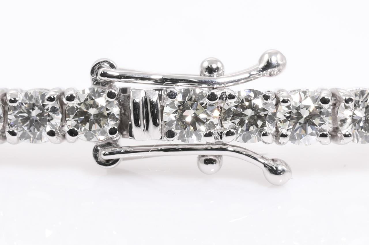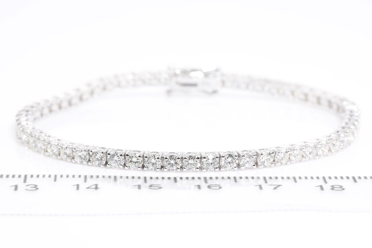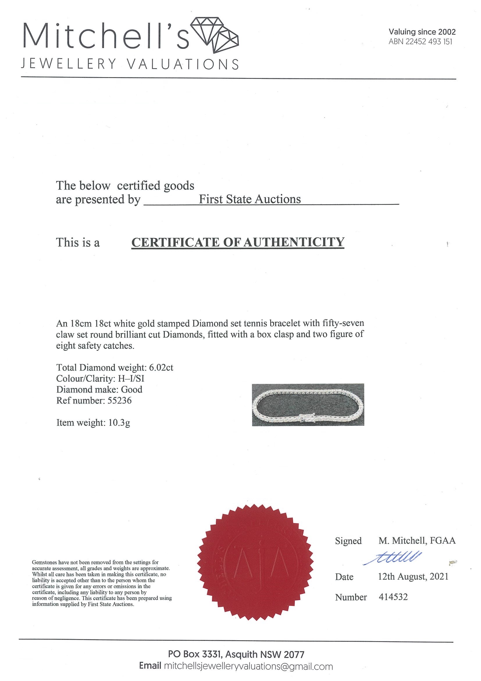 Diamond tennis bracelet with 57 round Diamonds totalling 6.02cts (Estimated grading: H-I SI). 18ct white gold. Length: 18cm. Weight: 10.3g. With certificate #414532. (New)