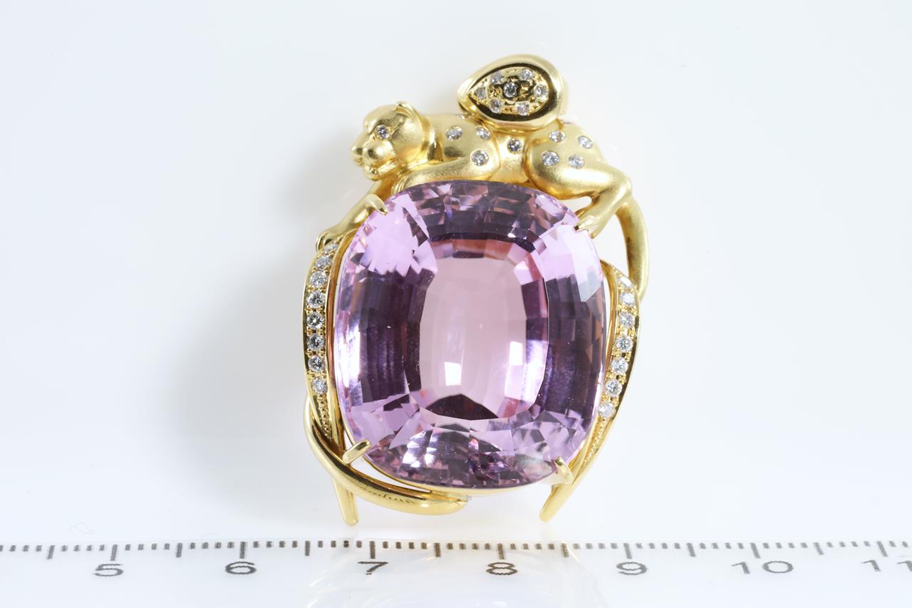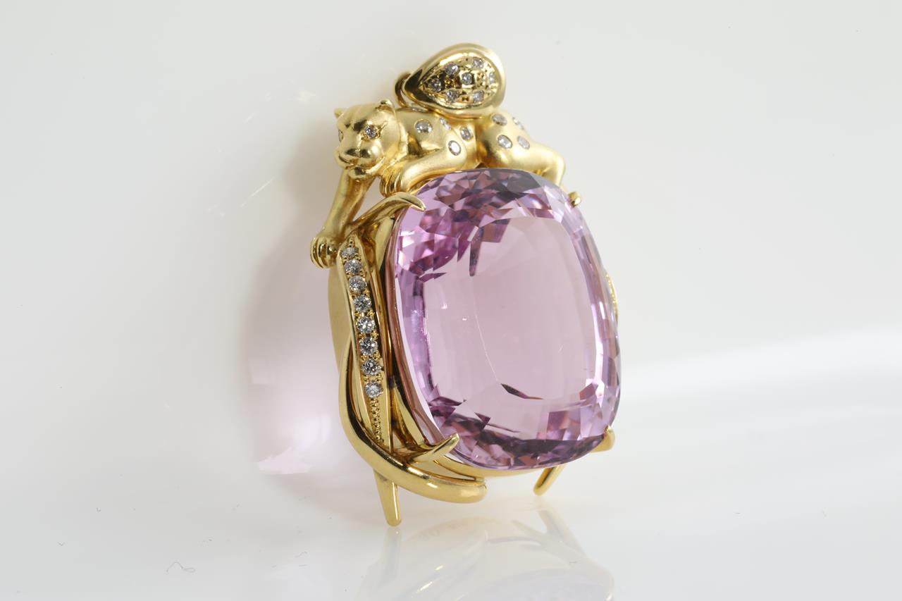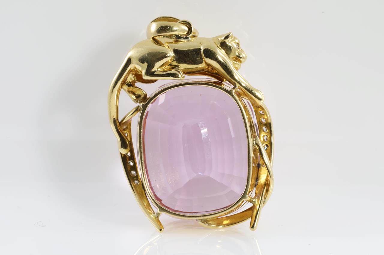 Kunzite and Diamond panther design pendant with cushion cut Kunzite of 60.80ct and round Diamonds totalling 0.40cts (Estimated grading: G-H VS). 18ct yellow gold. With certificate #413400. Weight: 29.2g (As New)