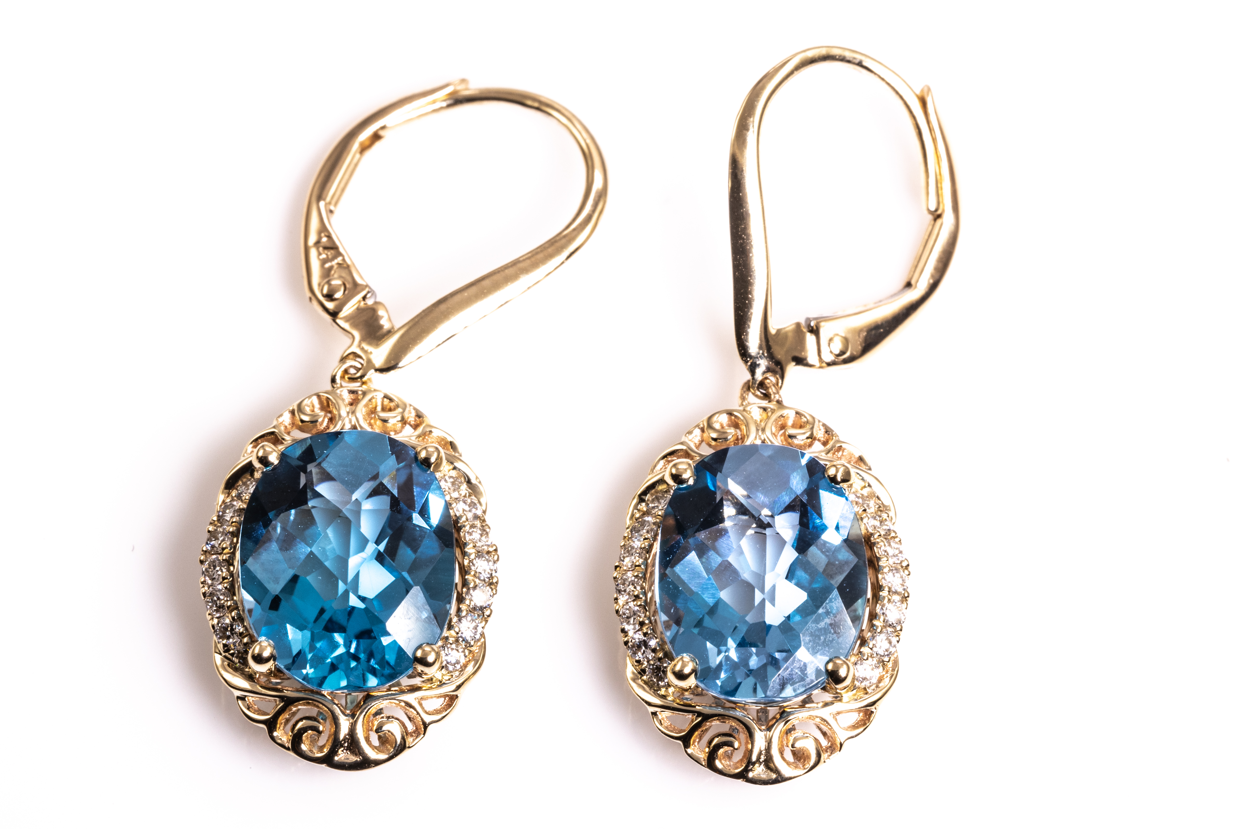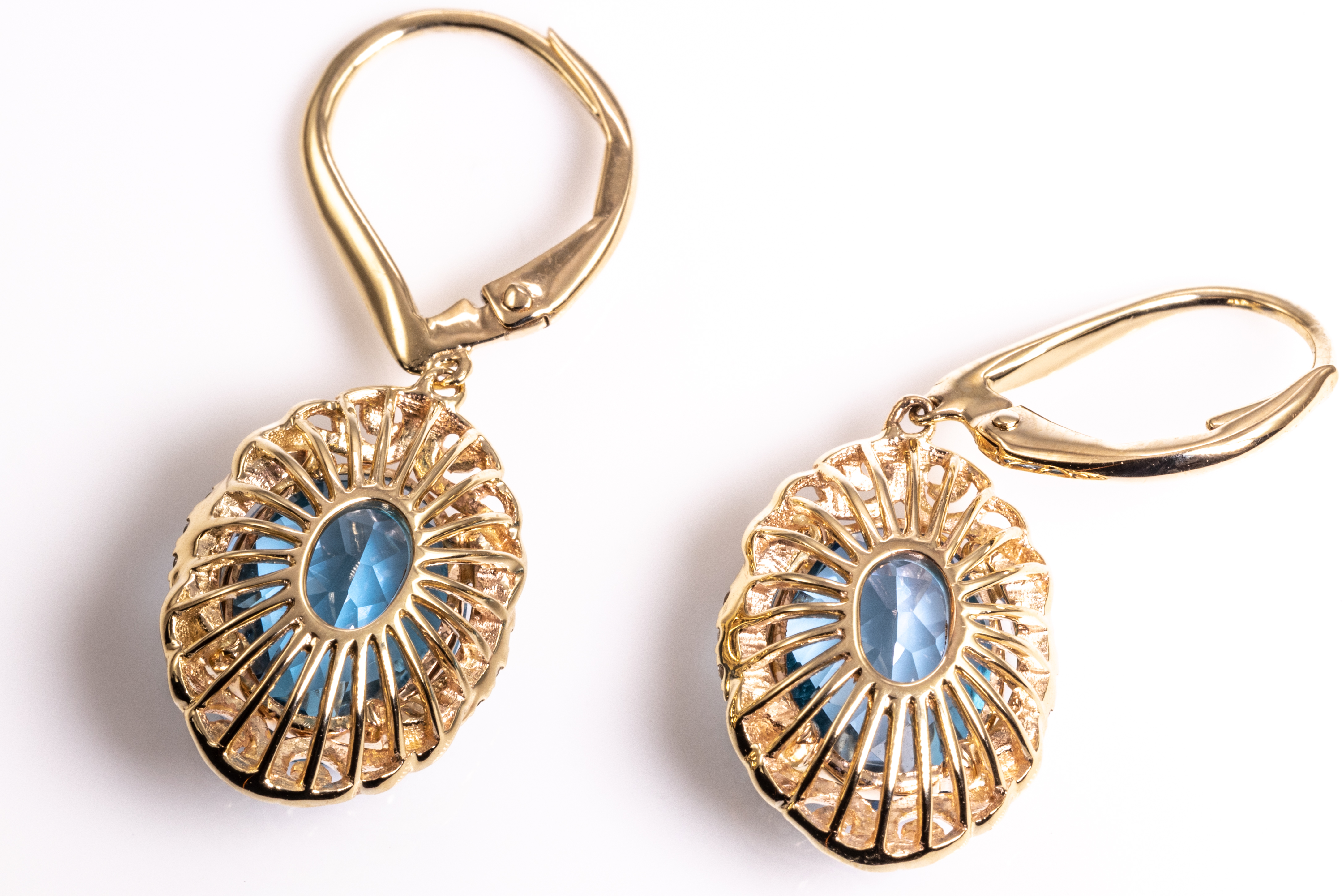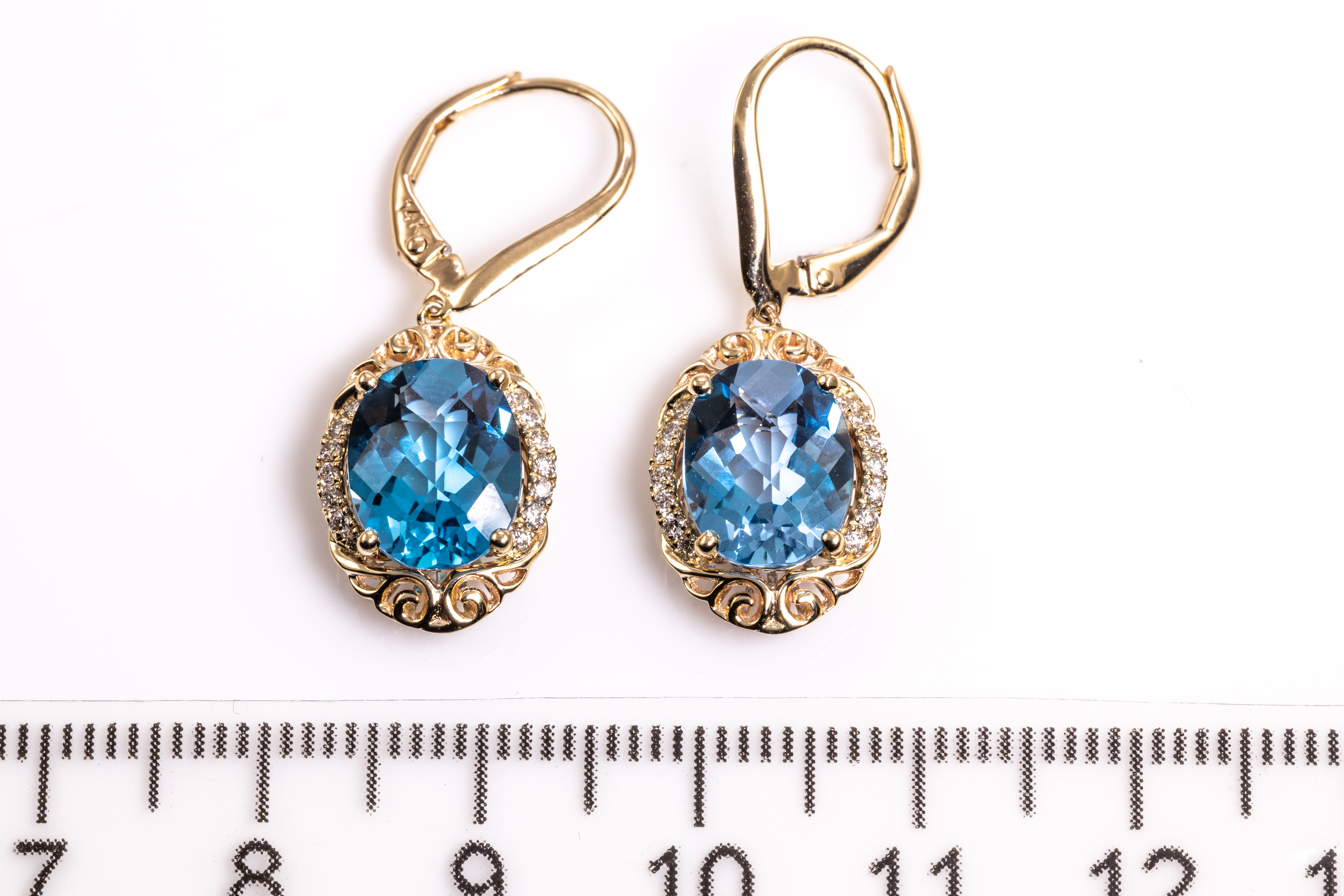Topaz and Diamond leverback earrings with oval blue Topaz totalling 6.10cts and round Diamond totalling 0.17cts. 14ct yellow gold. Weight: 4.3g. (New)