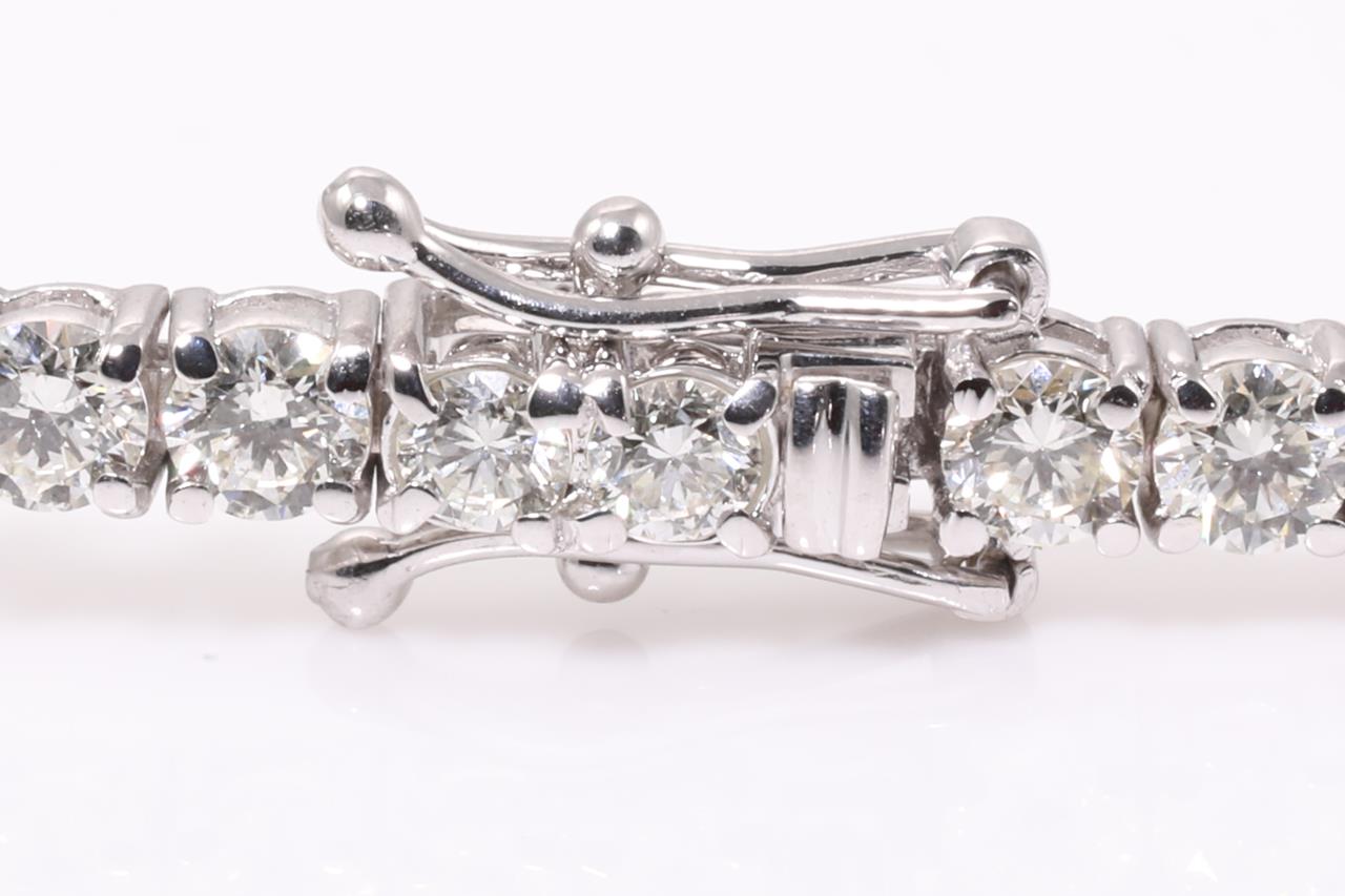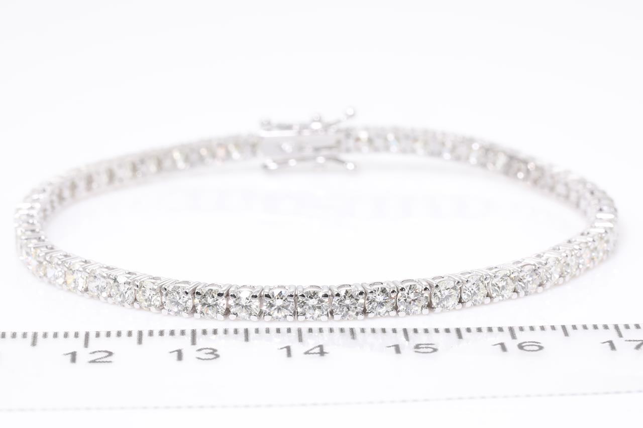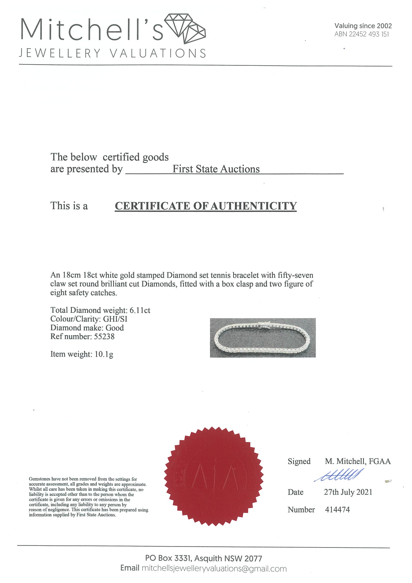 Diamond tennis bracelet with 57 round Diamonds totalling 6.11cts (Estimated grading: GHI SI). 18ct white gold. Length: 18cm. Weight: 10.1g. With certificate #414474. (New)