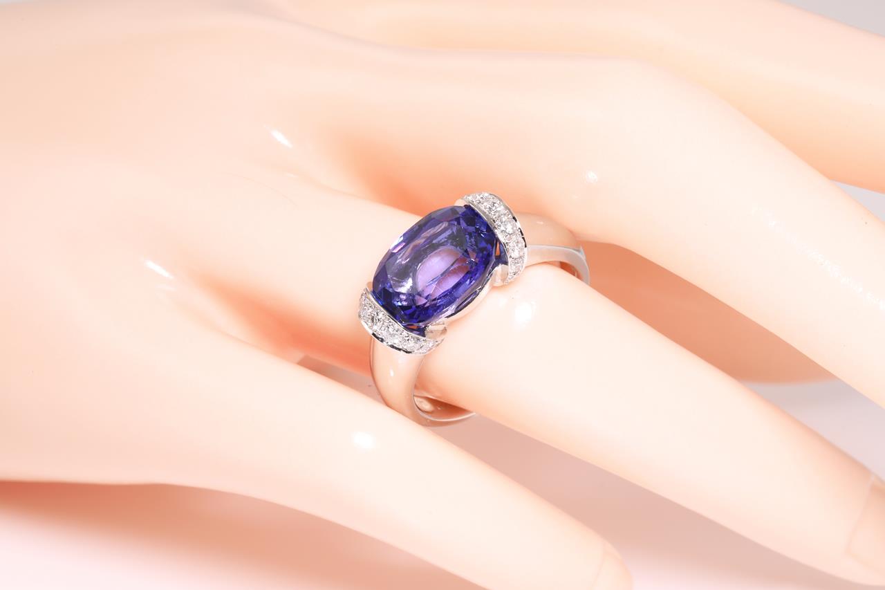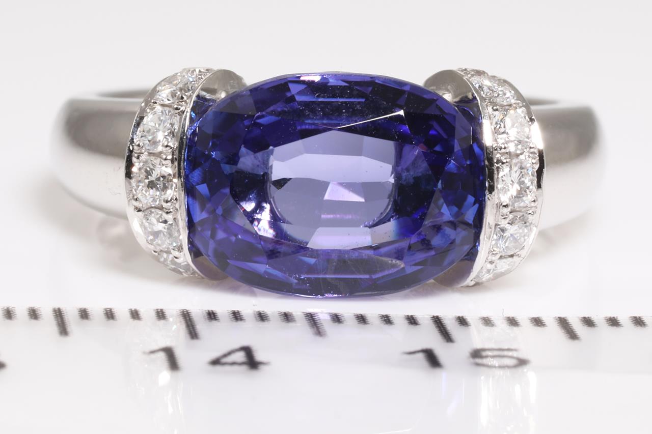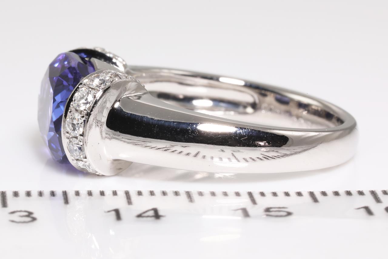 Tanzanite and Diamond ring with oval shape Tanzanite of 6.12ct and Diamonds totalling 0.35cts (Estimated grading: G VS-SI). Platinum. Ring size R - ring resizing is not recommended. Weight: 11.7g (Pre-owned)