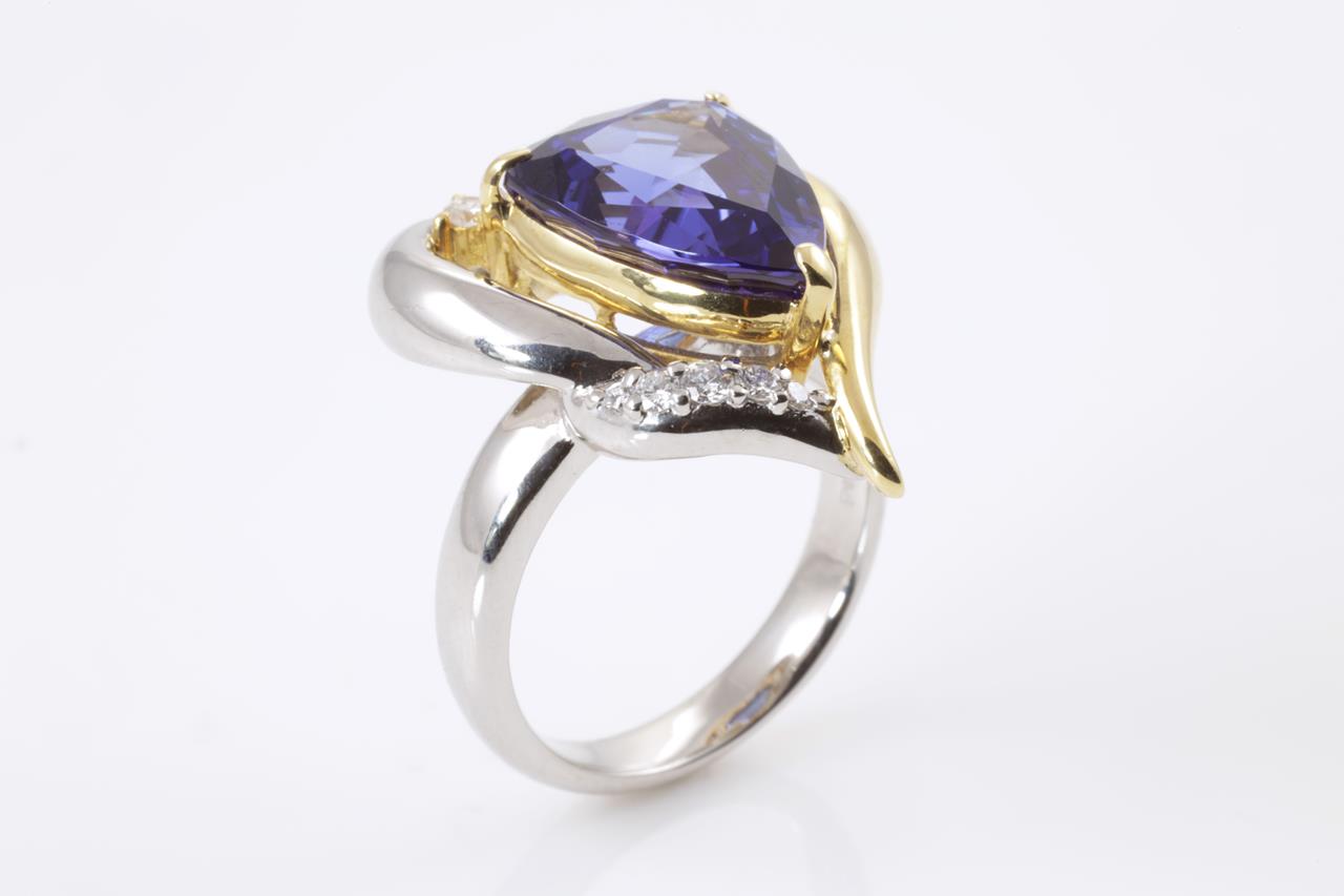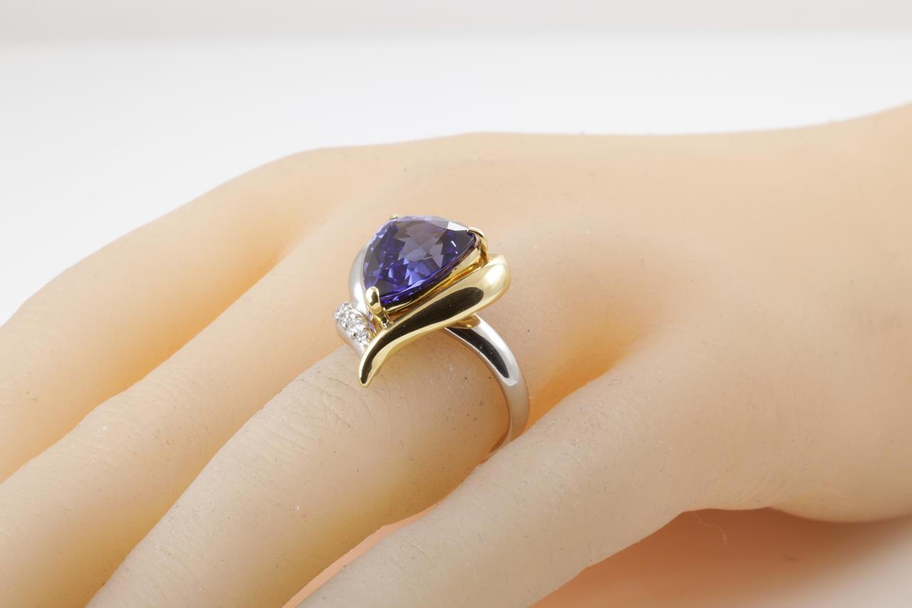 Tanzanite and Diamond ring with a trilliant cut Tanzanite of 6.13ct and Diamonds totalling 0.12cts. 18ct yellow gold & platinum. Ring size K1/2. Weight: 13.6g. With certificate #414265. (Pre-owned)