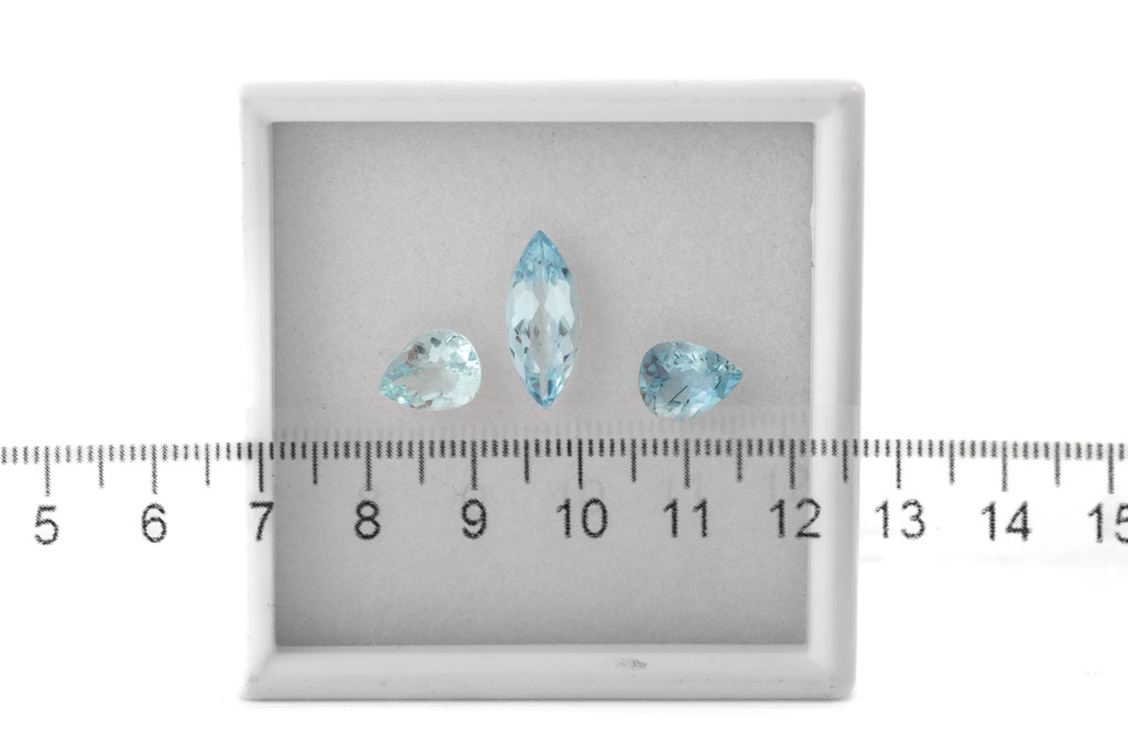 A parcel of 1 marquise cut and 2 pear shape loose Aquamarines totalling 6.19cts. (As New)