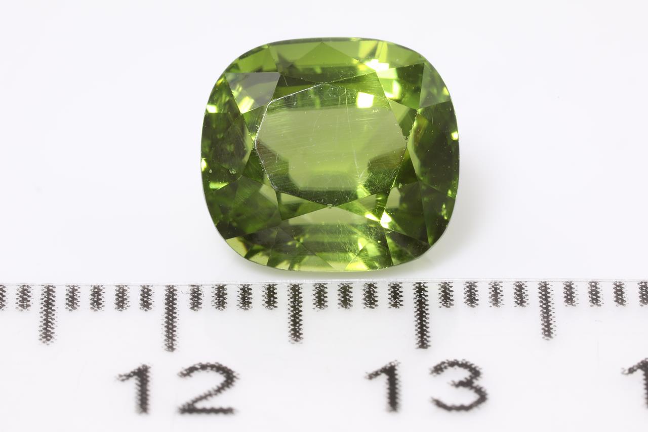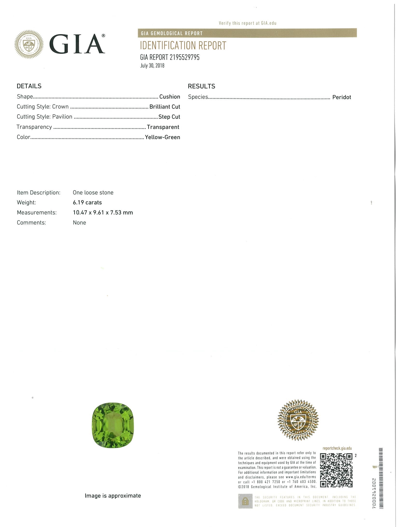A loose cushion cut Peridot of 6.19ct (with GIA report #2195529795). Dimensions: 10.47 x 9.61 x 7.53mm (Pre-owned)