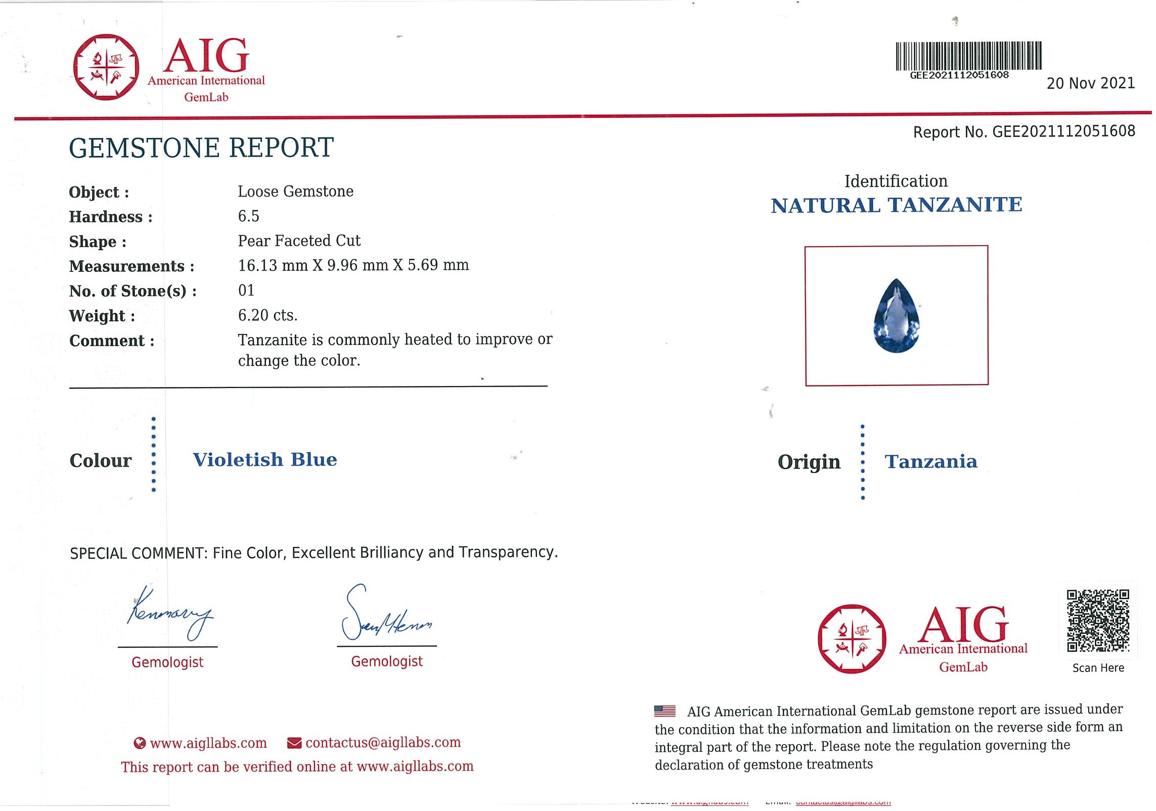A loose pear cut Tanzanite of 6.20ct. 16.13 x 9.96 x 5.69mm. With Gem report #GEE2021112051608. (As New)