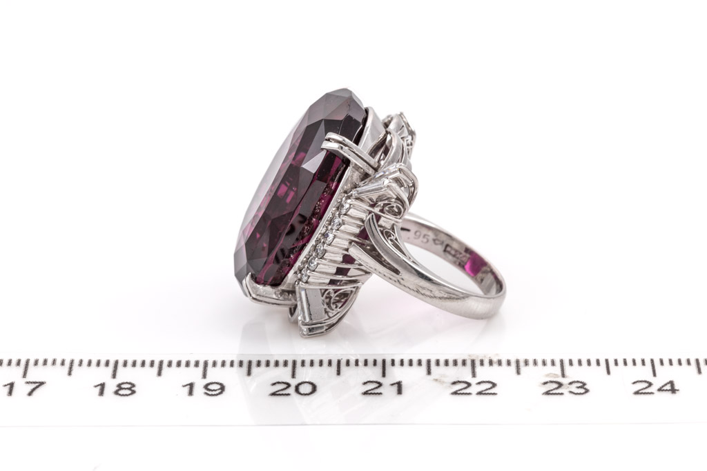 Garnet and Diamond ring with oval shape Garnet of 62.28ct and round & baguette cut Diamonds totalling 0.95cts (Estimated grading: H-I SI). Platinum. Ring size K. Weight: 28.5g. With certificate #416616. (Pre-owned)