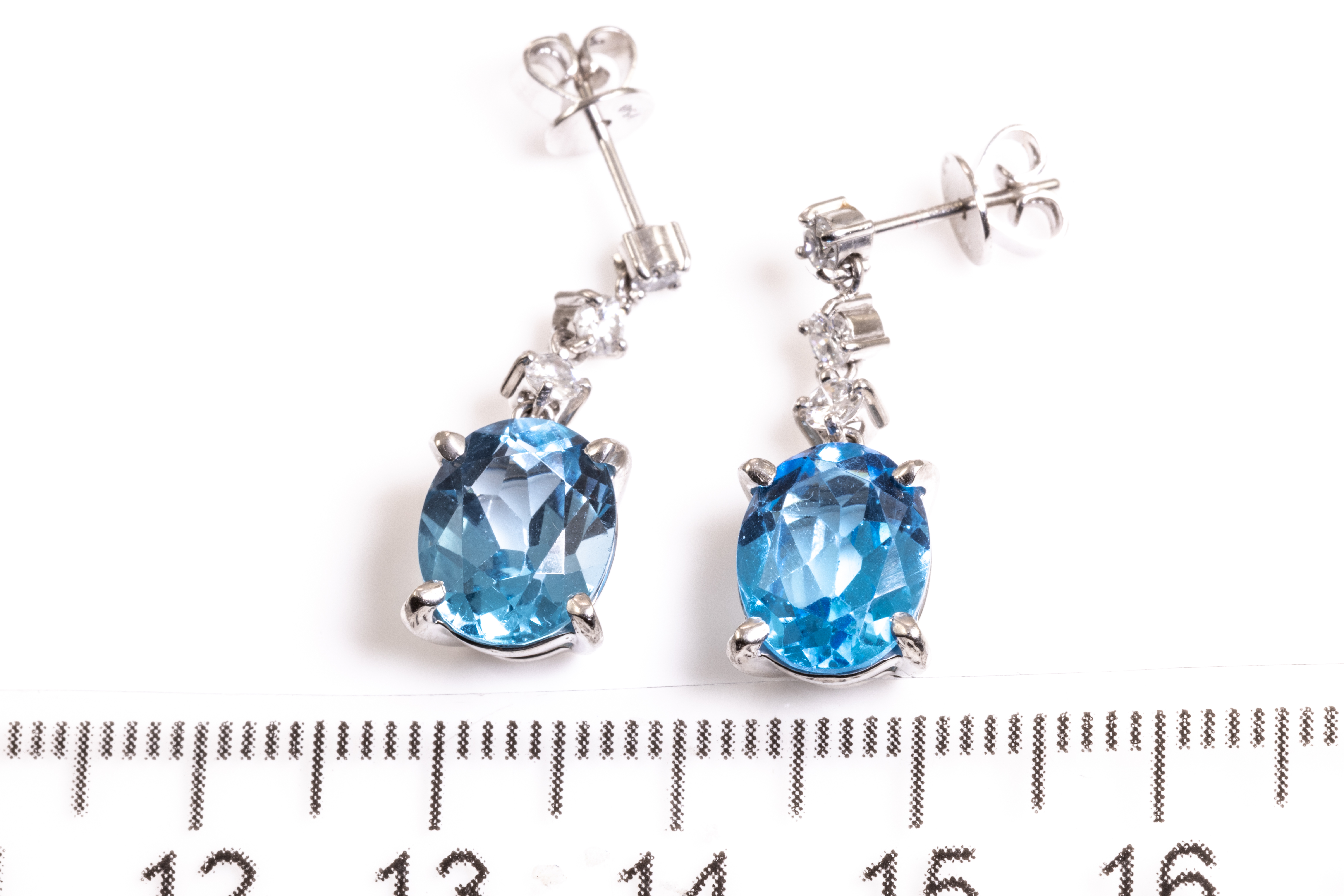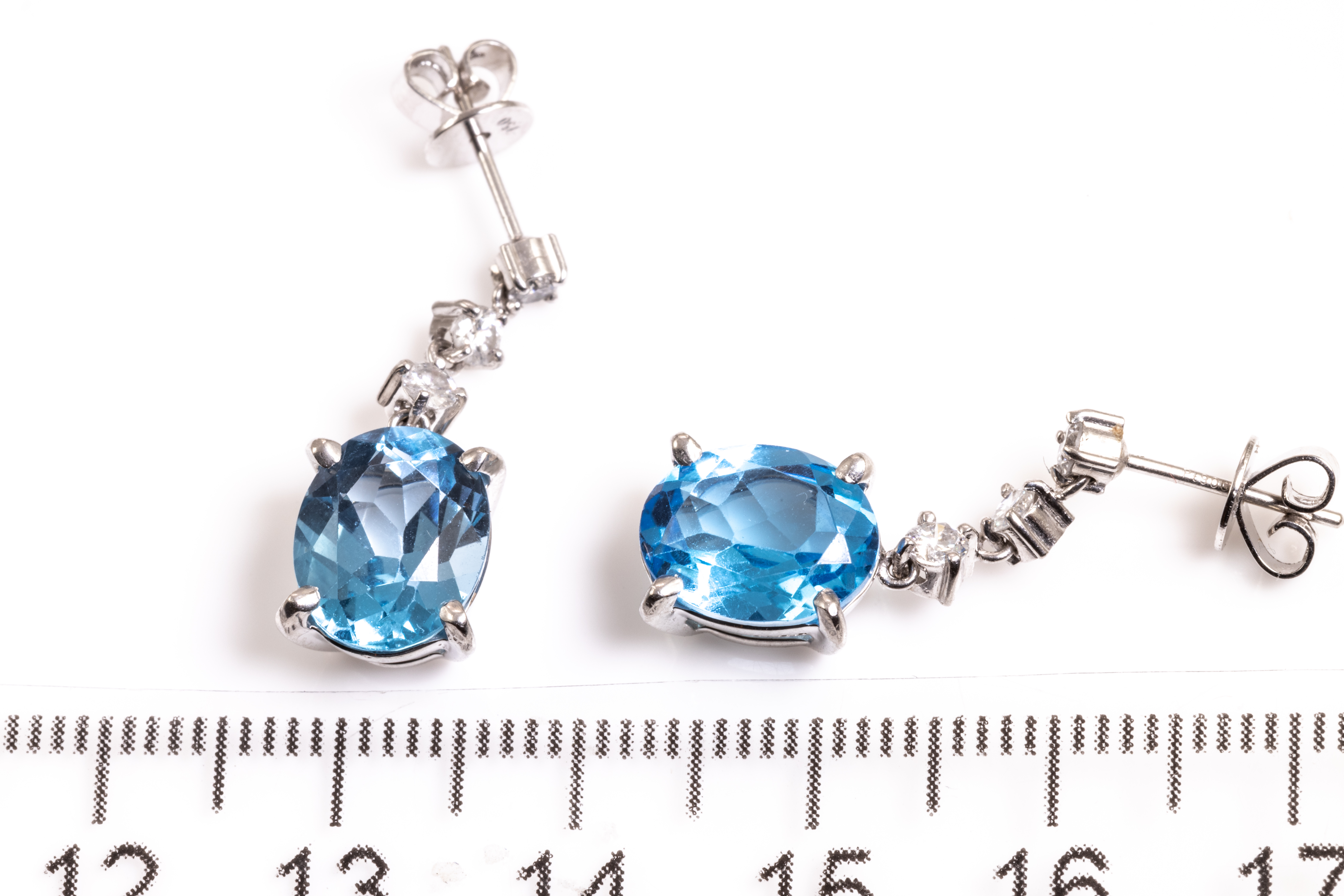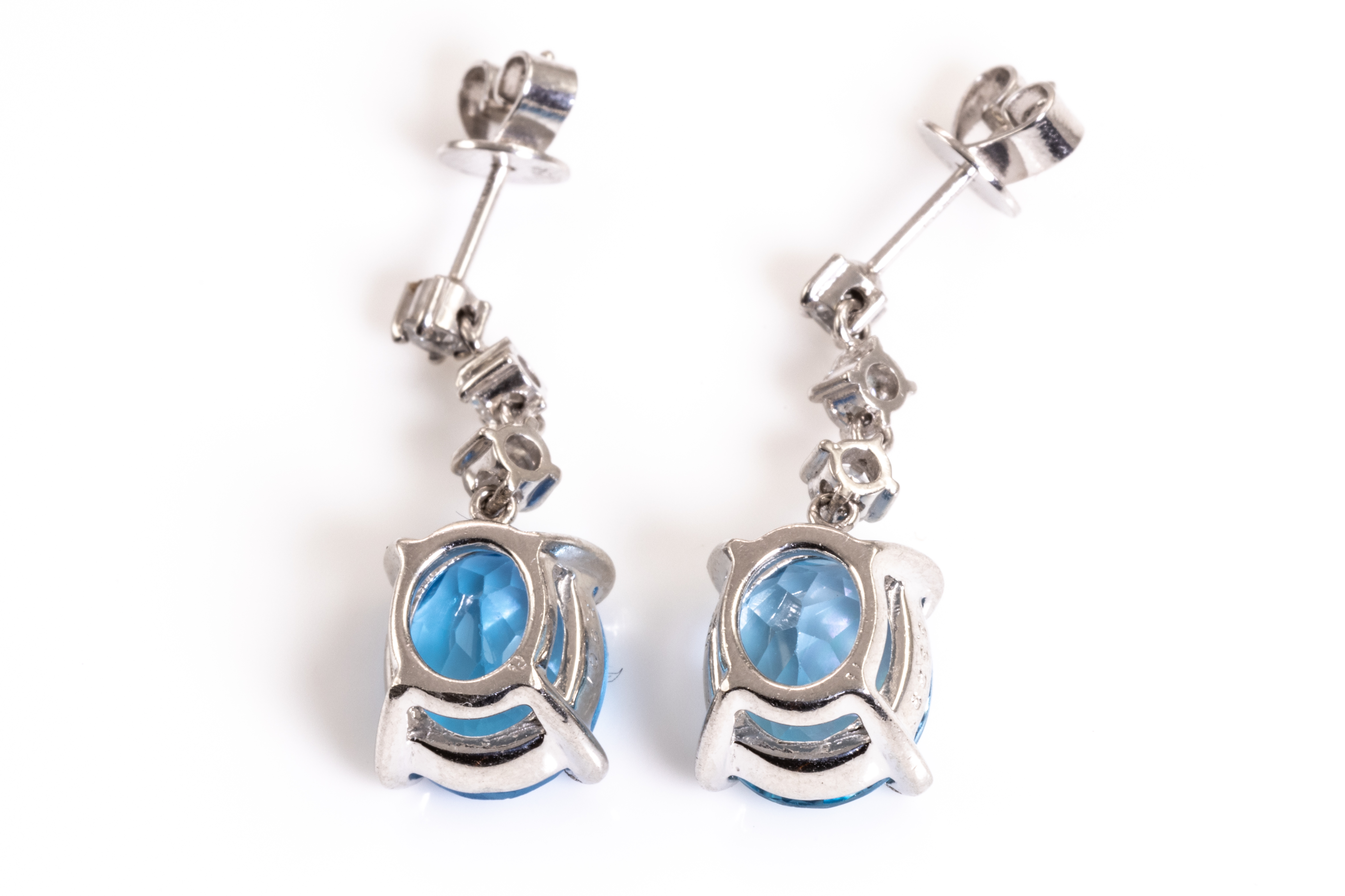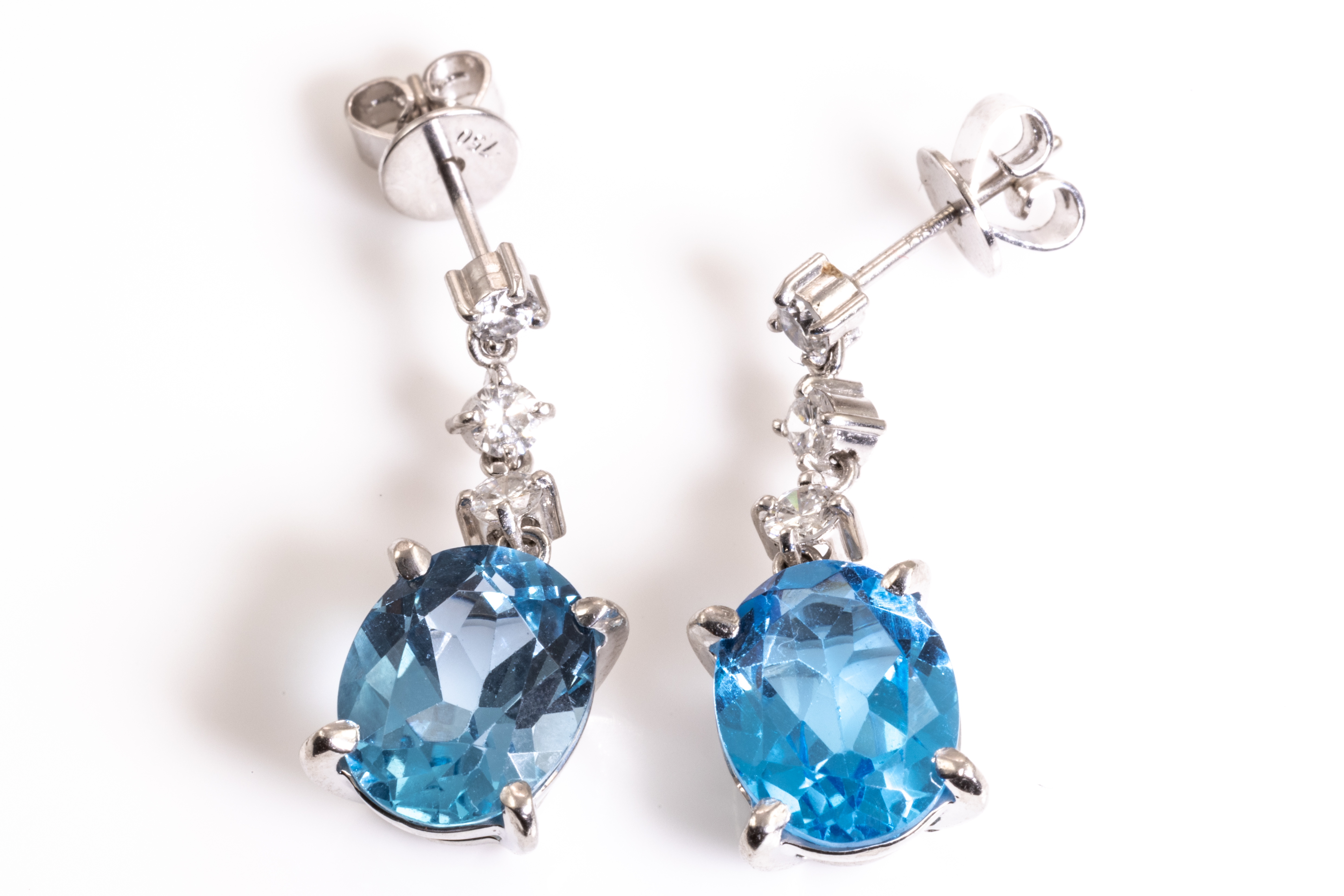 Topaz and Diamond earrings with oval shape blue Topaz totalling 6.22cts and 6 round Diamonds totalling 0.37cts (Estimated grading G SI). Platinum with 18ct white gold backs. Weight: 6.1g. (Pre-owned)