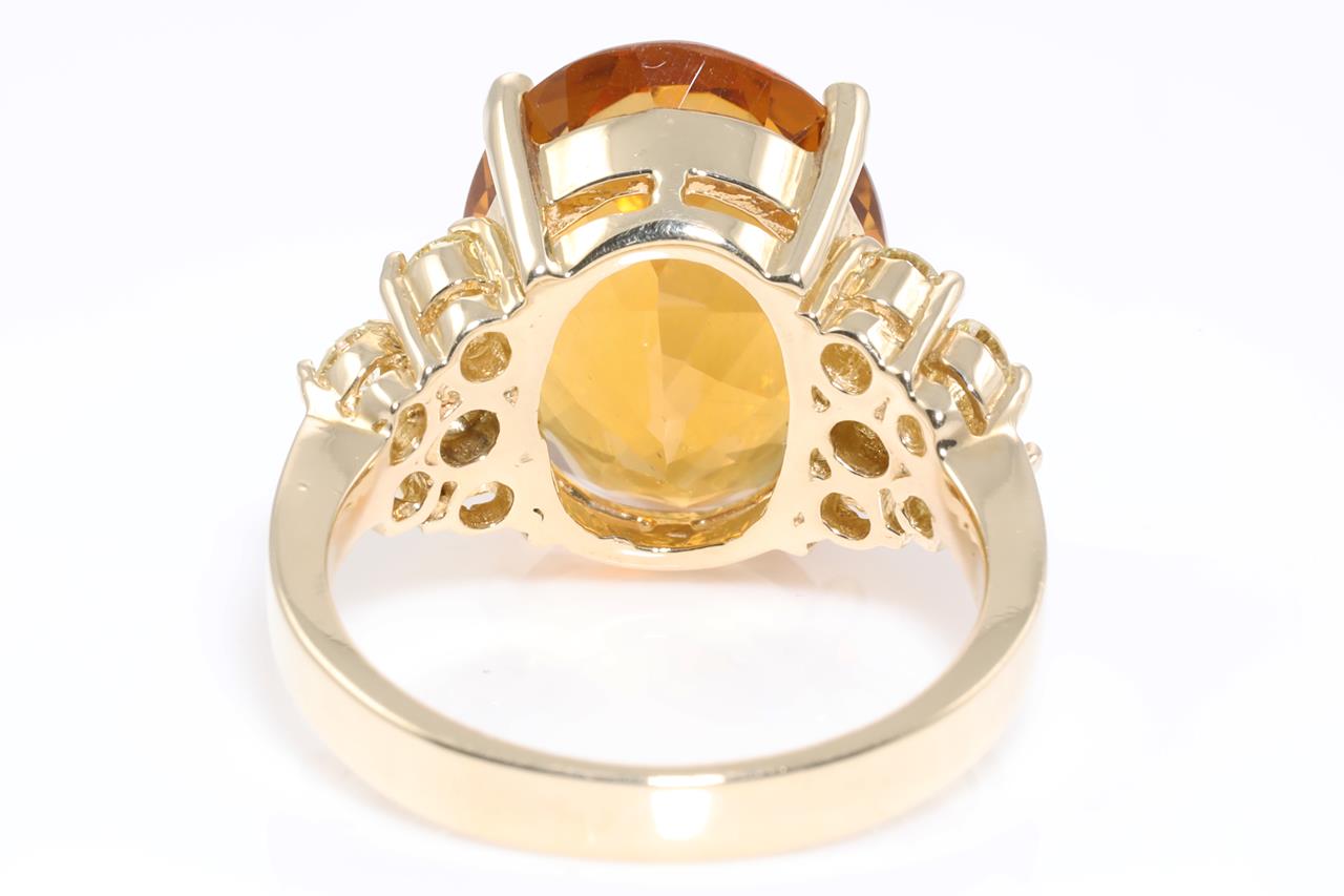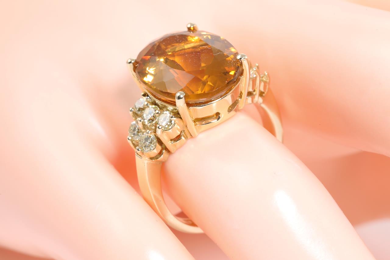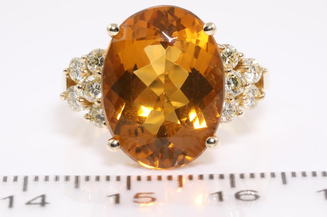 Citrine and Diamond Ring with oval cut Citrine of approximately 6.30ct and round Diamonds totalling approximately 0.60cts (Estimated grading: L-M SI). 14ct yellow gold. Ring size O. Weight 7.9g. (Pre-owned)