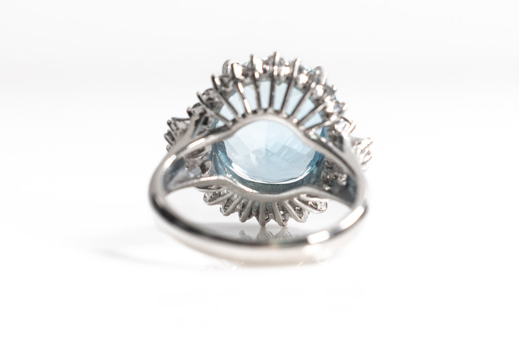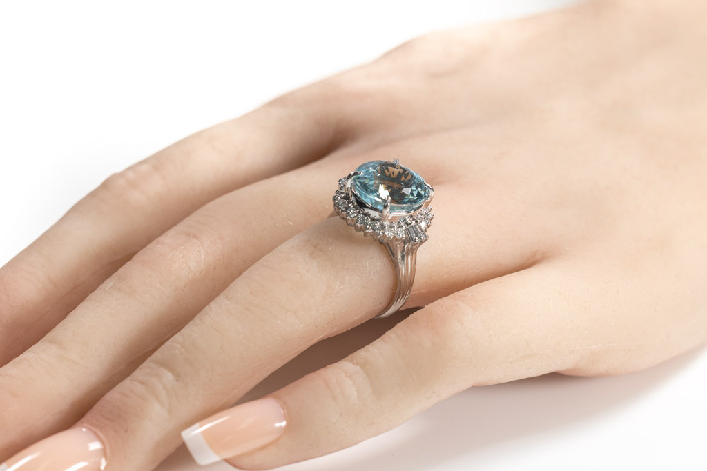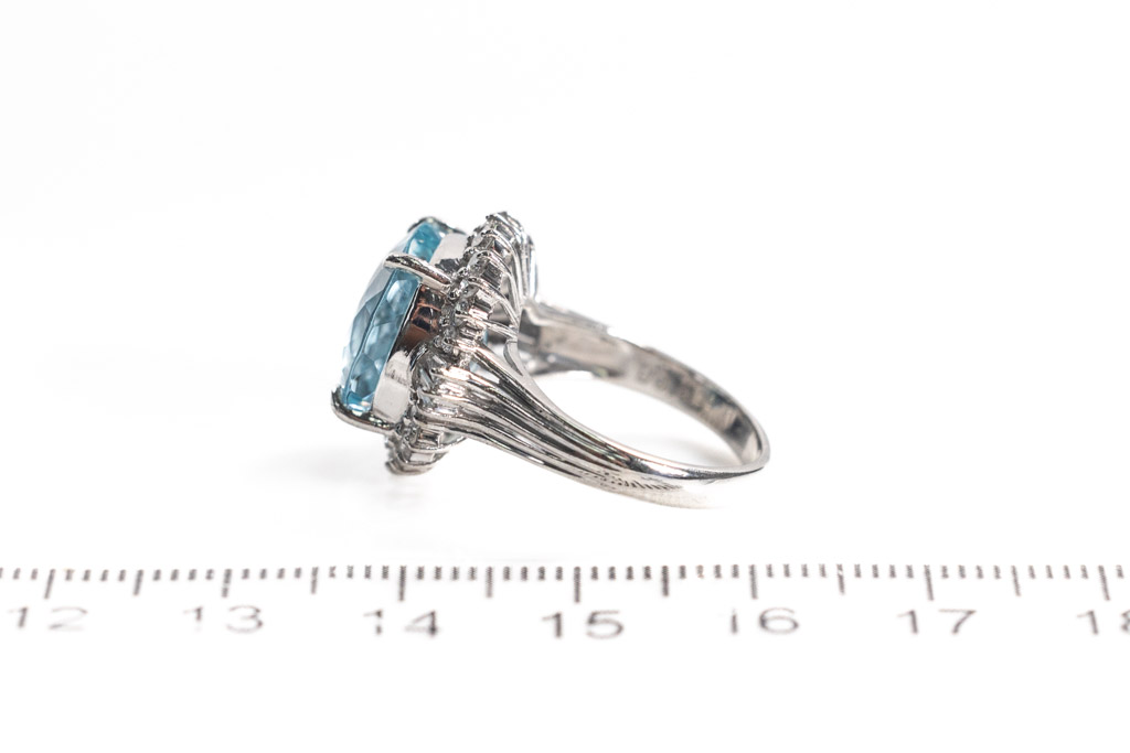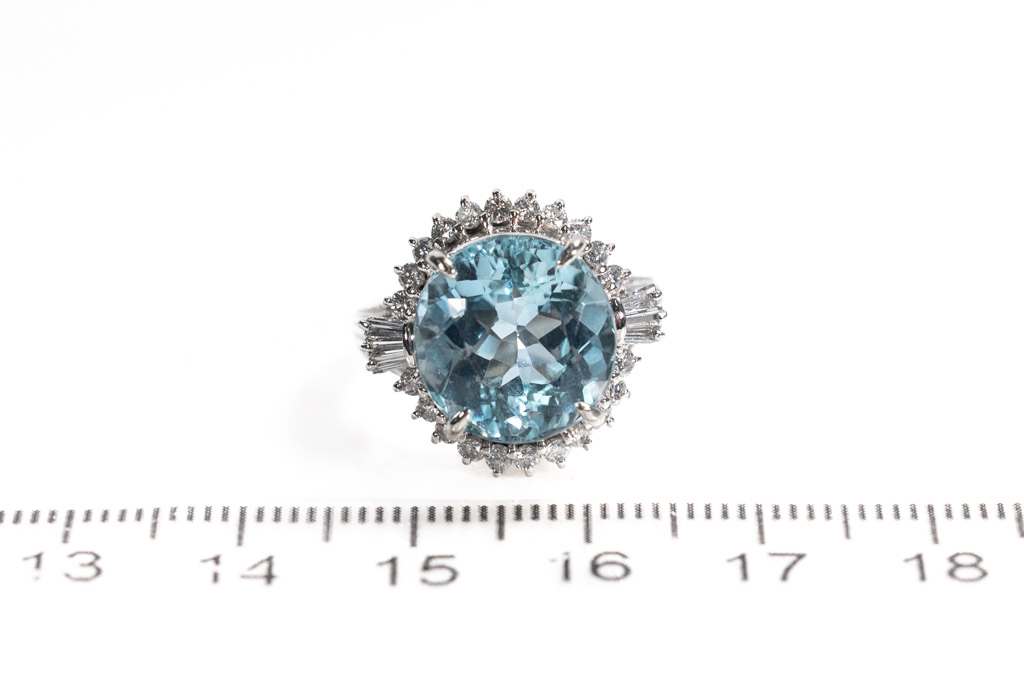 Aquamarine and Diamond ring with round Aquamarine of 6.34ct and round & baguette cut Diamonds totalling 0.53cts (Estimated grading: G SI). Platinum. Ring size J1/2. Weight: 8.1g. (Pre-owned)