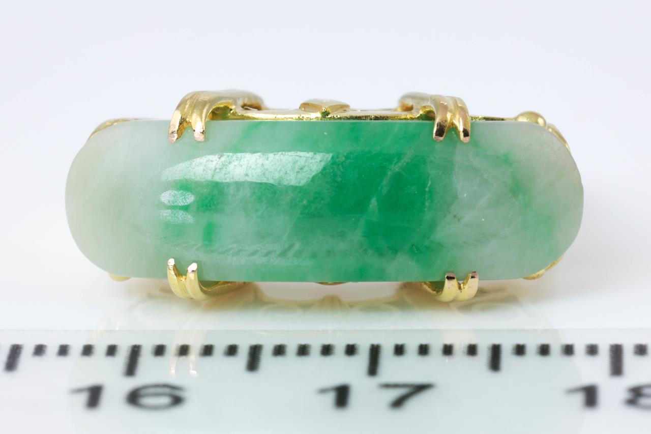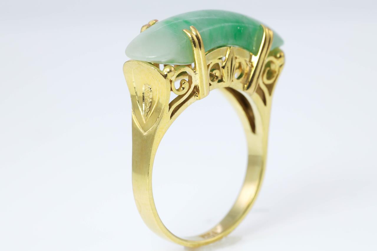 Jade Ring with a fancy cabochon cut green and white Jadeite Jade of approximately 6.40ct. 14ct yellow gold. Ring size M 1/2. Weight 4.8g. (As New)