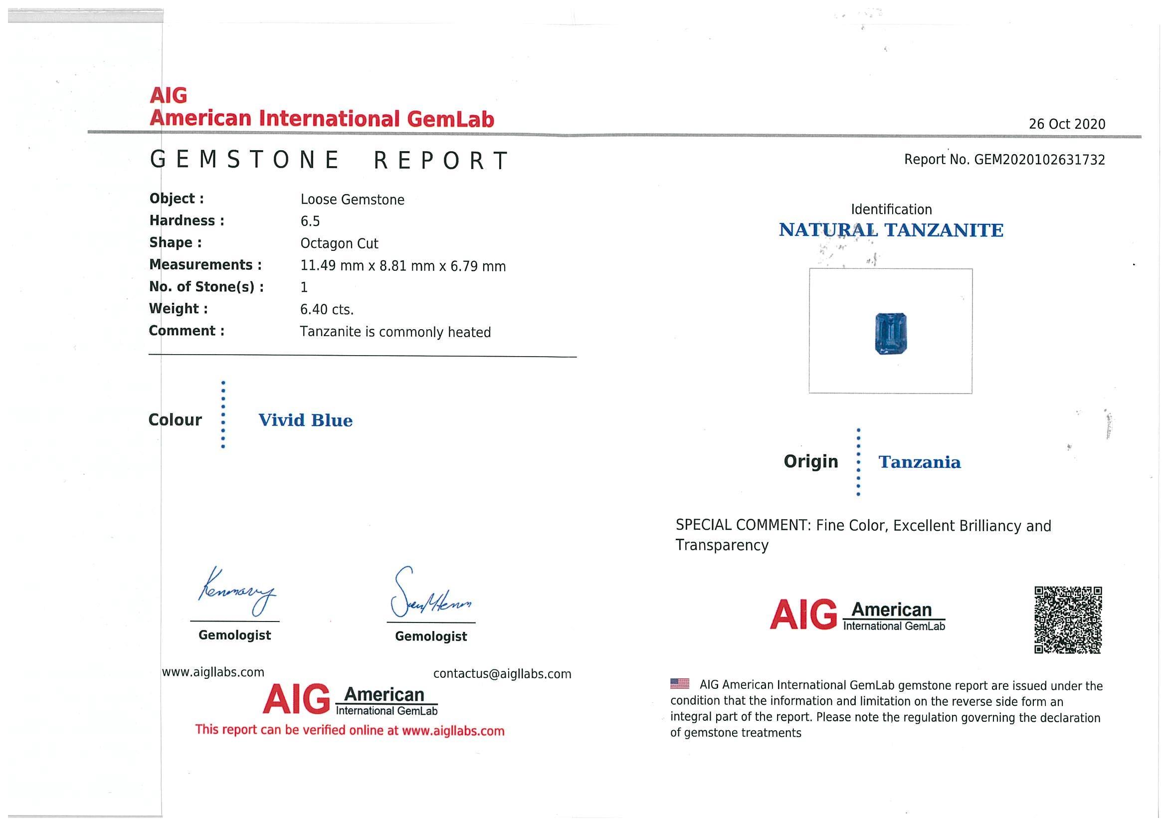 A loose octagon cut Natural Tanzanite of 6.40ct (with AIG report #GEM2020102631732). Size: 11.4 x 8.8 x 6.7mm. (New)