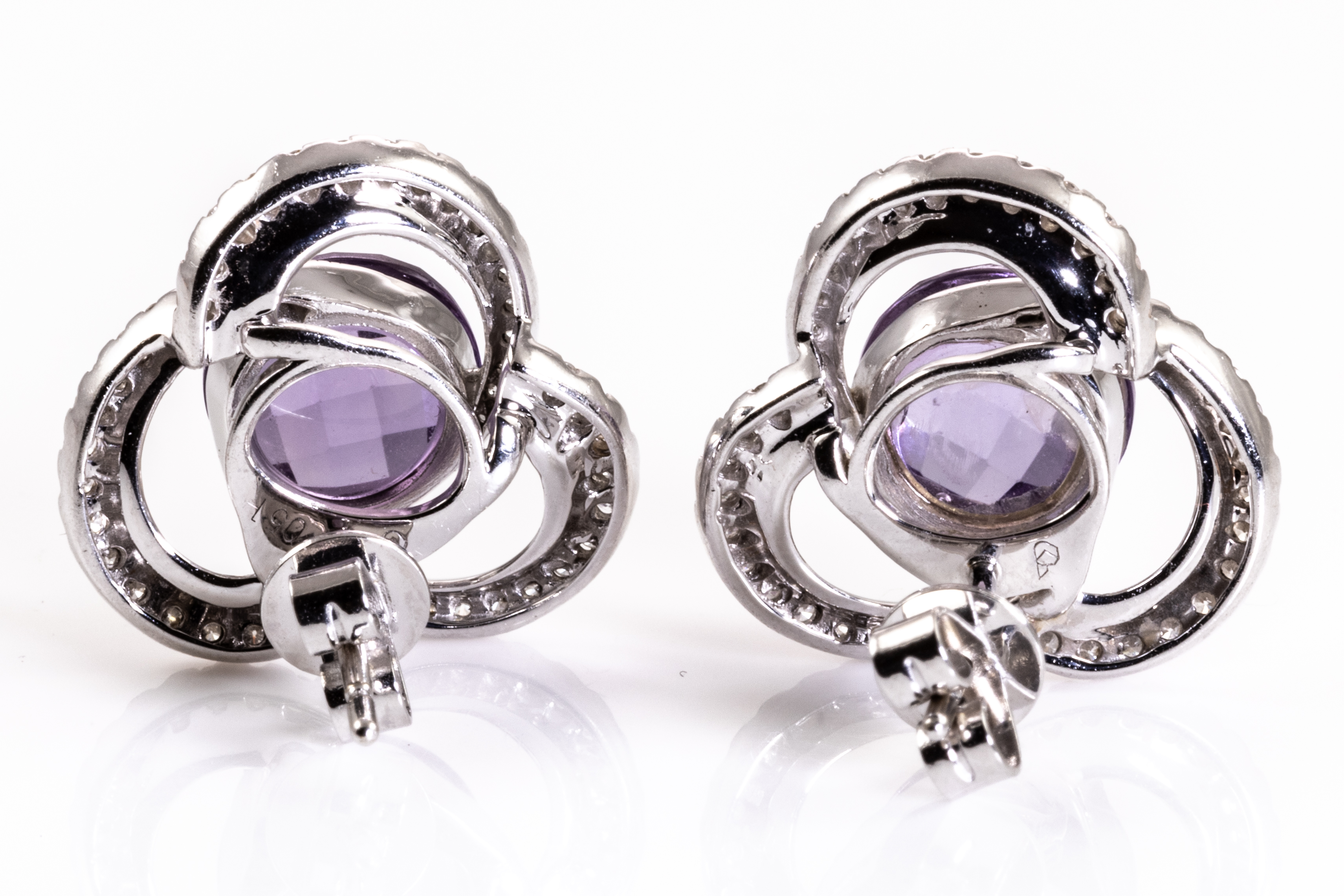 Amethyst and Diamond Earrings with checkerboard cut Amethysts totalling 5.64cts and round Diamonds totalling 0.51cts (Estimated grading G-H VS-SI). 18ct white gold with 18ct white gold backs. Weight: 7.1g. With Cert of Guarantee. (Pre-owned)