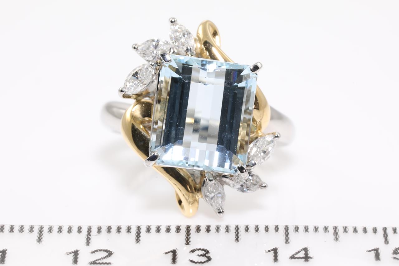 Aquamarine and Diamond ring with Aquamarine of 6.44ct and 6 marquise cut Diamonds totalling 0.54cts (Estimated grading: H VS-SI). 18ct yellow gold and platinum. Ring size M. Weight: 11.2g (As New)