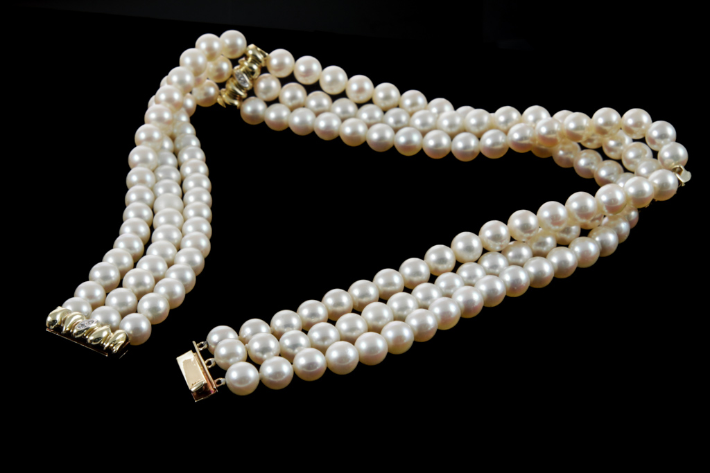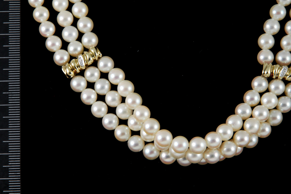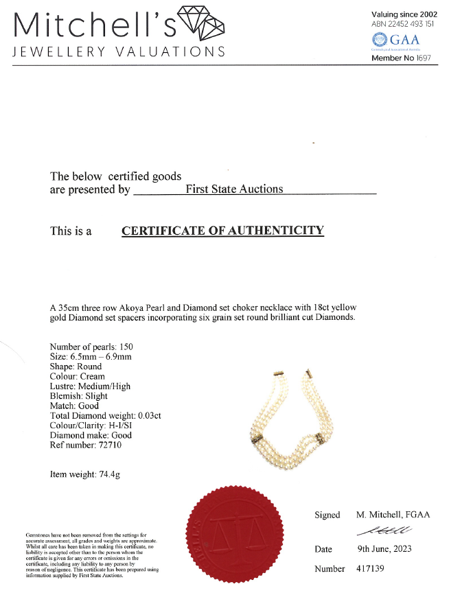 Pearl and Diamond 3 rows choker necklace with Akoya Pearls of 6.5mm - 6.9mm. 18ct yellow gold spacers and clasp set with round Diamonds totalling approximately 0.03cts. Length: 35cm. Weight: 74.4g. With Certificate #417139. (Pre-owned)
