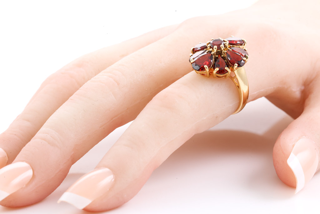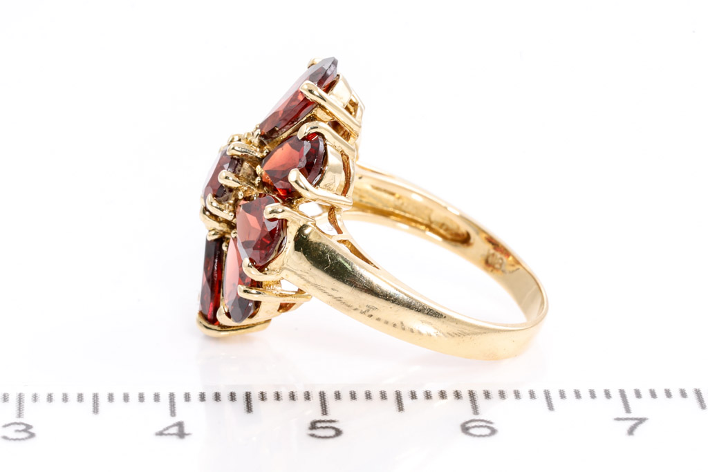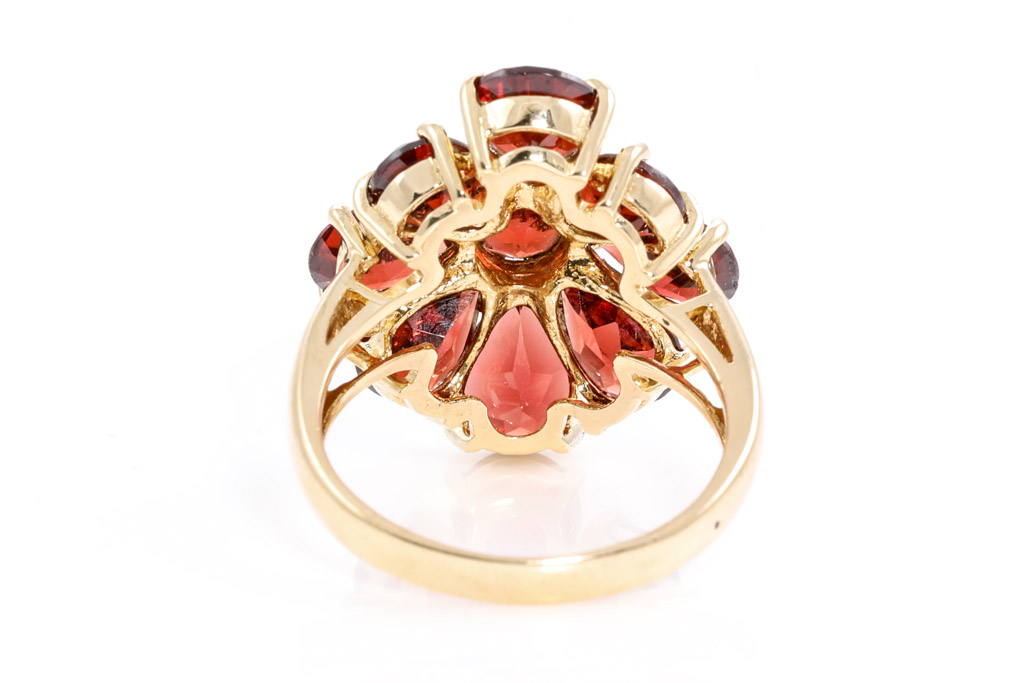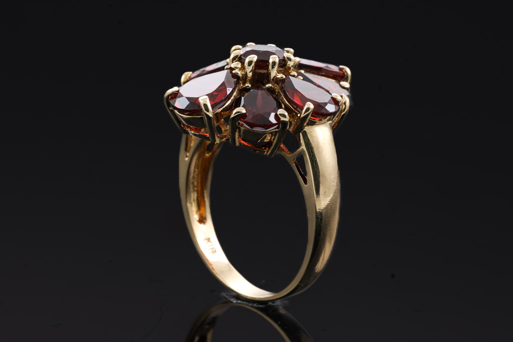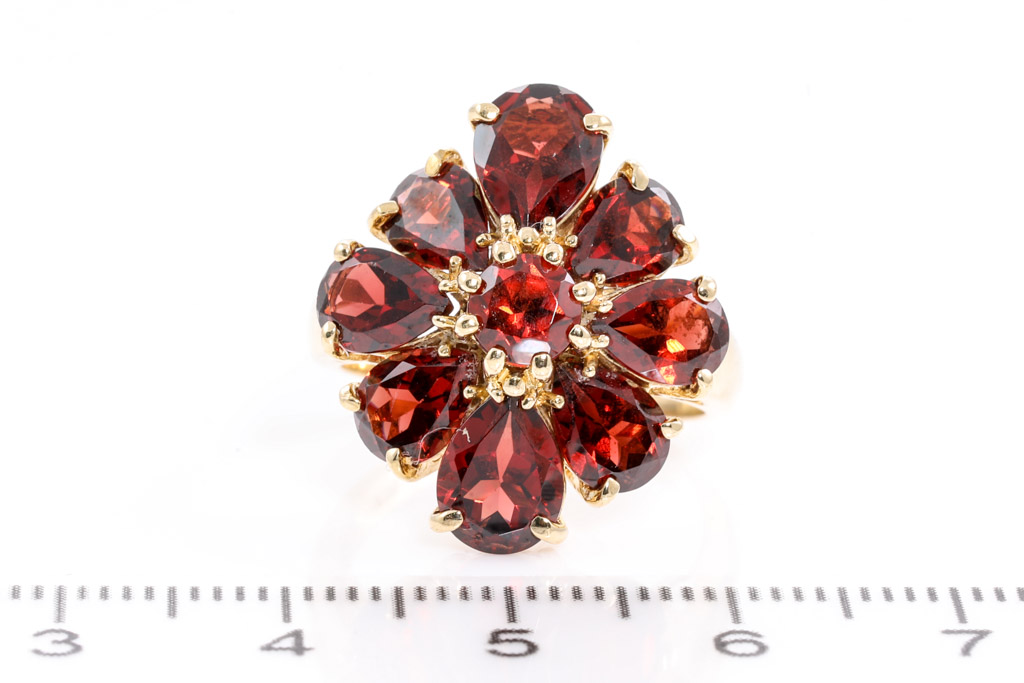 Garnet ring with round & pear shape red Garnets totalling 6.50cts. 18ct yellow gold. Ring size M. Weight: 6.3g. (Pre-owned)