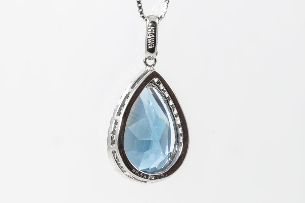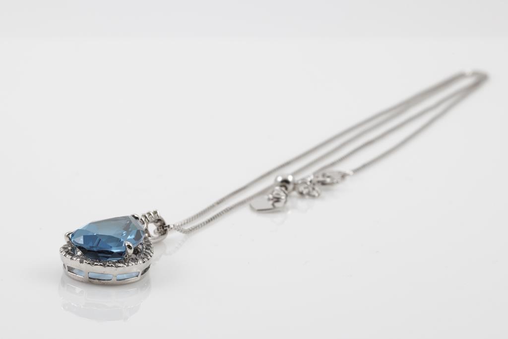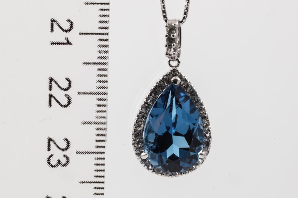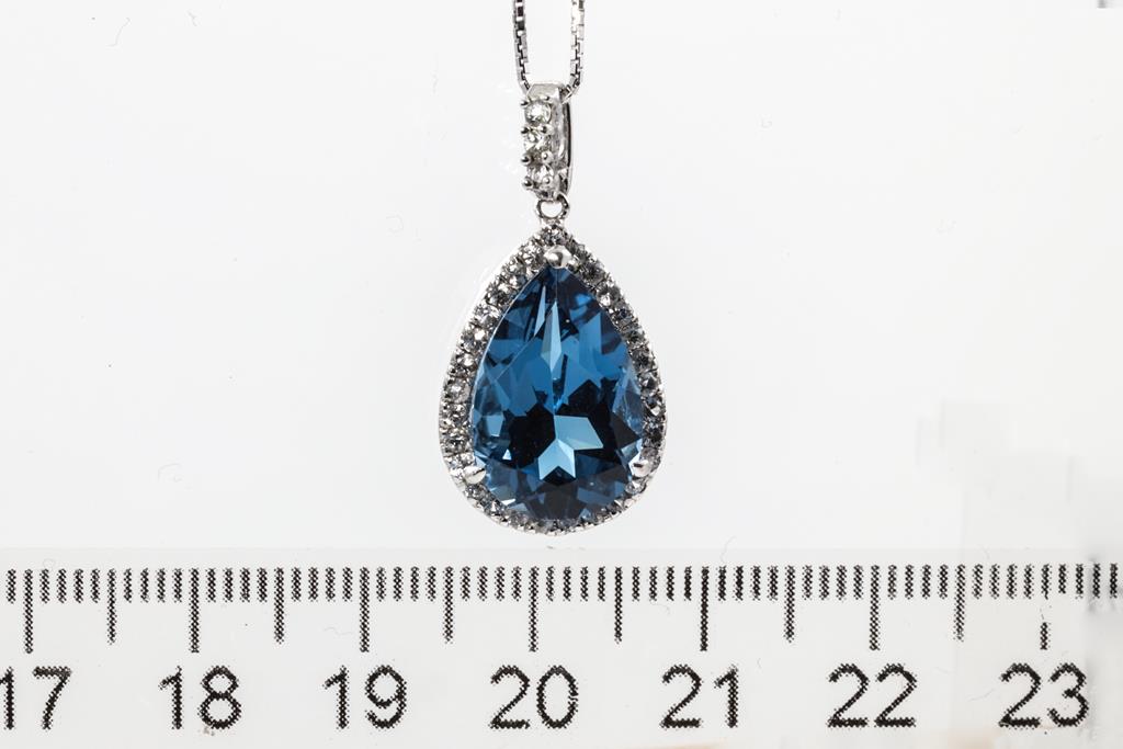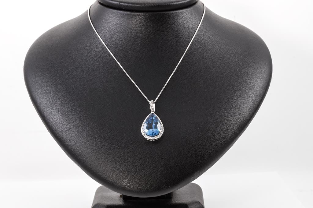 Topaz and Diamond Pendant with pear shape London Blue Topaz of 6.53cts and round Diamonds totalling 0.51cts (Estimated grading: G SI). 14ct white gold with 40cm adjustable chain. Weight: 4.9g. (Pre-owned)