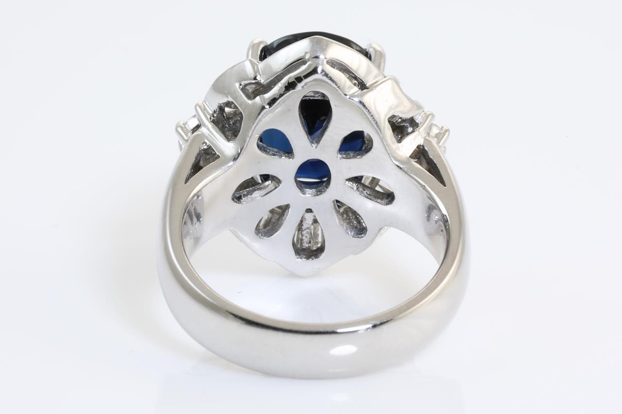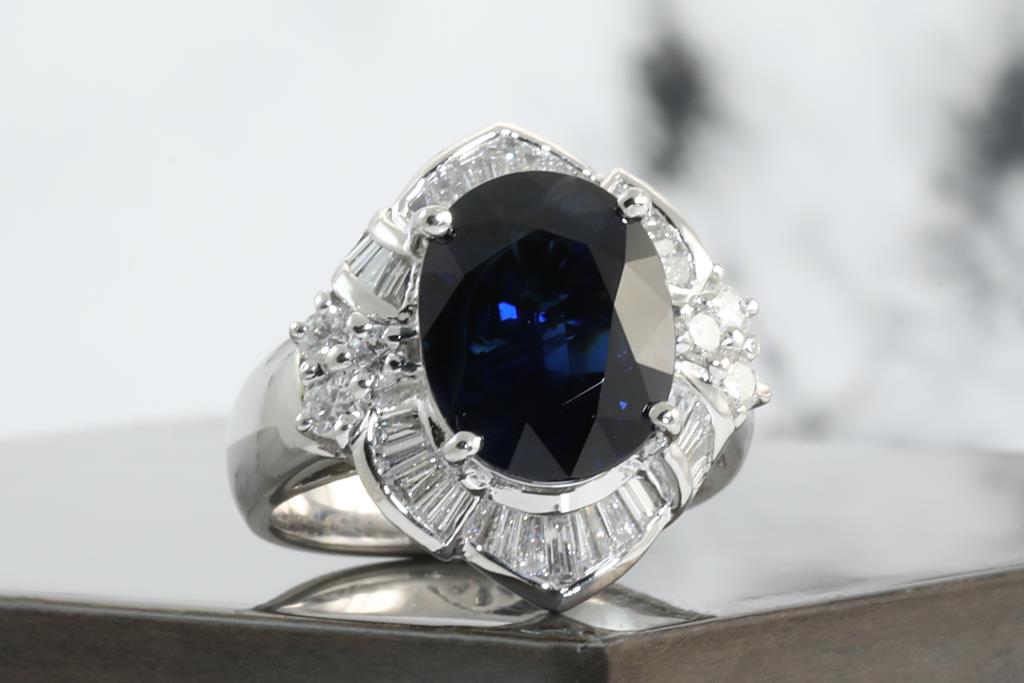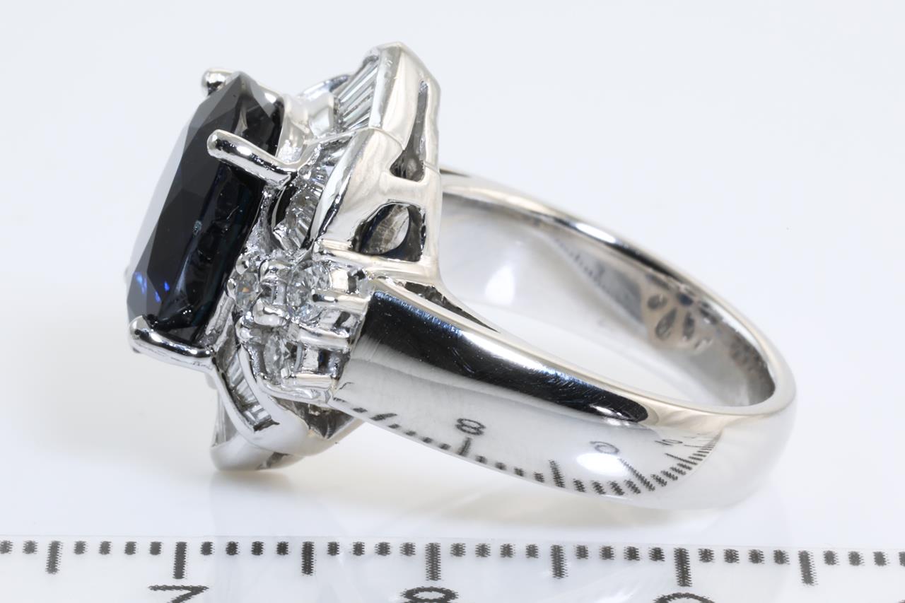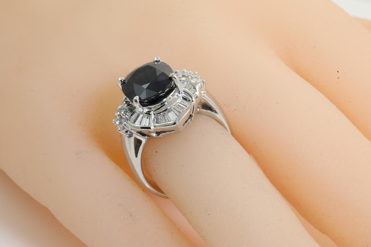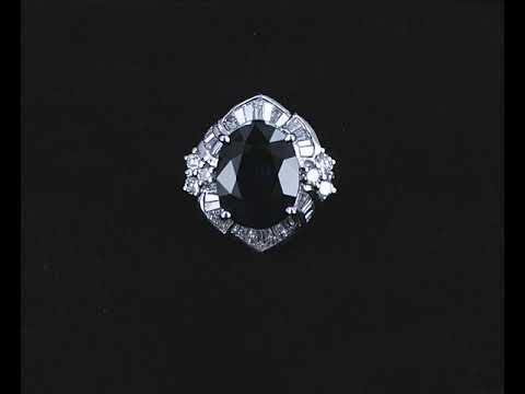 Sapphire and Diamond ring with oval shape Sapphire of 6.54ct with baguette and round Diamonds totalling 1.01cts (Estimated grading: FGH VS-SI). Platinum. Ring size: M. Weight: 17.9g With Certificate #4386. (Pre-owned)