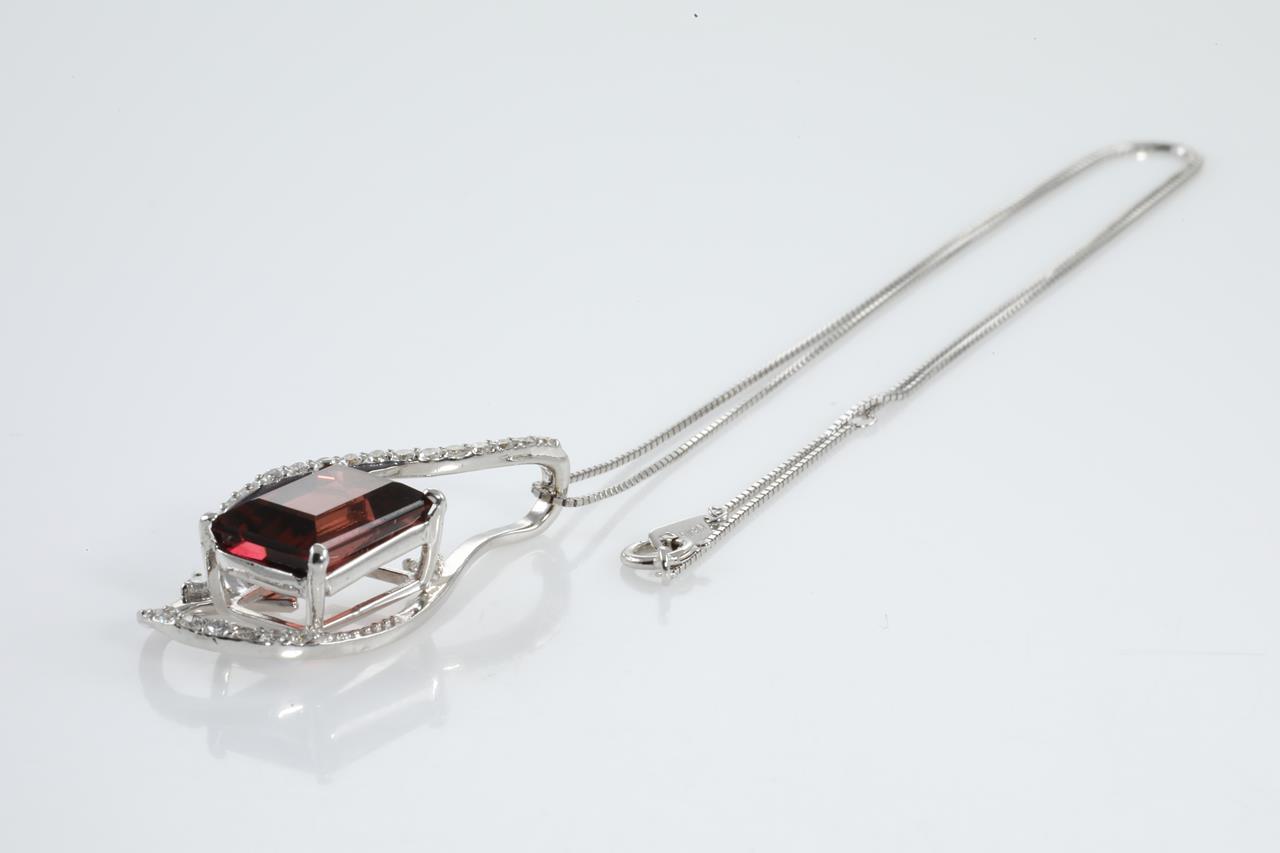 Tourmaline and Diamond pendant with emerald cut Tourmaline of 6.59ct and round Diamonds totalling 0.36cts (Estimated grading: H SI). 18ct White gold with 18ct gold 40cm chain. Weight: 6.5g (Pre-owned)