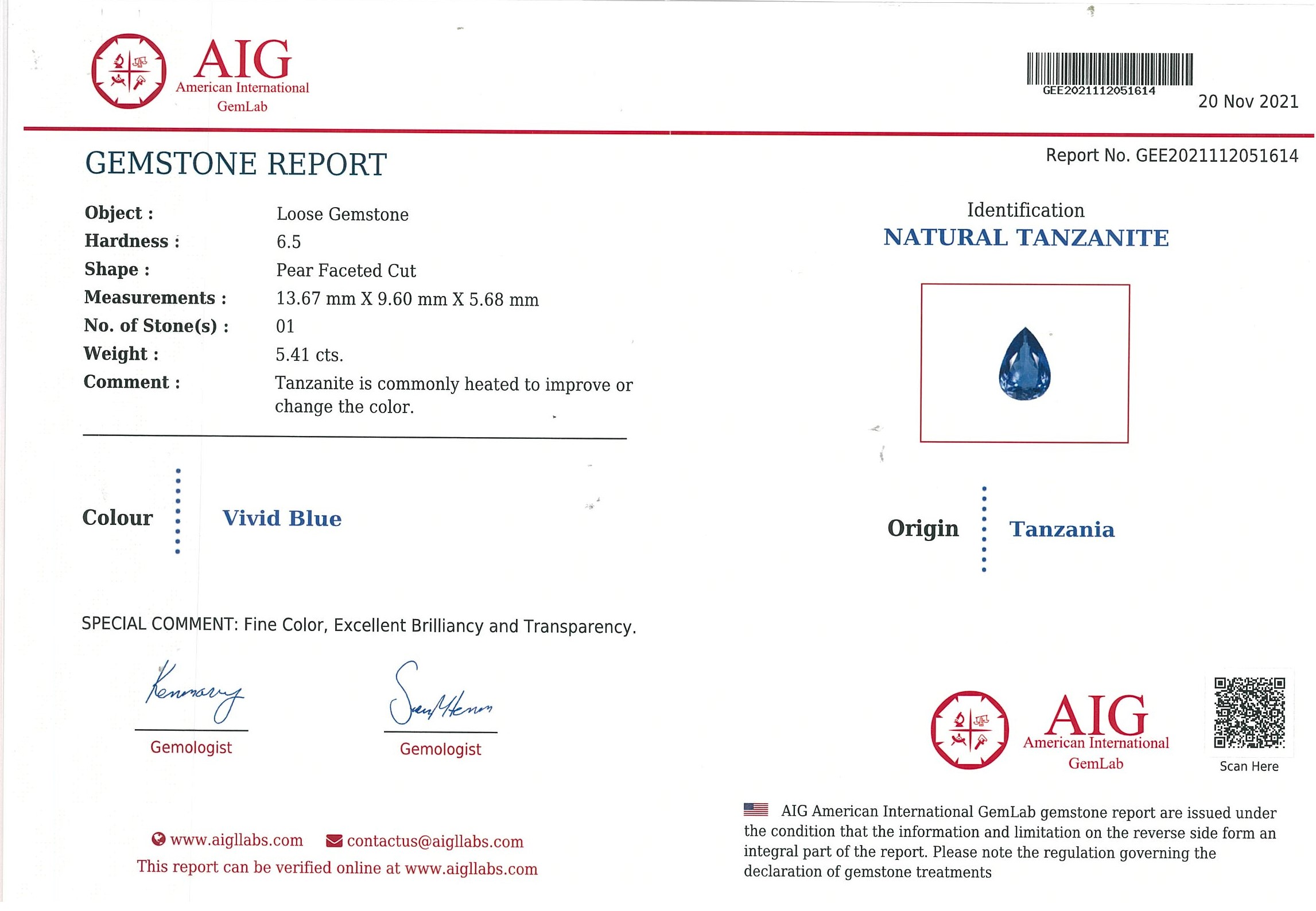 A loose pear shaped Tanzanite of 6.50ct. 13.67 x 9.60 x 5.68mm. With Gem report # GEE2021112051614. (Pre-owned)
