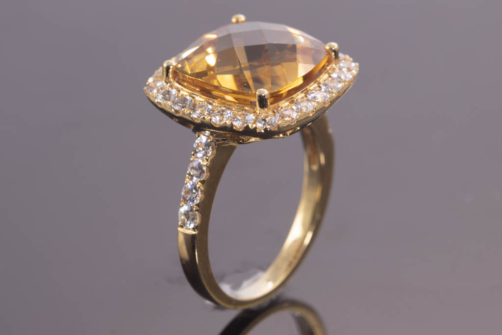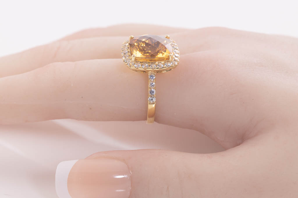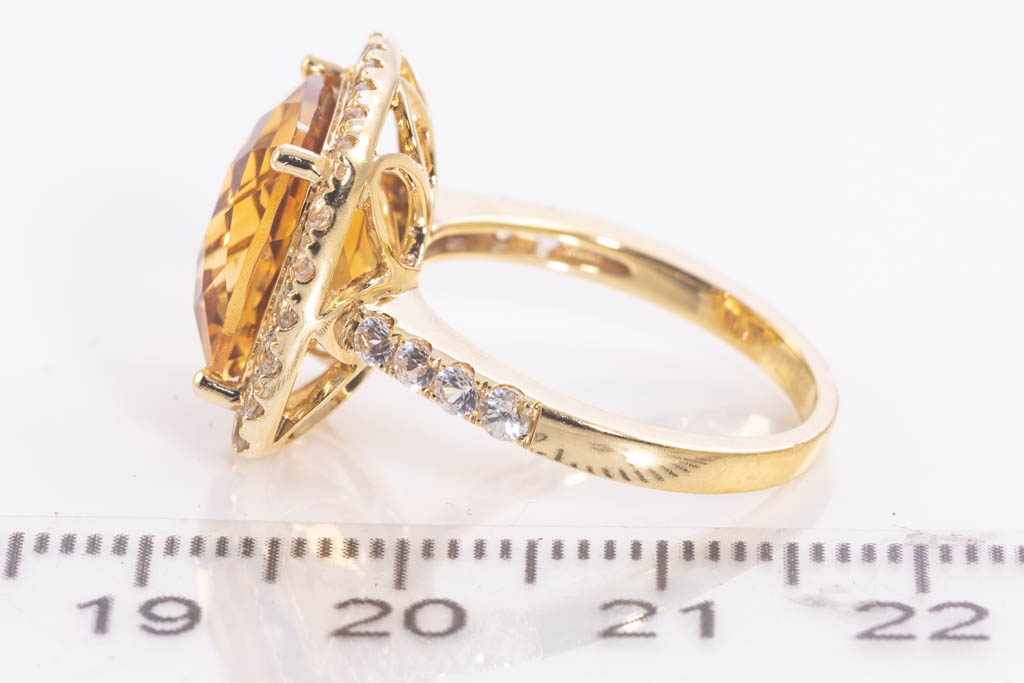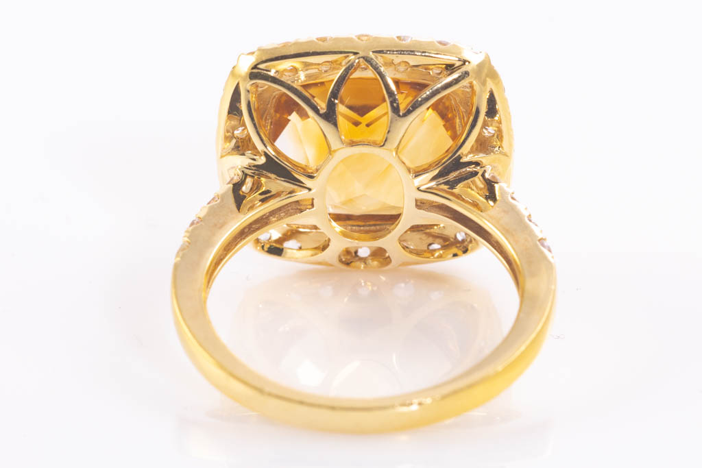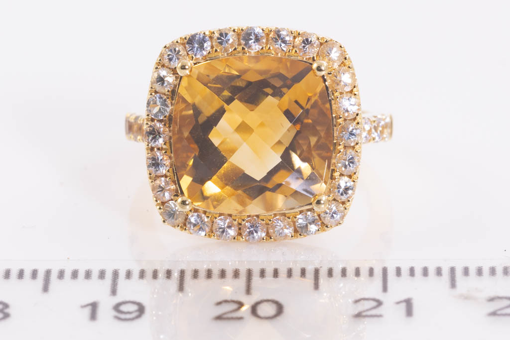 Citrine and Sapphire ring with cushion cut Citrine of 6.66ct and round colourless Sapphires totalling 1.10cts. 18ct yellow gold. Ring size L1/2. Weight: 6.7g. (Pre-owned)