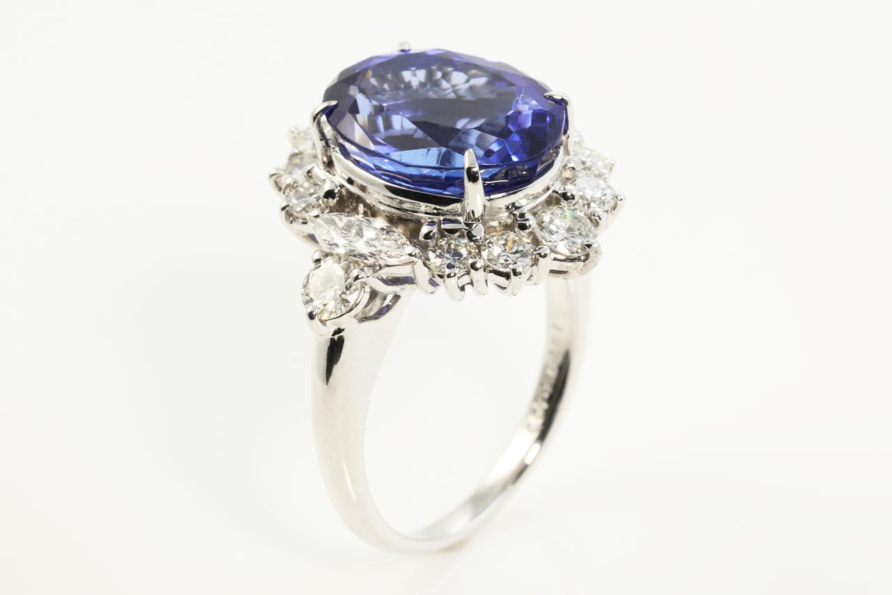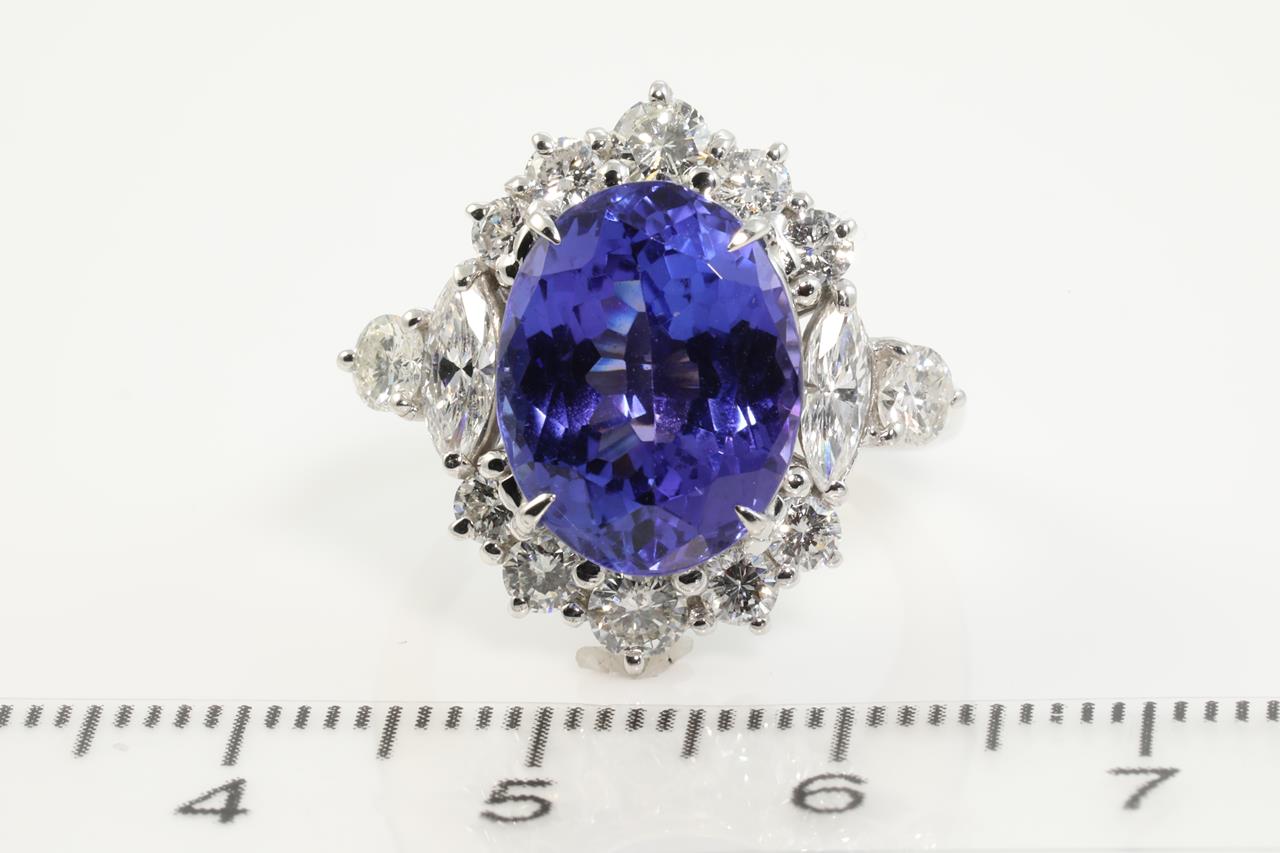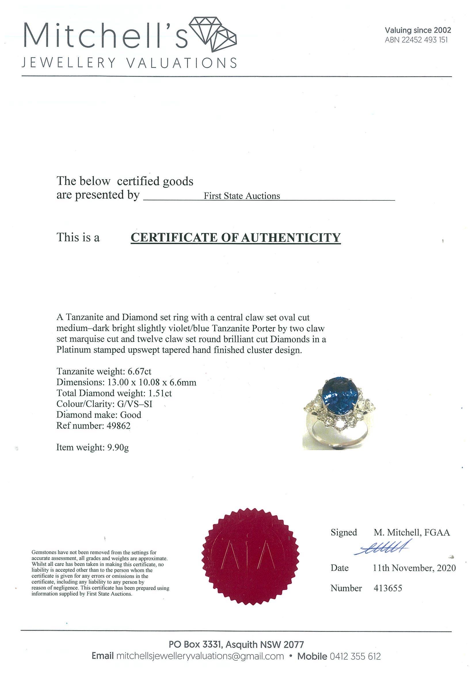 Tanzanite and Diamond ring with oval shape Tanzanite of 6.67ct and round & marquise cut Diamonds totalling 1.51cts (Estimated grading: G VS-SI ). Platinum. With Valuation #3974/2021. Ring size L1/2 - Note resizing is not recommended. With certificate #413655. Weight: 9.9g (Pre-owned)