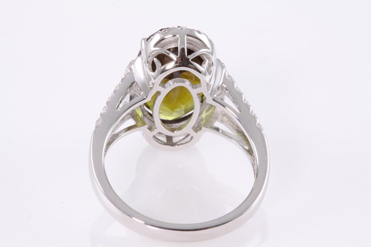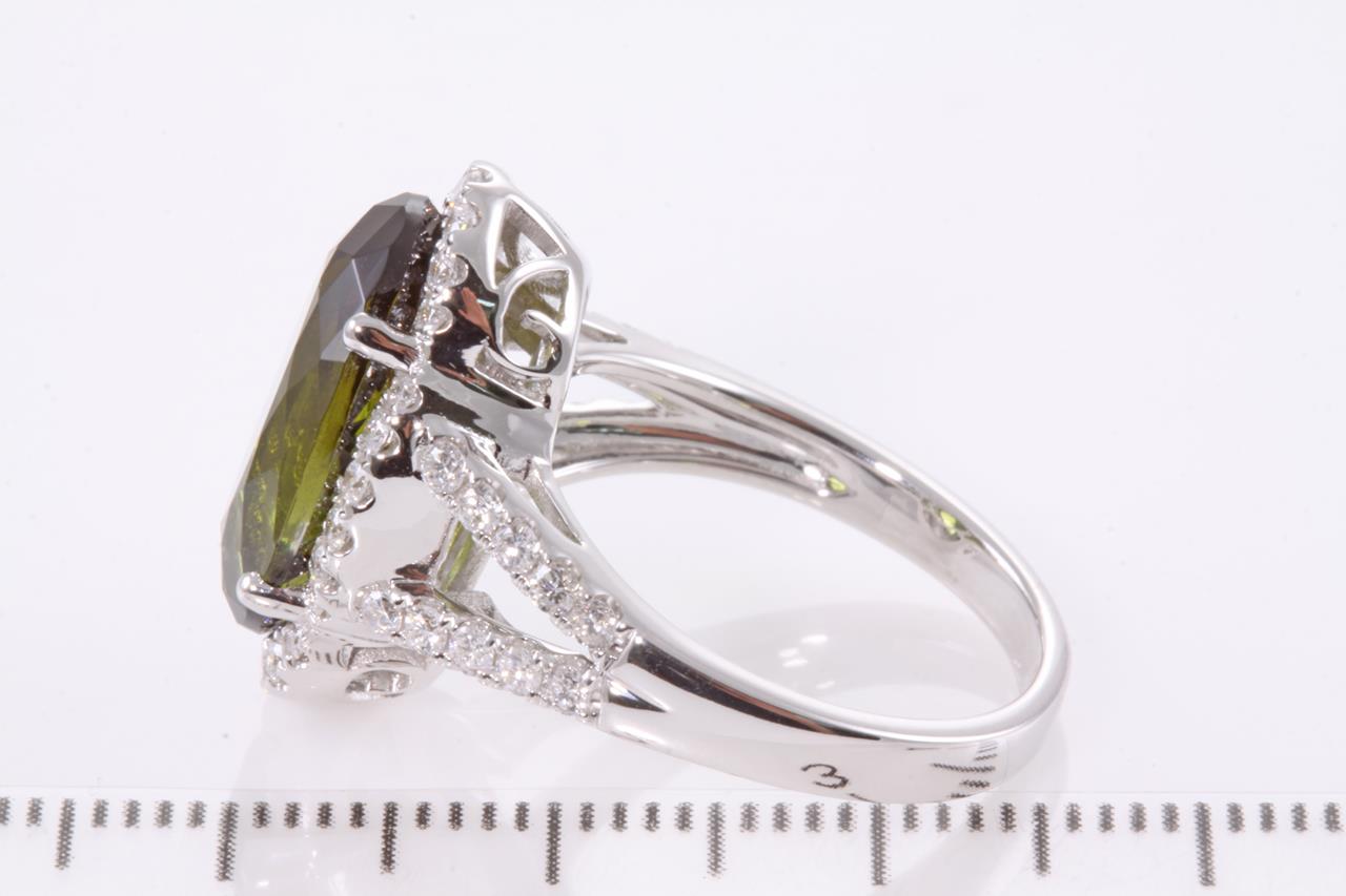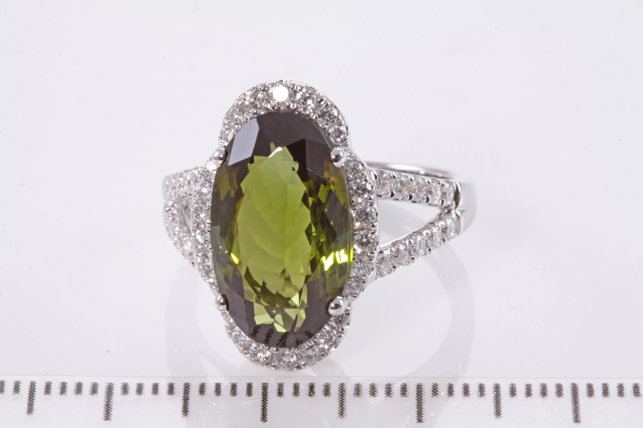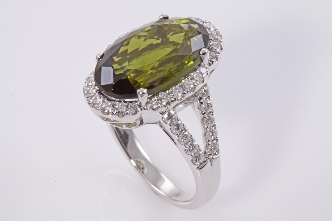 Tourmaline and Diamond ring with an oval shape Green Tourmaline of 6.68ct and Diamonds totalling 0.67cts (Estimated grading: G-H VS-SI). 18ct white gold. Ring size N1/2. Weight: 7.1g. With certificate #306052. (New)