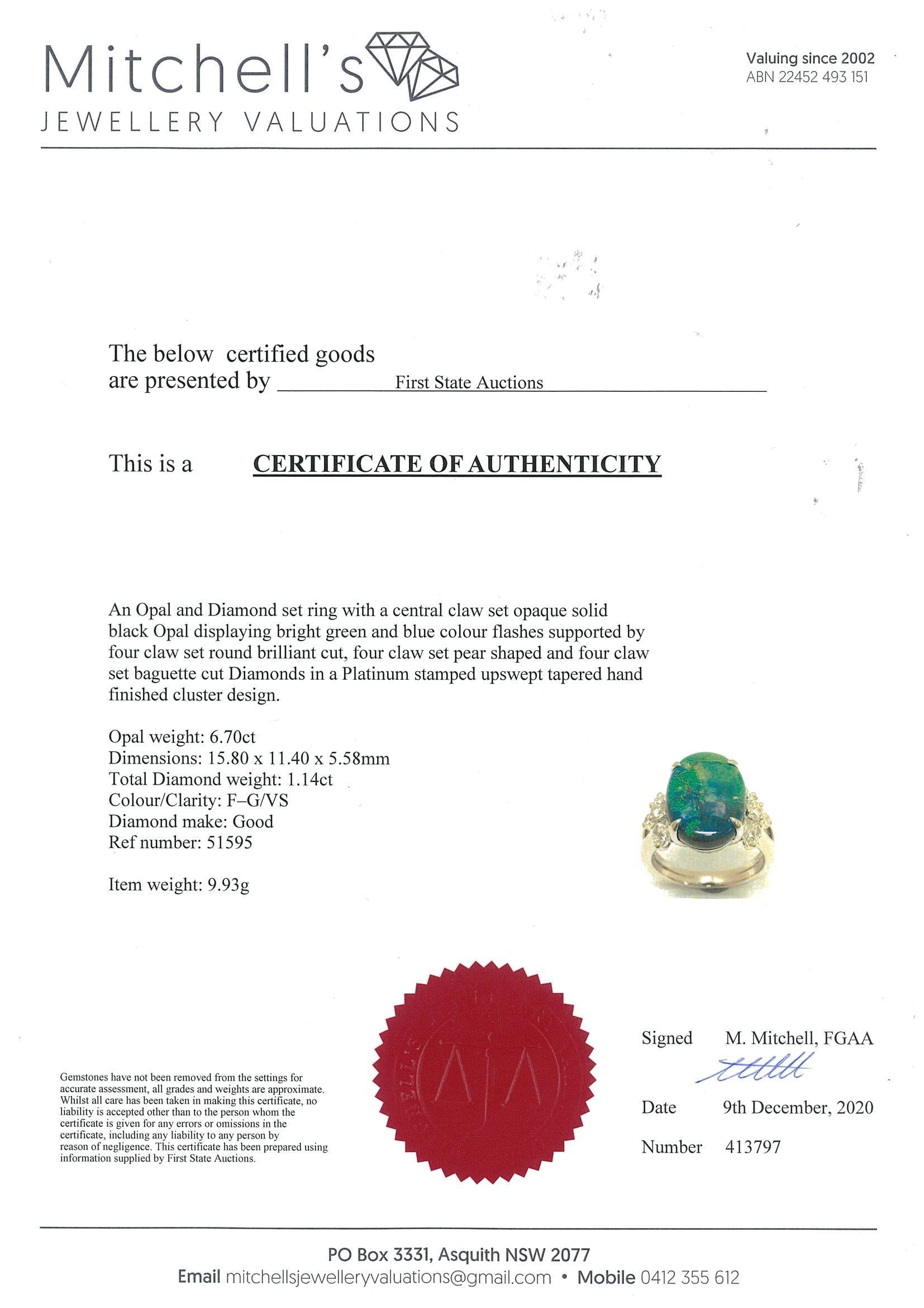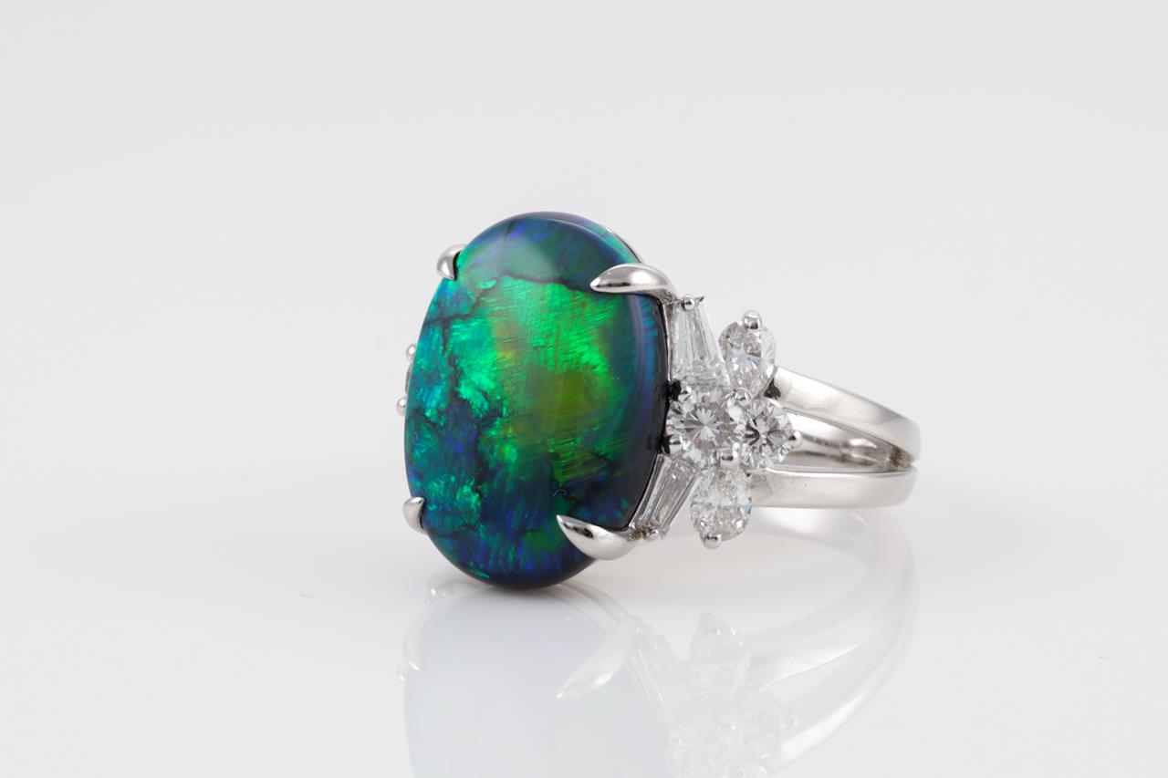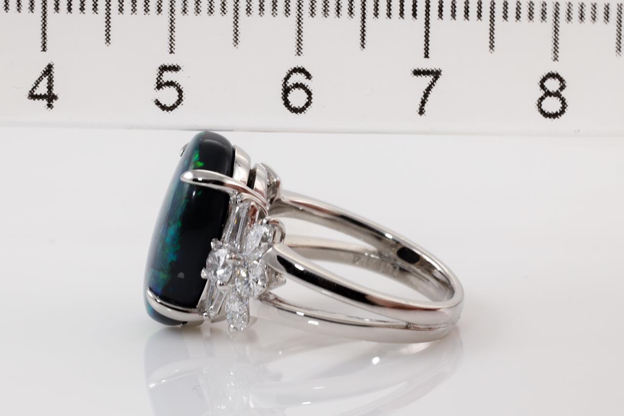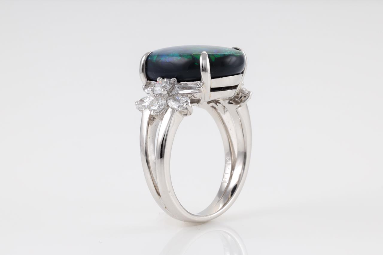 Opal and Diamond ring with oval cut Black Opal of 6.70ct and Diamonds totalling 1.14cts (Estimated grading: F-G VS). Platinum. Ring size: L1/2. Weight: 9.93g. With Certificate #413797. (Pre-owned)