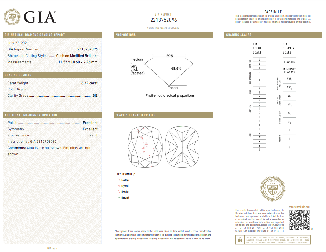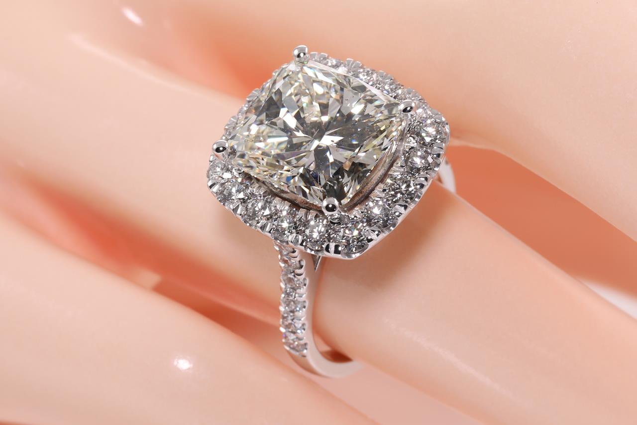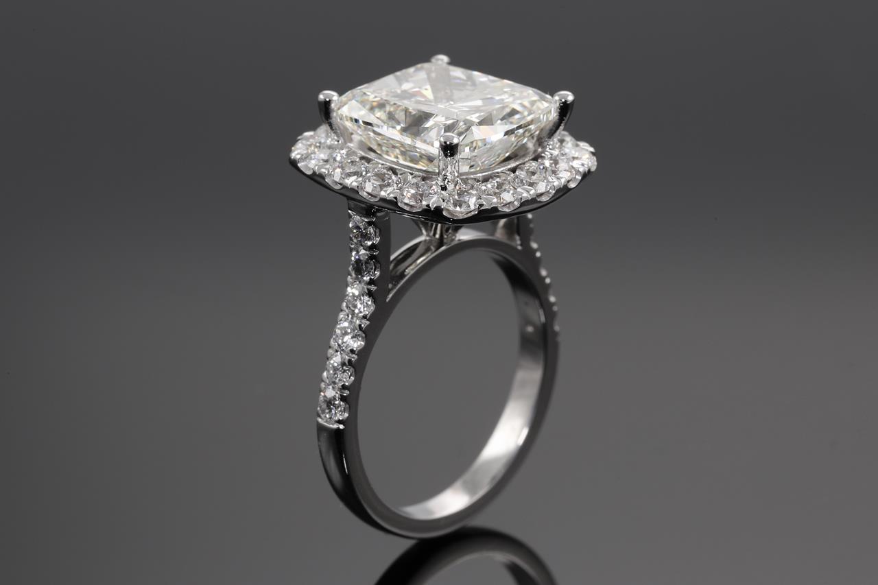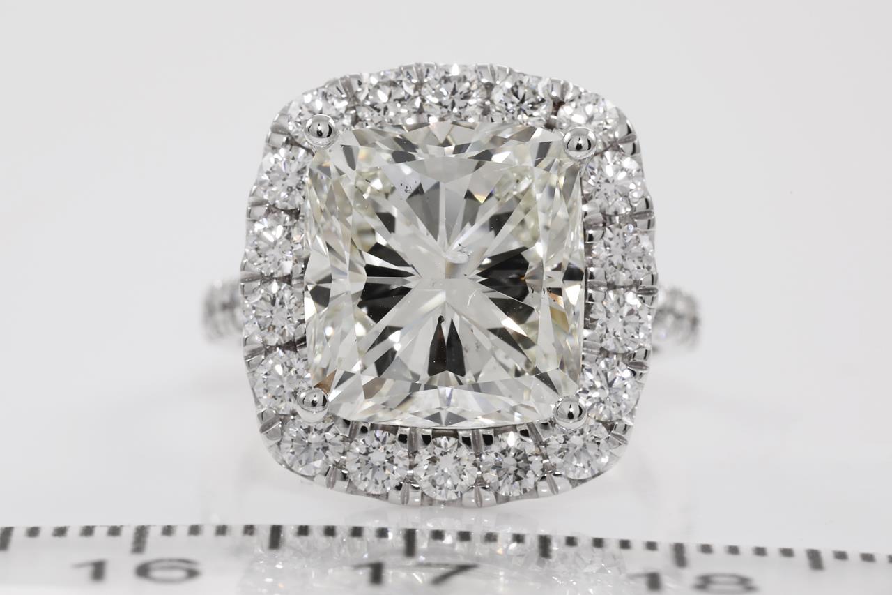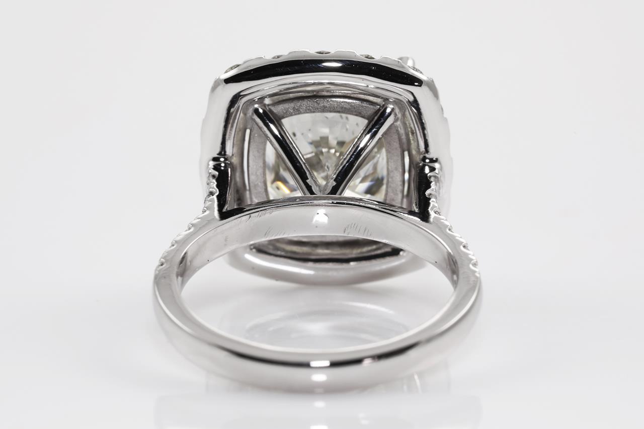 Diamond halo ring with centre Cushion cut Diamond of 6.72cts (With GIA report graded as L SI2 #2213752096) with surrounding diamonds totalling 1.40cts (Estimated grading: G-H VS-SI). Ring size: M. 18ct white gold. Weight: 8.5g. (New)