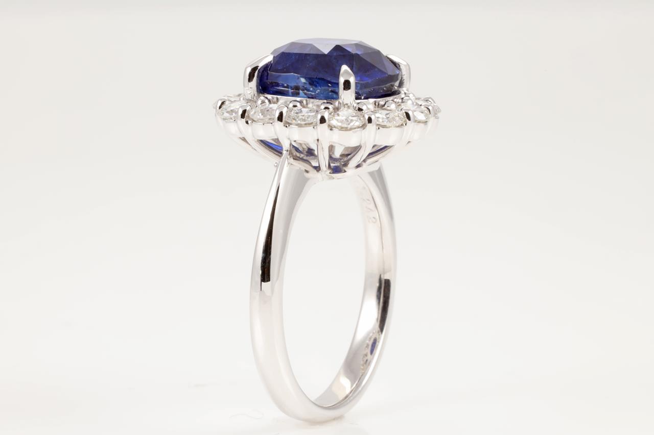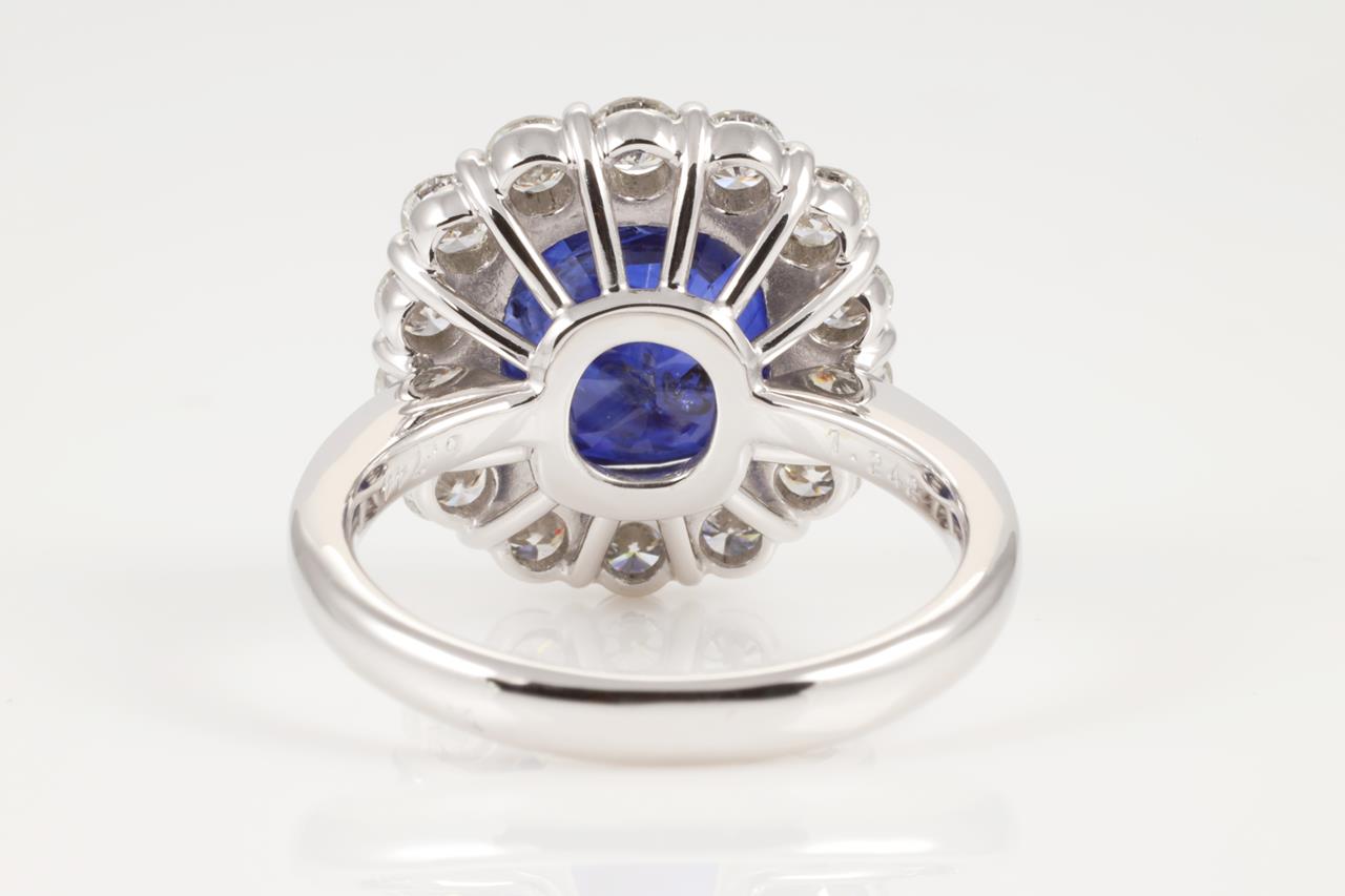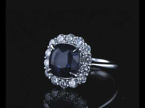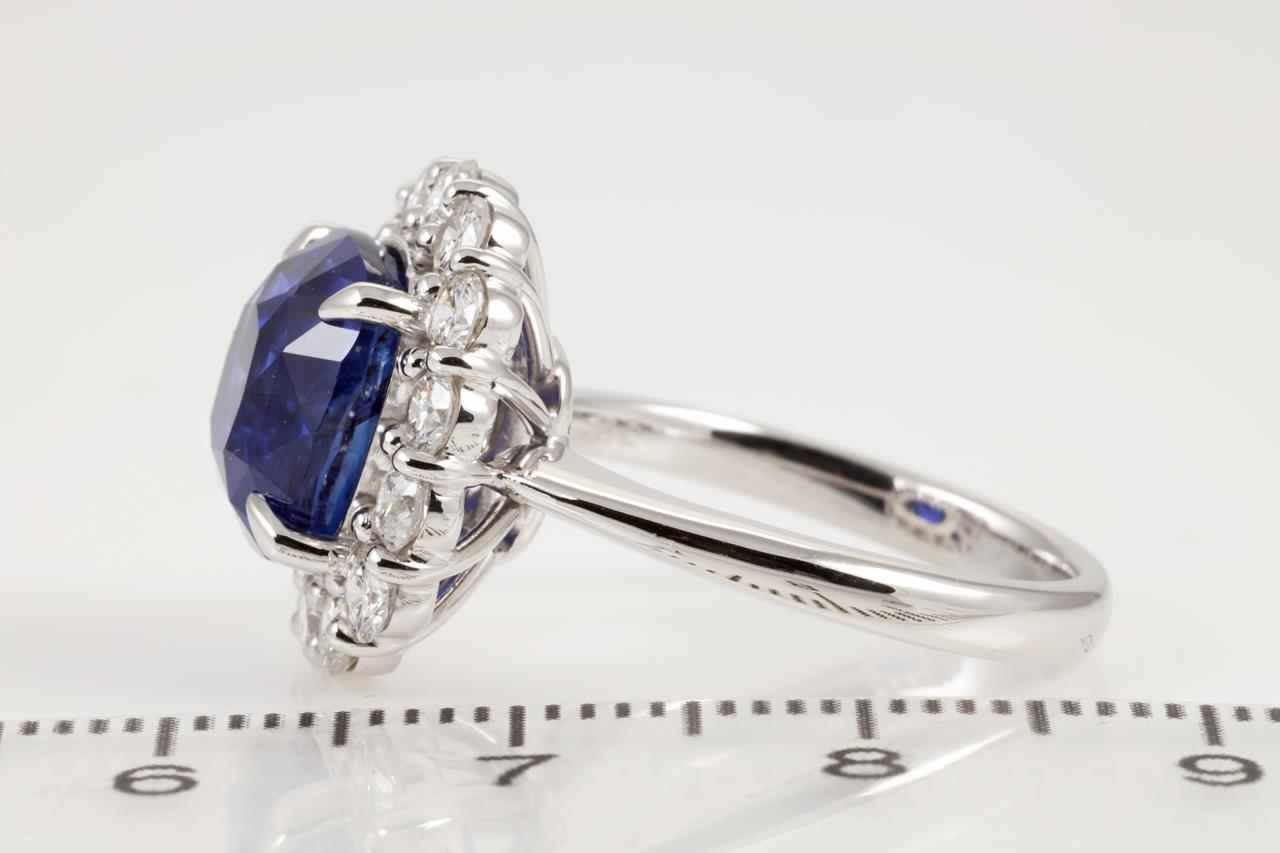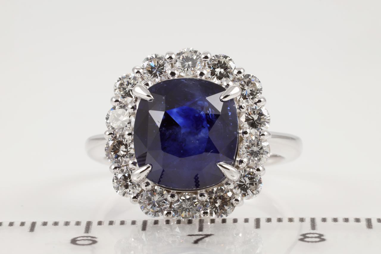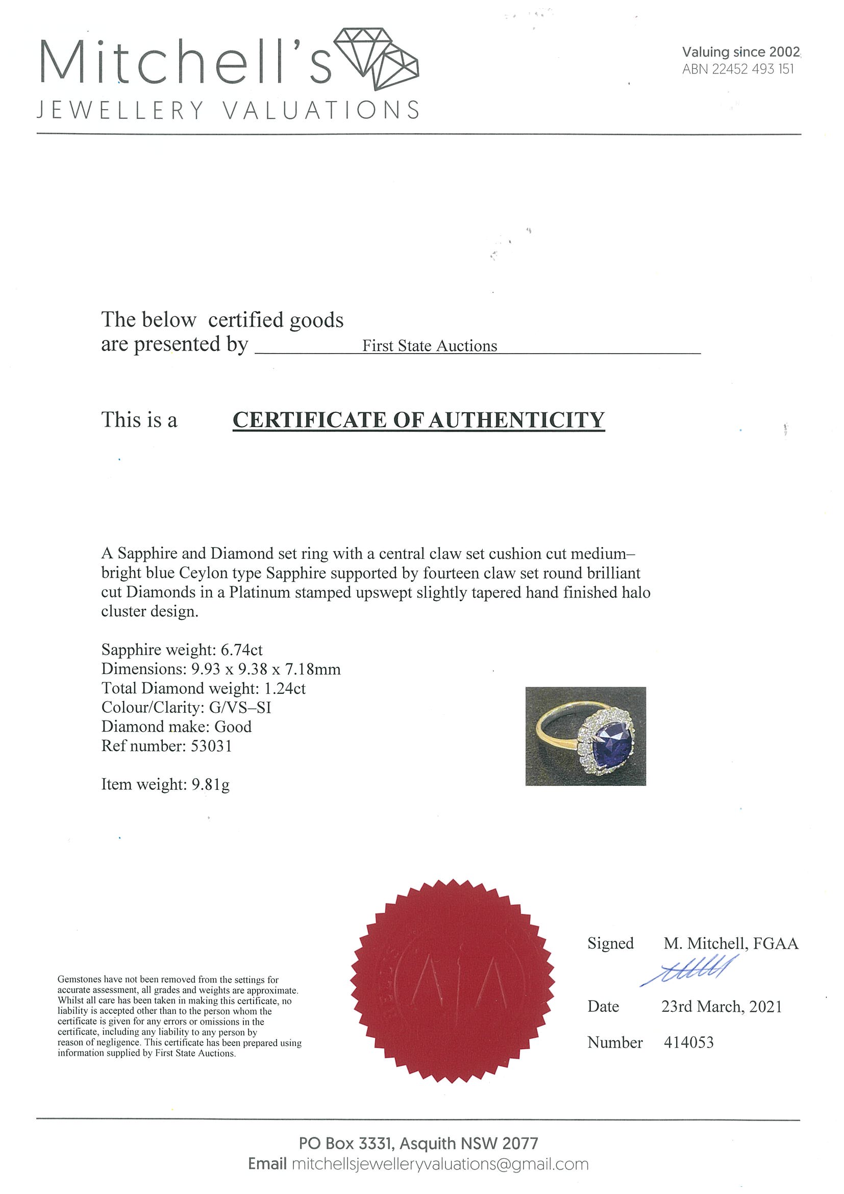 Sapphire and Diamond ring with a cushion cut blue Ceylon Sapphire of 6.74ct and round Diamonds totalling 1.24cts (Estimated grading: G VS-SI). Platinum. Ring size L1/2. Weight: 9.8g. With certificate: #414053. (Pre-owned)