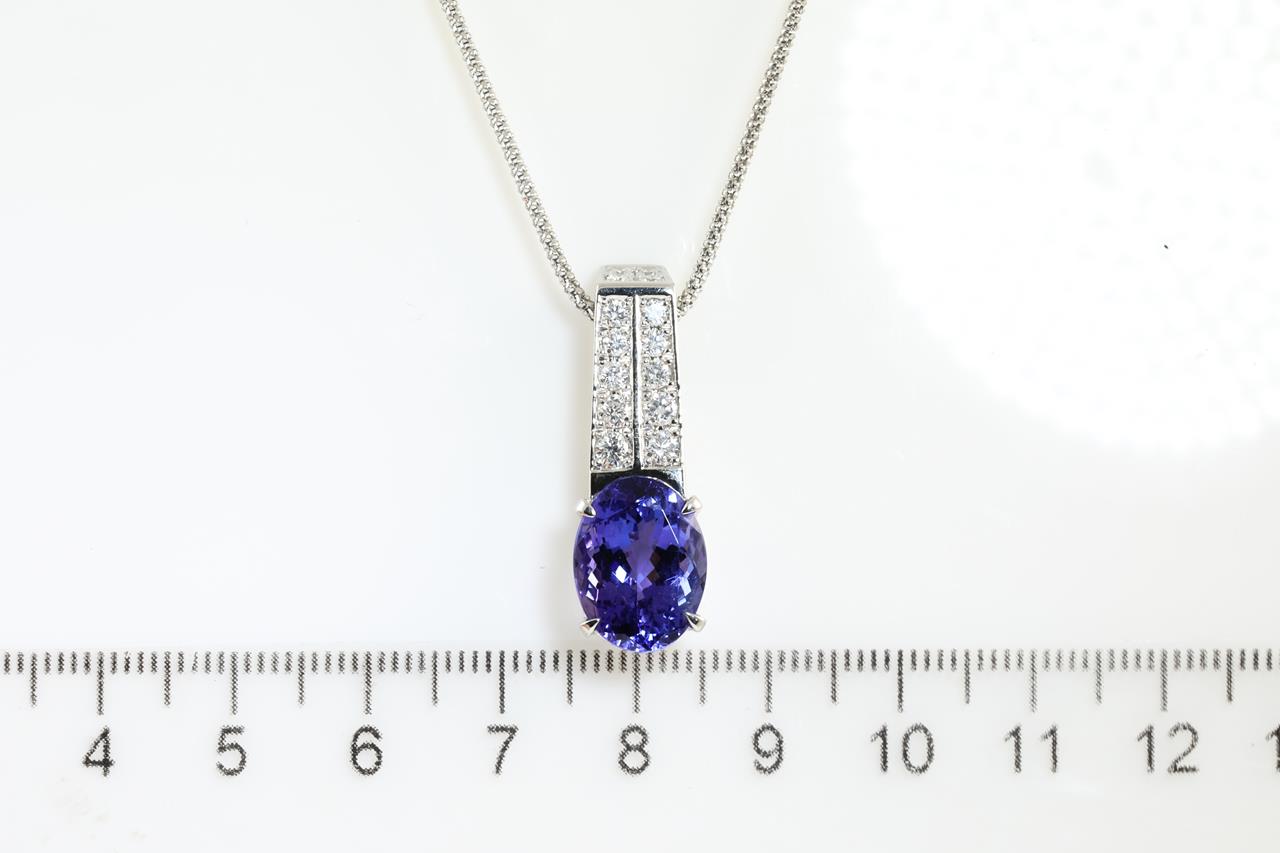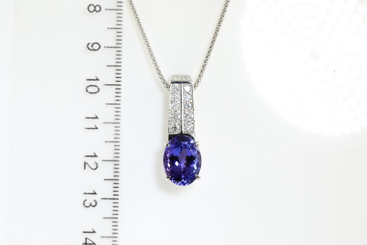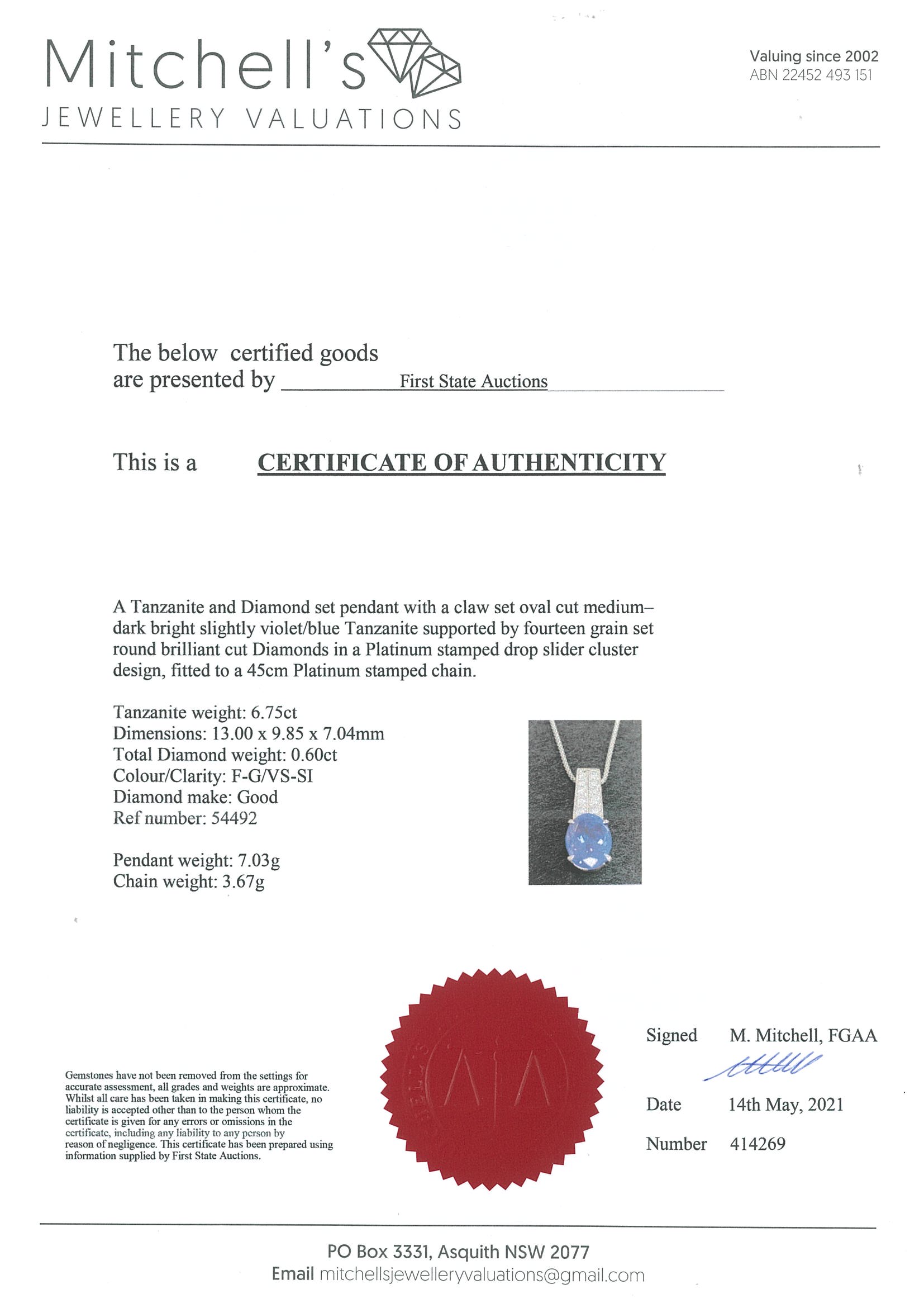 Tanzanite and Diamond pendant with oval cut Tanzanite of 6.75ct and Diamonds totalling 0.60cts (Estimated grading: F-G VS-SI). Platinum with 46cm adjustable chain. Weight: 10.7g. With Certificate #414269 (Pre-owned).