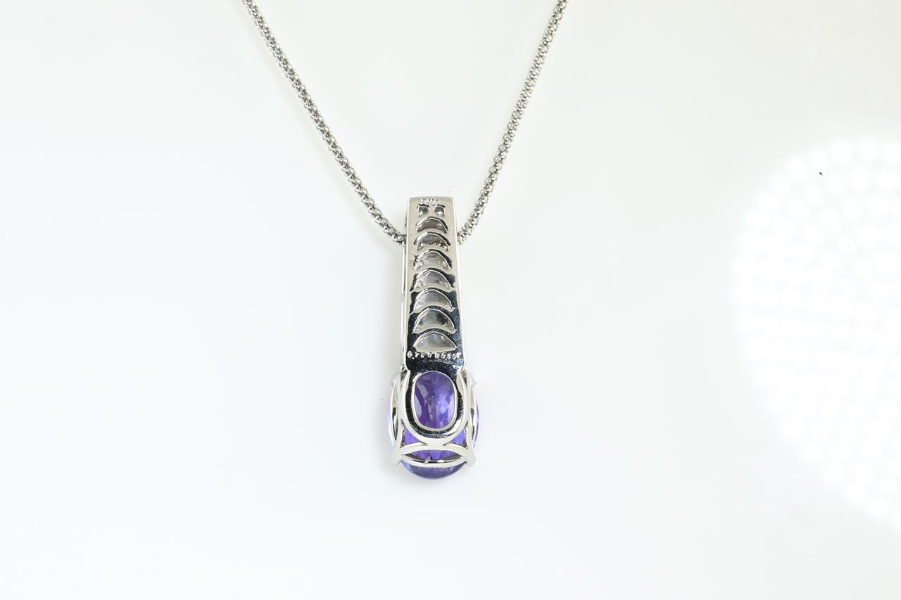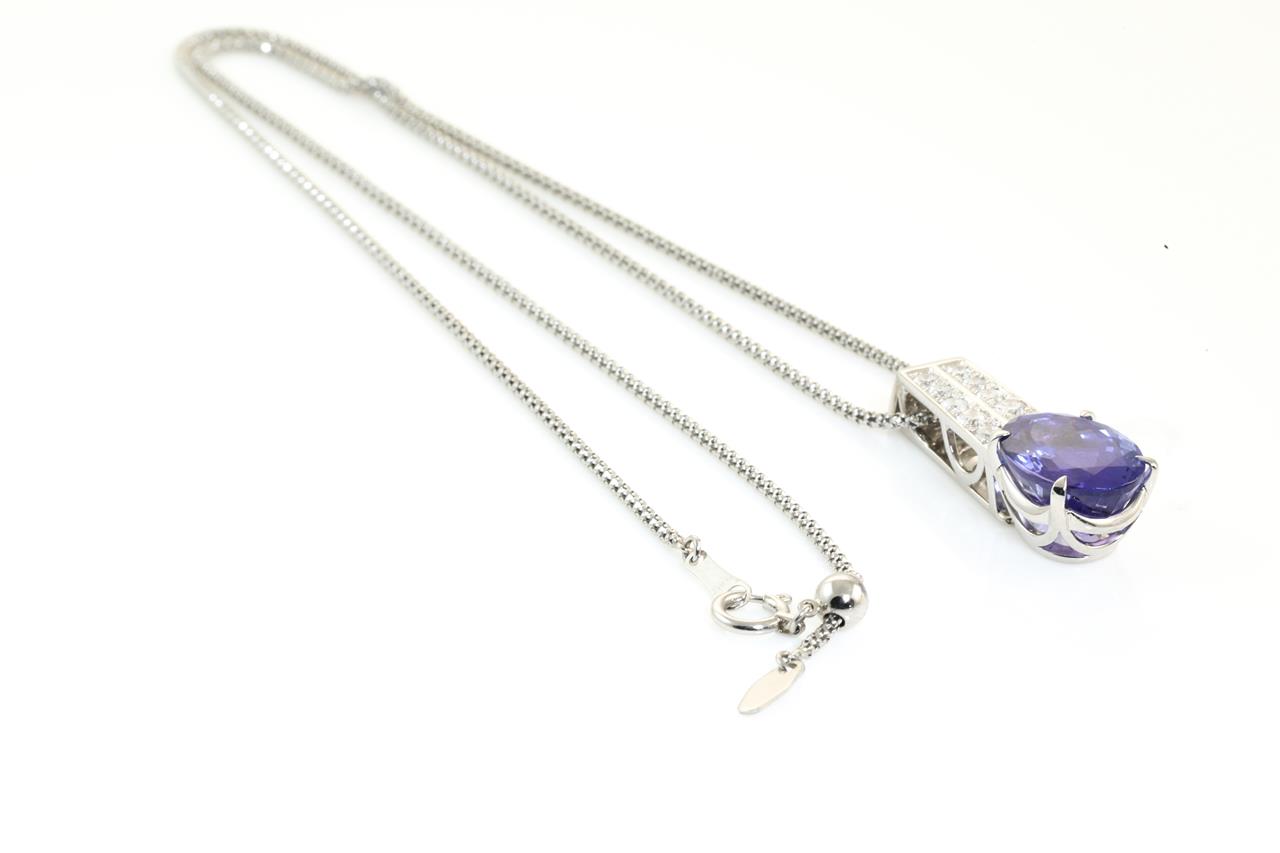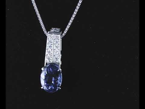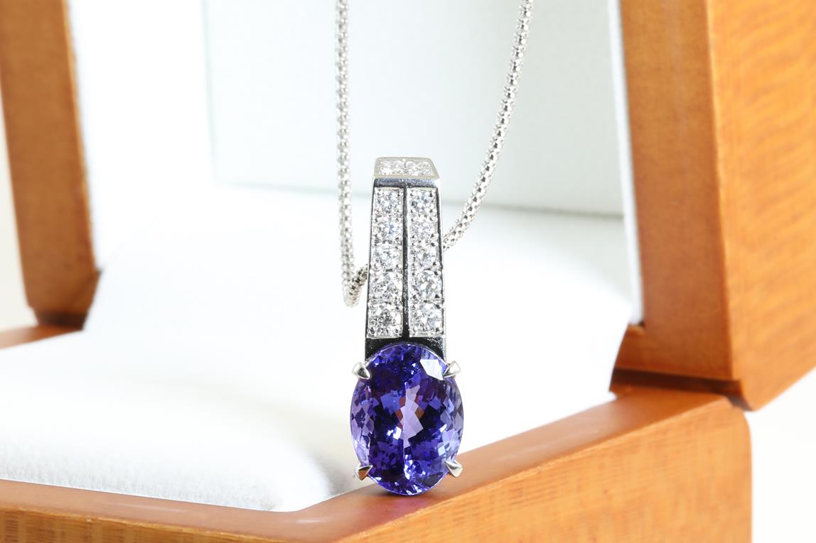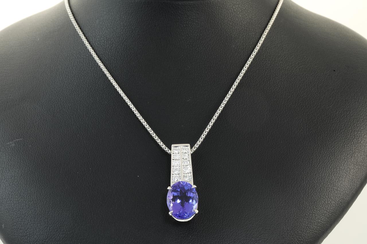 Tanzanite and Diamond pendant with oval cut Tanzanite of 6.75ct and Diamonds totalling 0.60cts (Estimated grading: F-G VS-SI). Platinum with 46cm adjustable chain. Weight: 10.7g. With Certificate #414269 (Pre-owned).