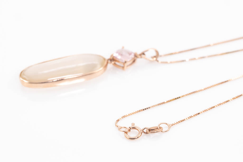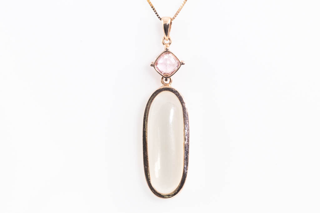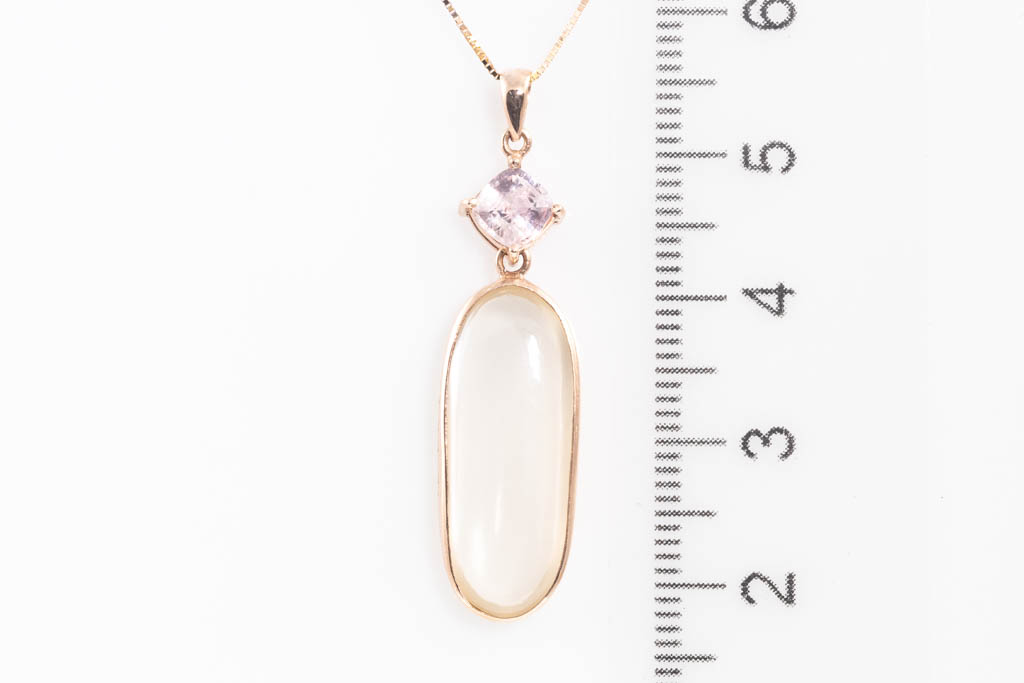 Moonstone and Sapphire pendant with oval cabochon cut Moonstone of 6.77ct and a cushion cut light pink unheated Padparadscha Sapphire of 0.67cts. 18ct rose gold with 18ct rose gold 44cm chain. With GGTL Certificate #157717. Weight: 3.8g (As new)