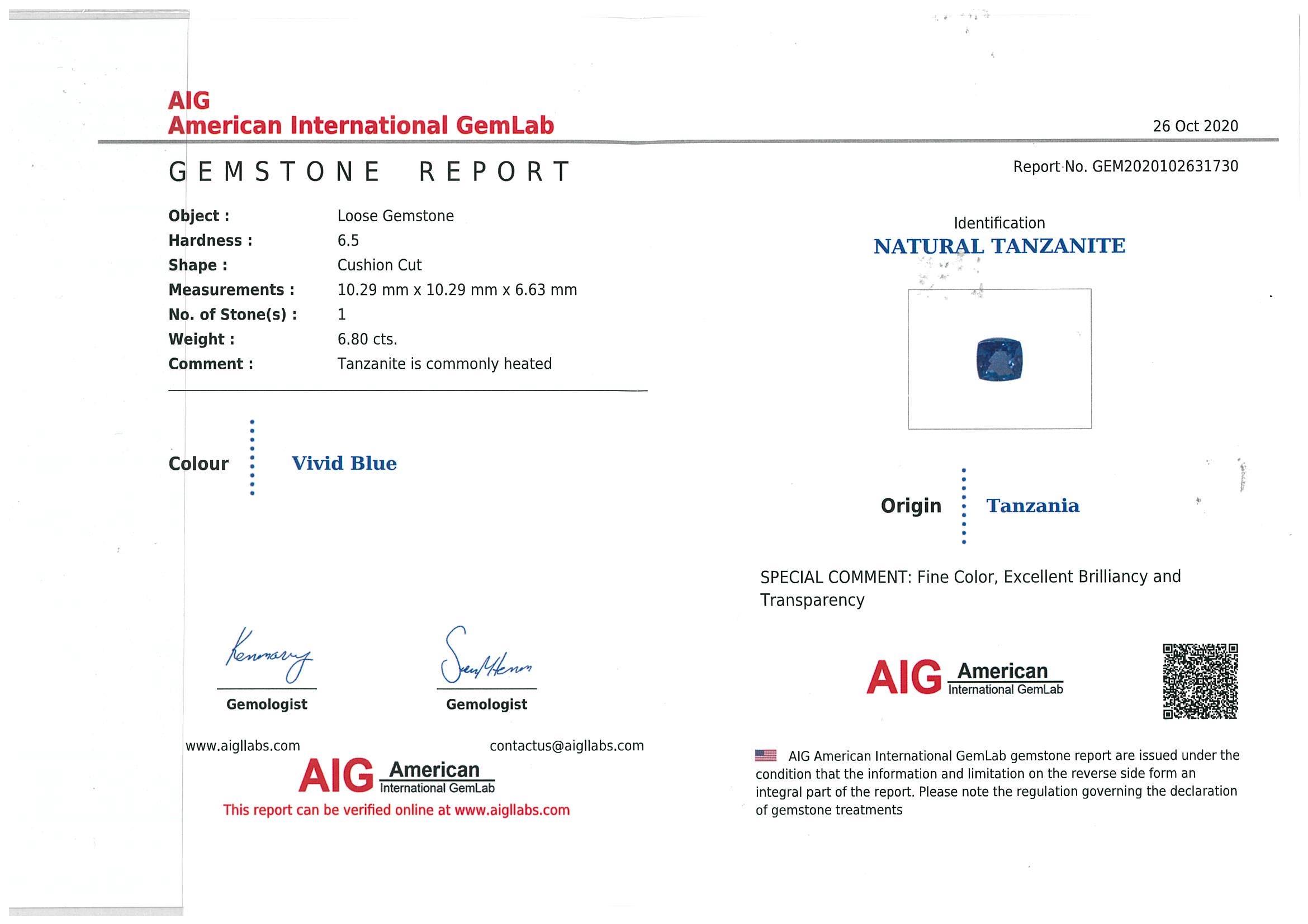 A loose Cushion cut Natural Tanzanite of 6.80ct (with AIG report #GEM2020102631730). Size: 10.2 x 10.2 x 6.6mm. (New)