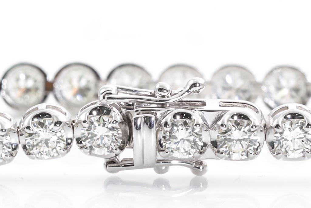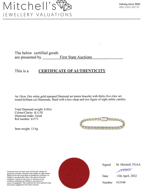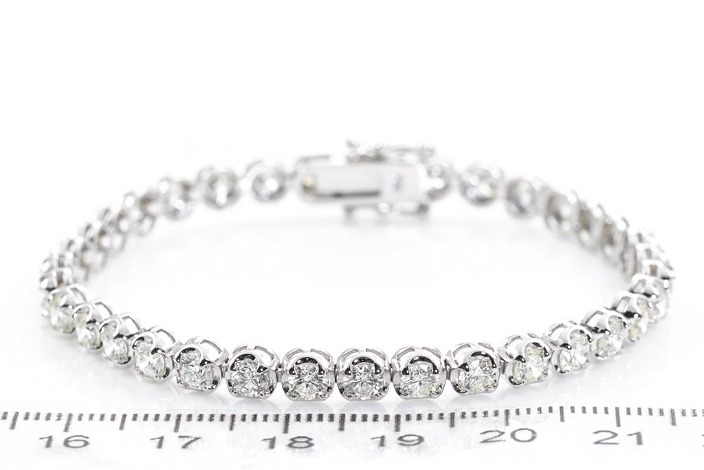 Diamond tennis bracelet with 35 round Diamonds totalling 6.83cts (Estimated grading: K-L SI). 18ct white gold. Length: 18cm. Weight: 13.4g. With certificate #415548. (New)