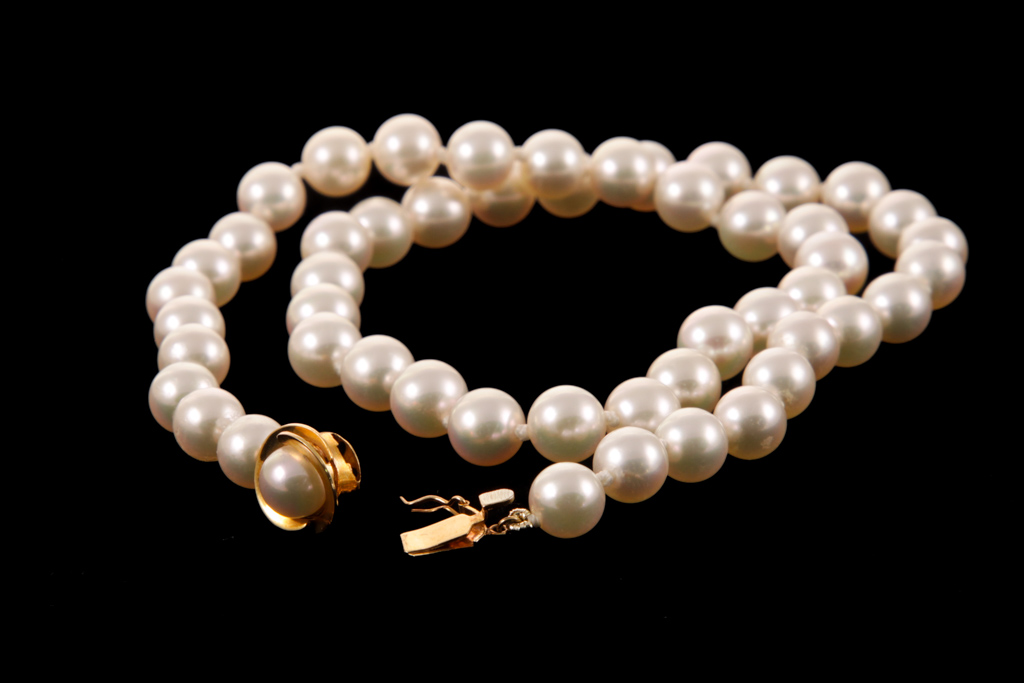 Pearl necklace with 50 Akoya Pearls of 6.9-7.5mm. 18ct yellow gold clasp with an Akoya Pearl of 6.6mm. Length: 42cm. Weight: 29.2g. (Pre-owned)