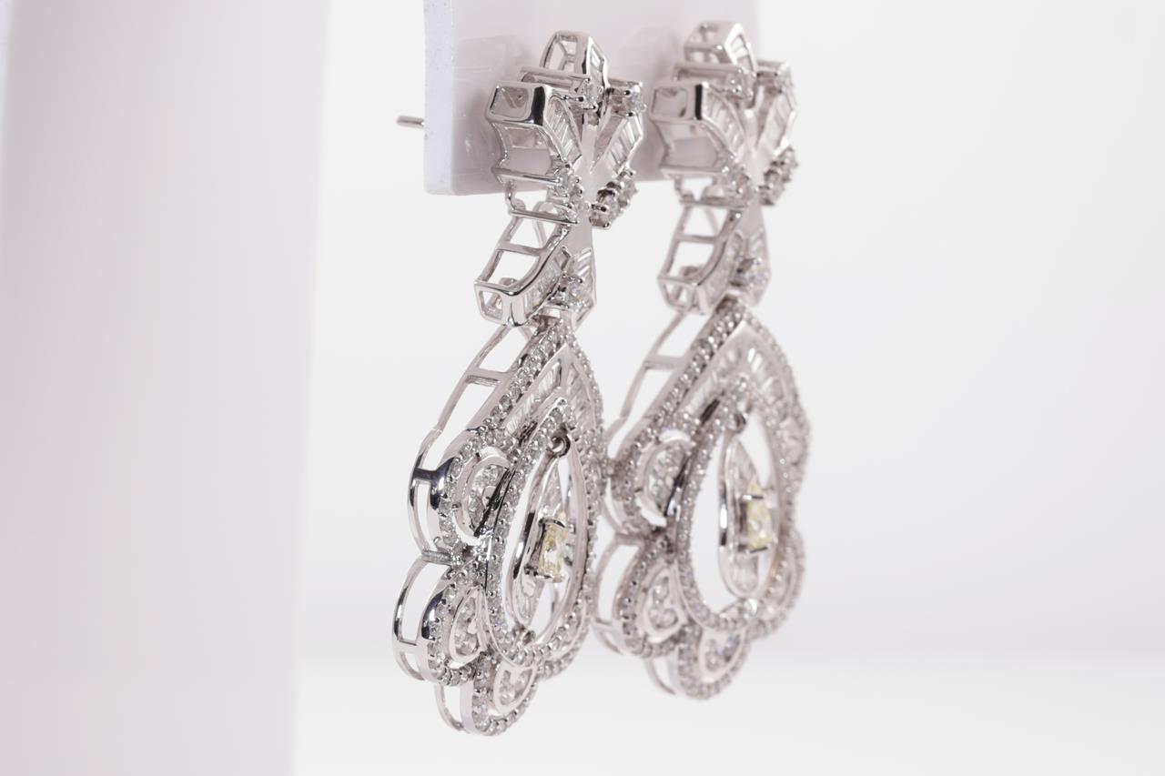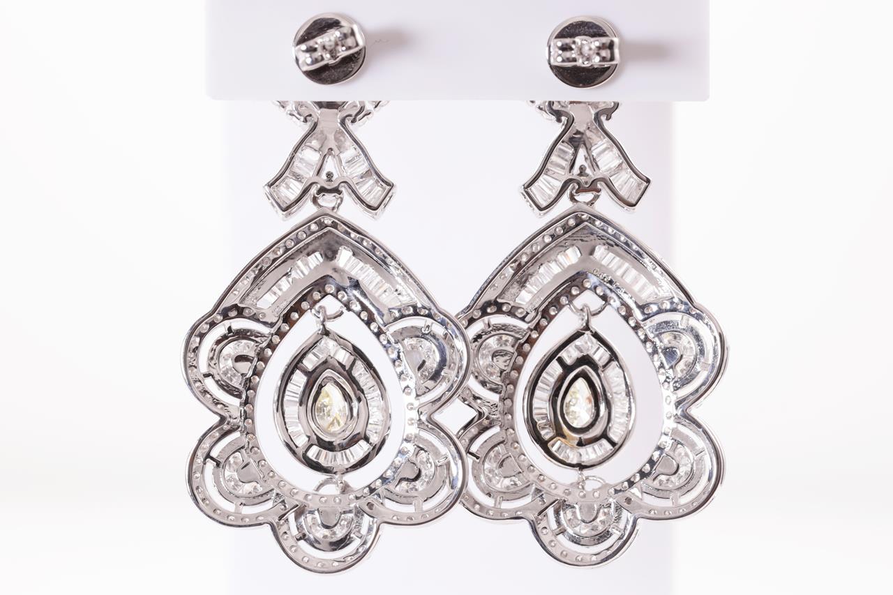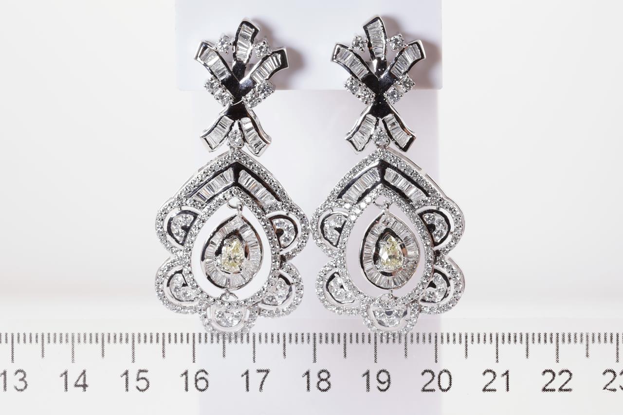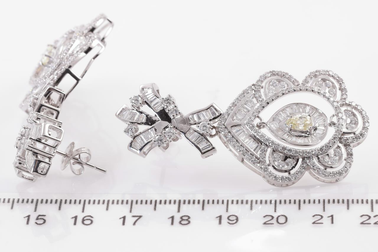 Diamond earrings with 2 centre pear shape Diamonds totalling 0.63cts (Estimated grading: Fancy Yellow SI) and remaining round & baguette cut Diamonds totalling 6.30cts (Estimated grading: G-H SI). 18ct white gold. Weight: 23.5g. With certificate #415081. (Pre-owned)