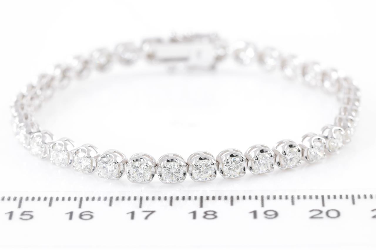 Diamond tennis bracelet with 35 round Diamonds totalling 6.97cts (Estimated grading: H-I SI). 18ct white gold. Length: 18.5cm. Weight: 13g. With certificate #414810. (New)