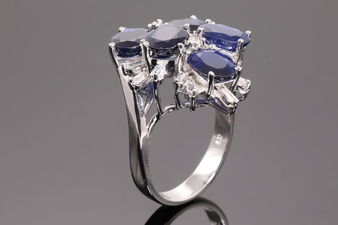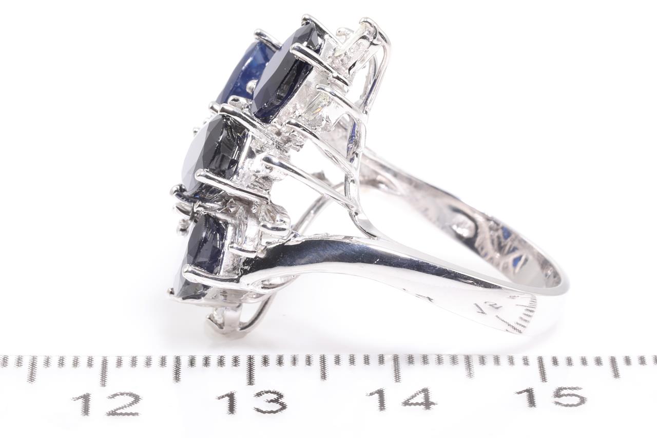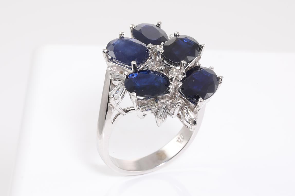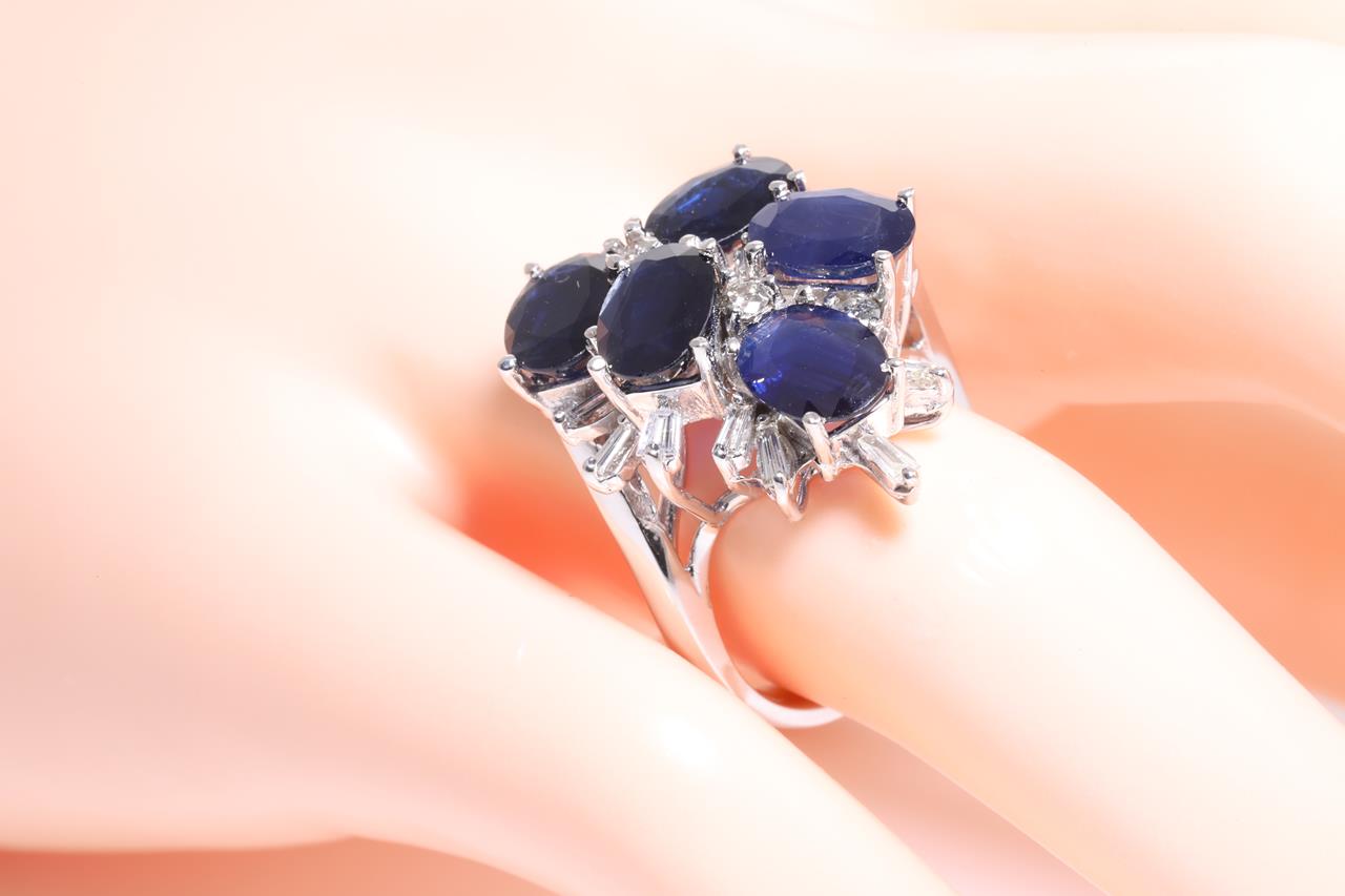 Sapphire and Diamond Ring with 5 oval shape blue Sapphire totalling approximately 7.04ct and round & baguette cut Diamonds totalling approximately 0.58cts. (Estimated grading: H-I SI-P1) 14ct white gold. Ring size N. Weight 9.4g. (Pre-owned)