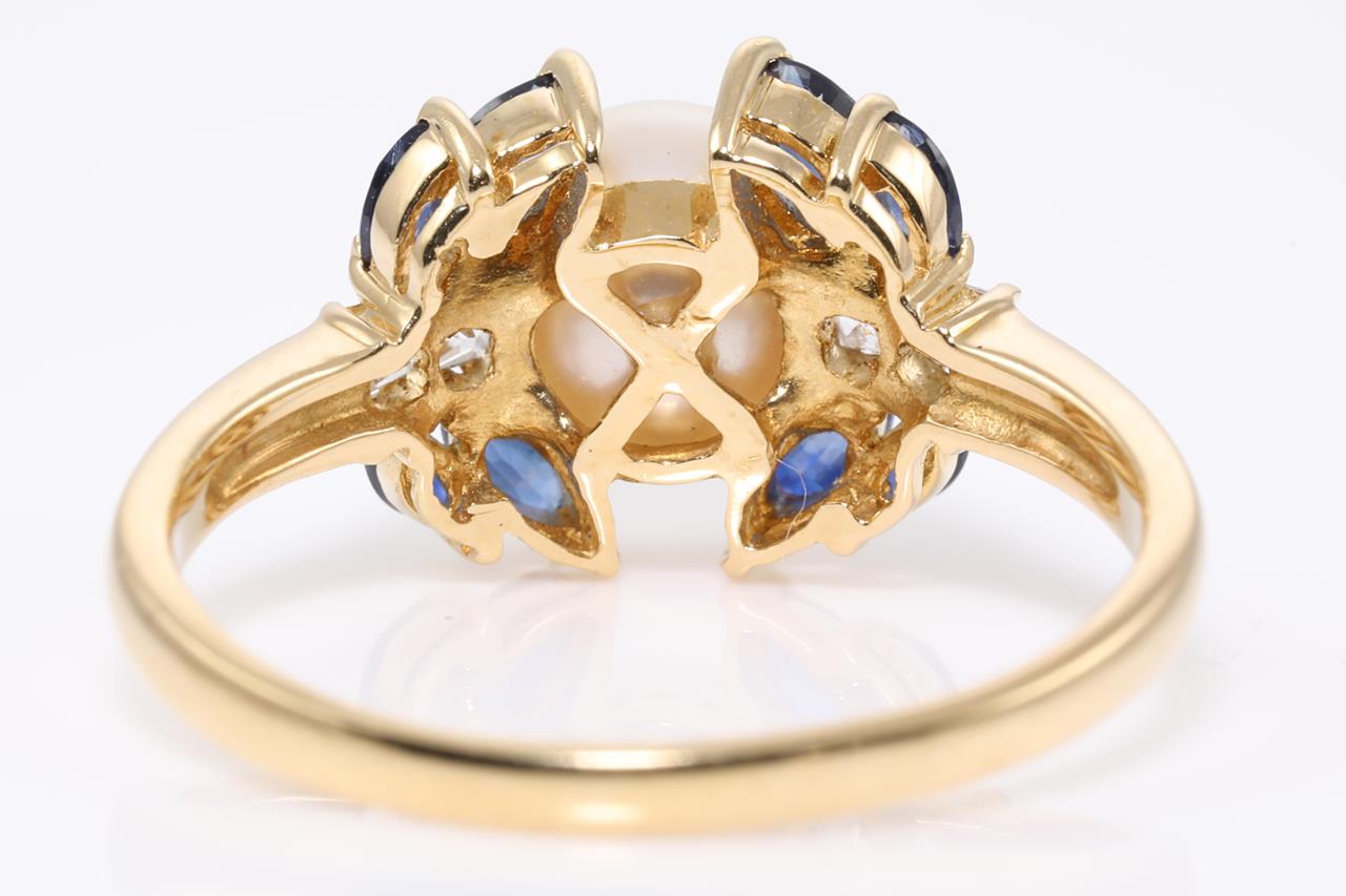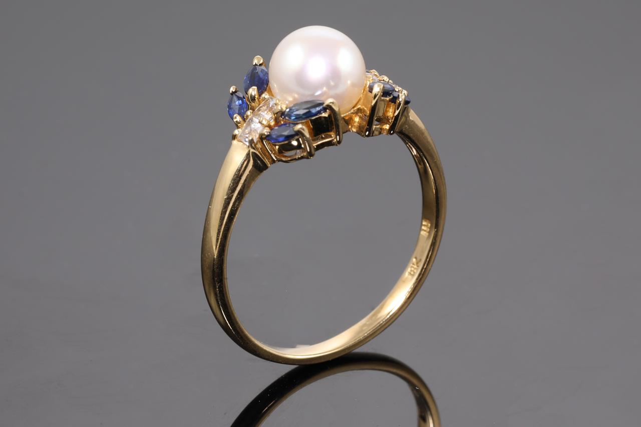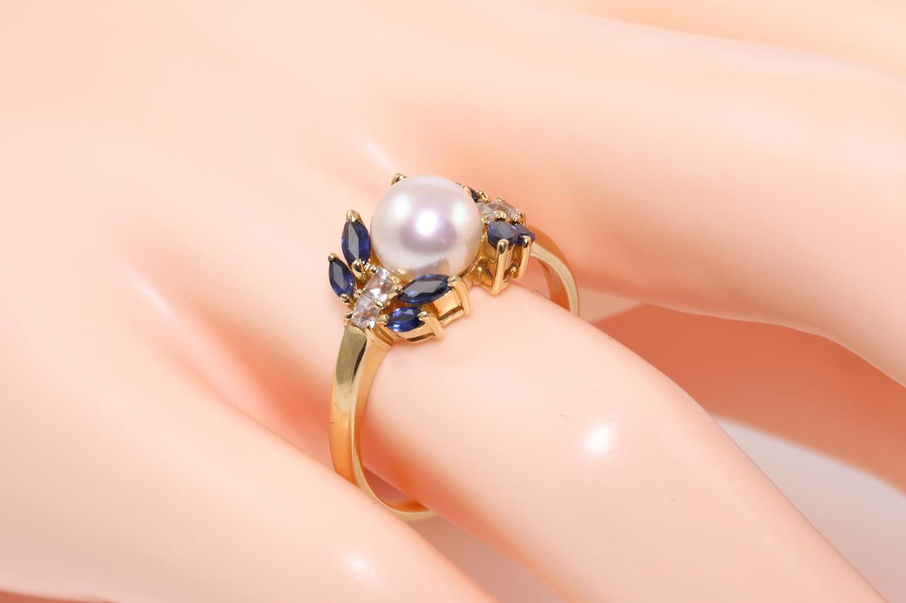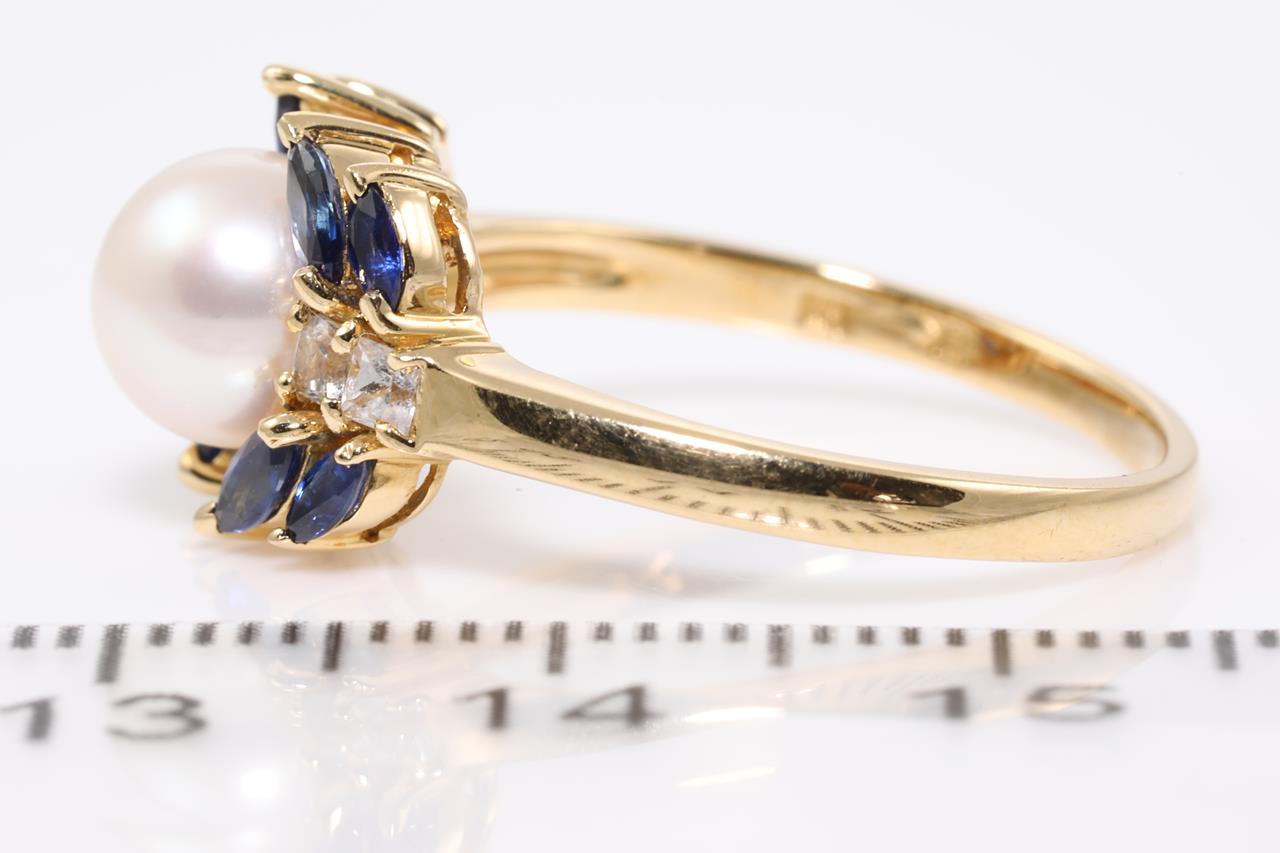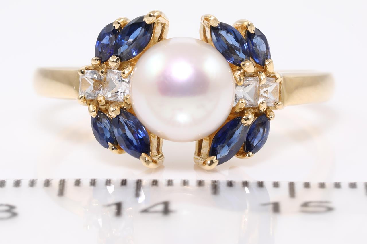 Pearl and Sapphire ring with Akoya Pearl of 7.0mm, marquise cut blue Sapphires & princess cut Diamonds totalling approximately 0.16cts. 18ct yellow gold. Ring size O1/2. Weight: 3.9g (Pre-owned)
