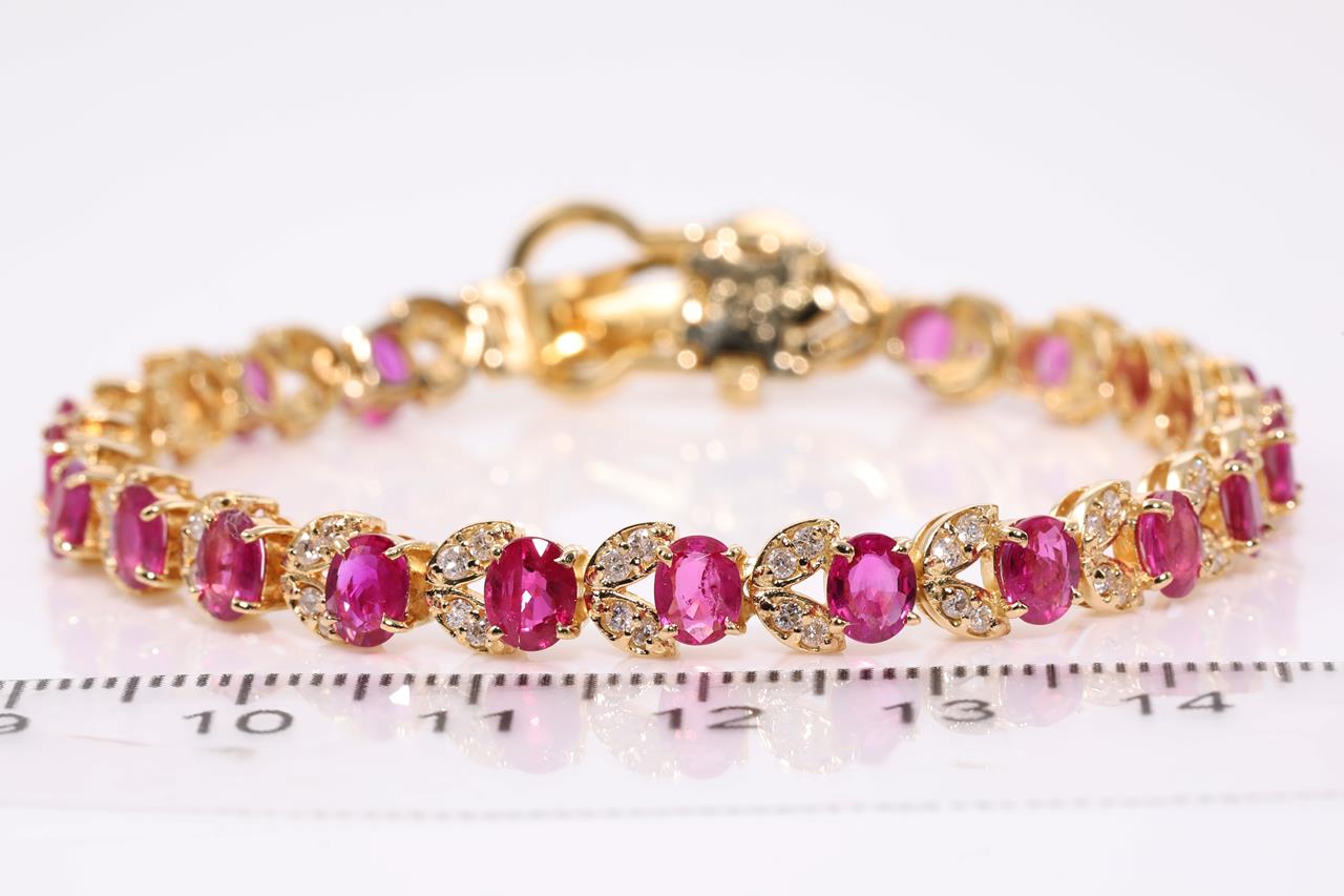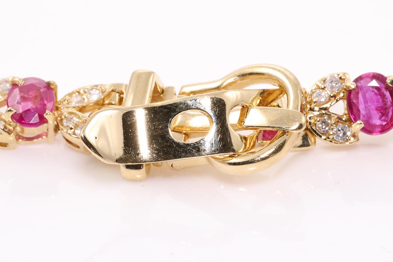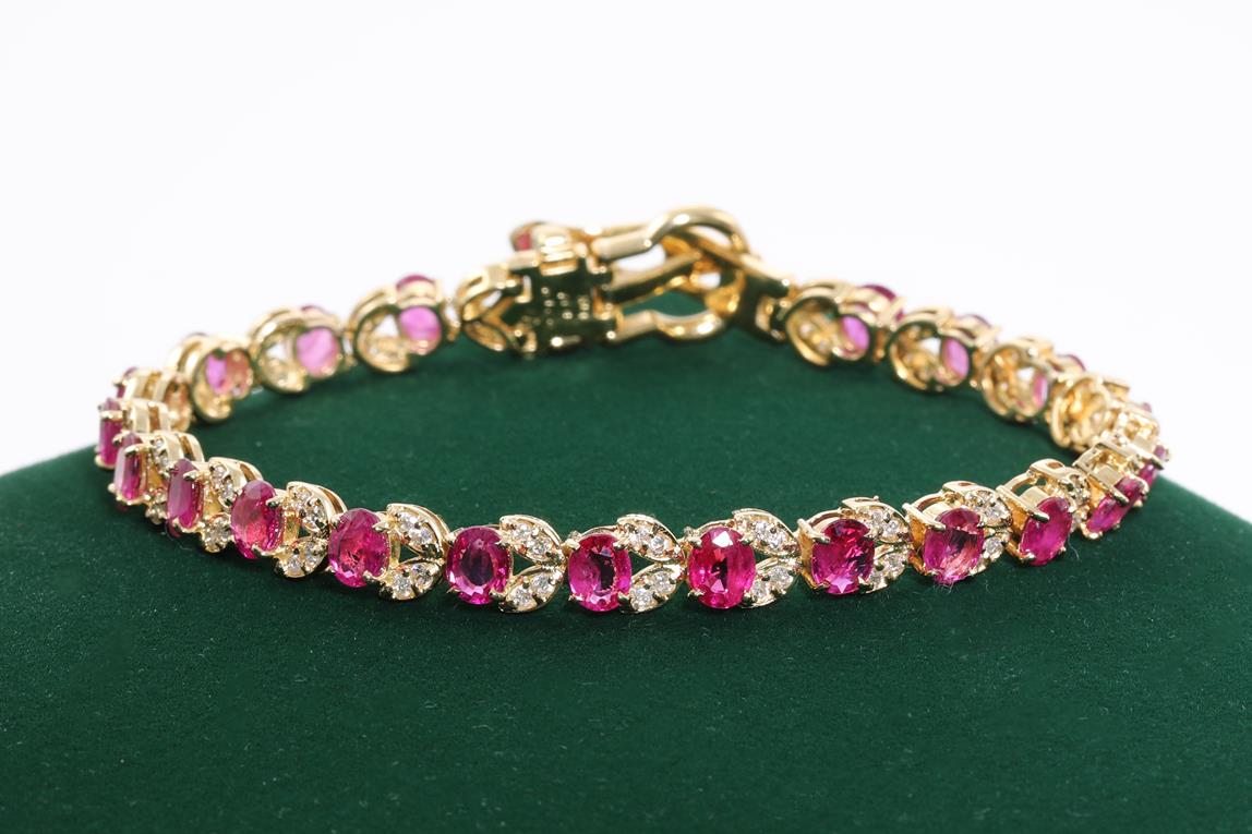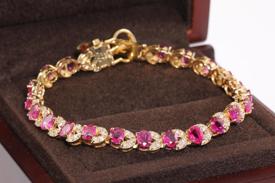 Ruby and Diamond bracelet with oval Rubies totalling 7.18cts and Diamonds totalling 1.00cts (Estimated grading: H-I SI). Buckle closure. 18ct yellow gold. Length: 18cm Weight: 17.4g. With certificate #414506. (Pre-owned)