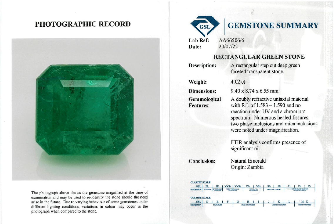 Emerald and Diamond earrings with Emerald cut Emeralds totalling 7.24cts (both with GSL summary reports #AA66506/5, AA66506/6) and Diamonds totalling 0.40cts (Estimated grading: H SI-P1). 18ct yellow gold. Weight: 5.3Ag. (As new)