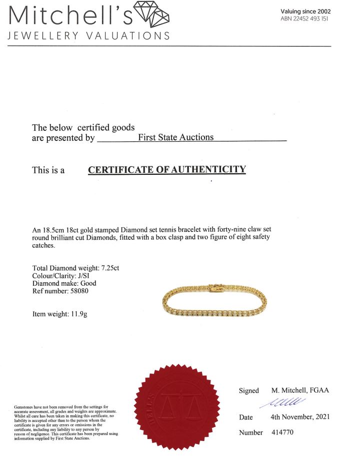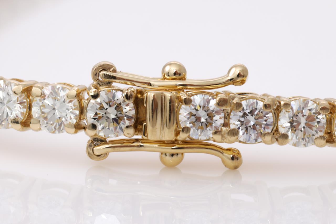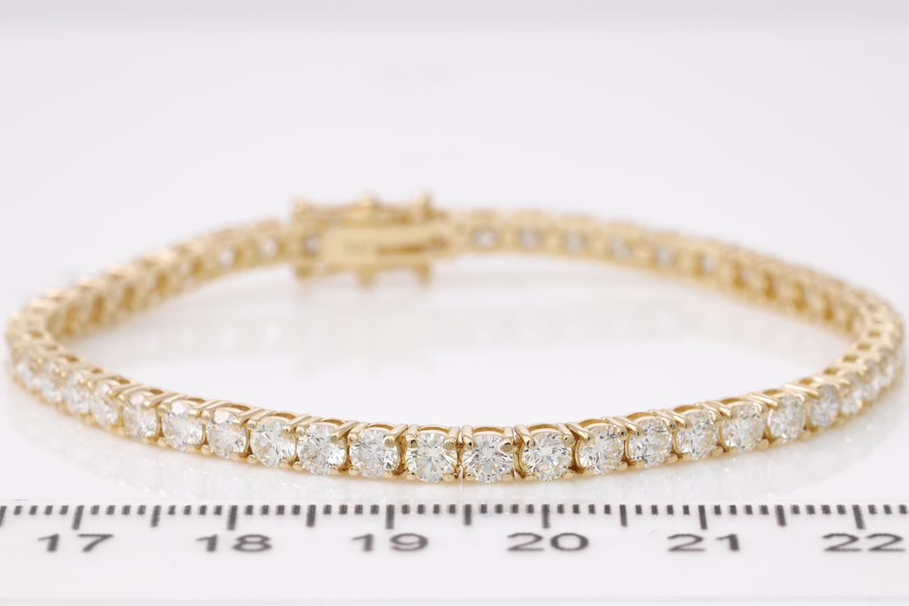 Diamond tennis bracelet with 49 round Diamonds totalling 7.25cts (Estimated grading: J SI). 18ct yellow gold. Length: 18.5cm. Weight: 11.9g. With certificate #414770. (New)