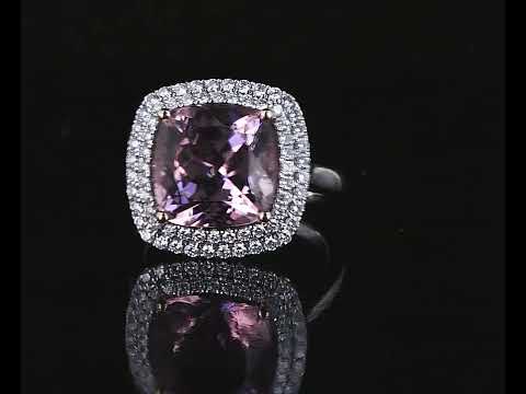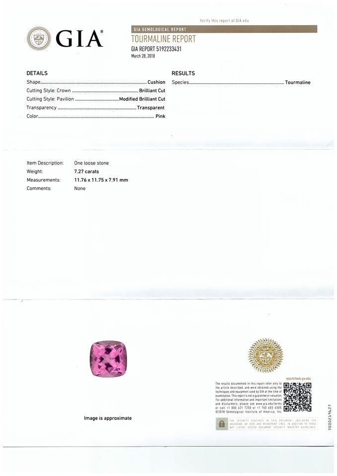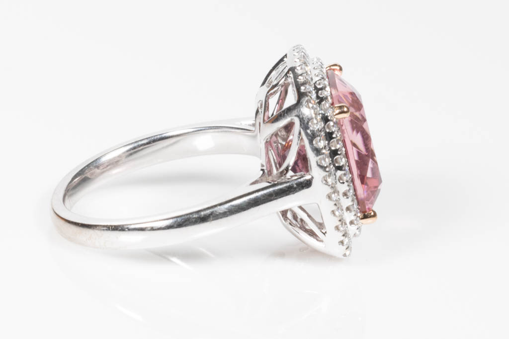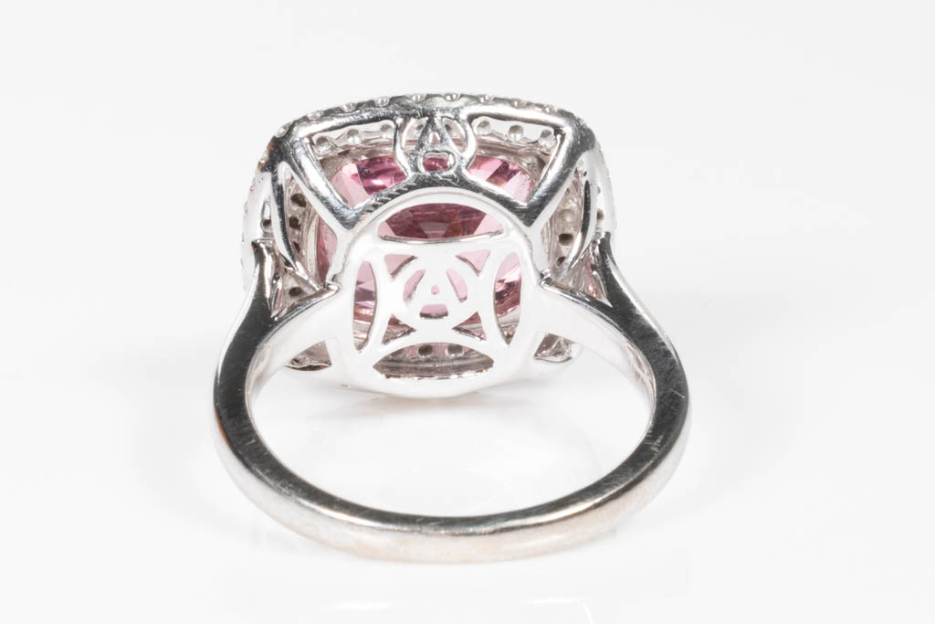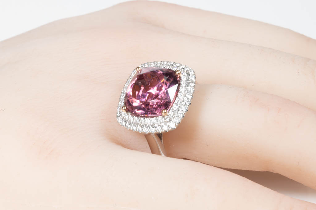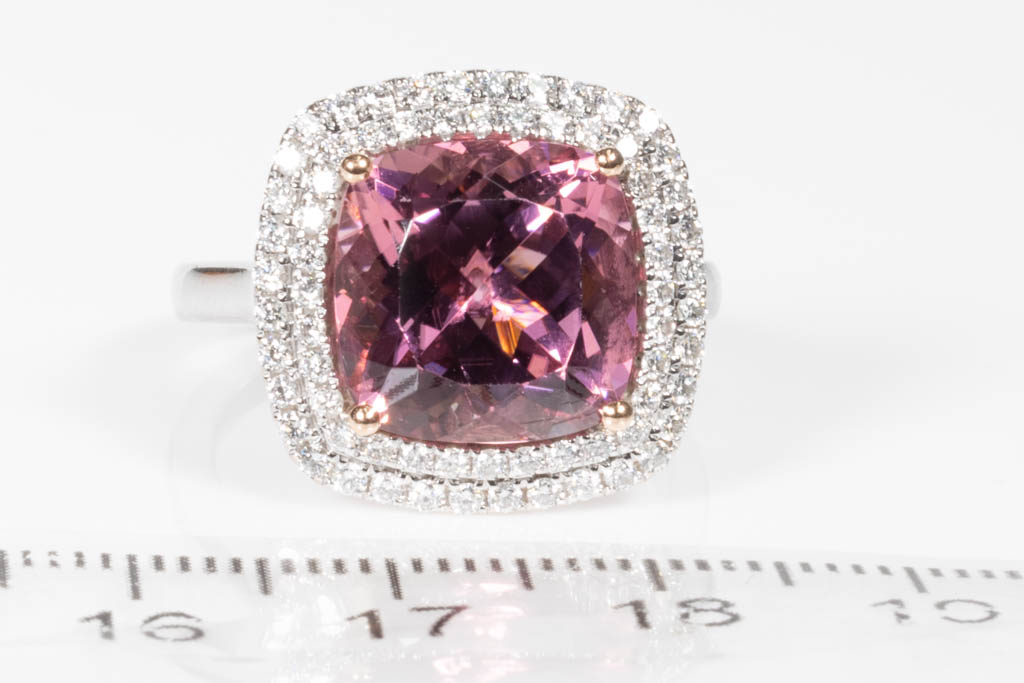 Tourmaline and Diamond double halo ring with cushion cut pink Tourmaline of 7.27ct (With GIA report #5192233431) and round Diamonds totalling approximately 0.60cts (Estimated grading: G VS-SI). 18ct white and rose gold. Weight 9.8g. (Pre-owned)