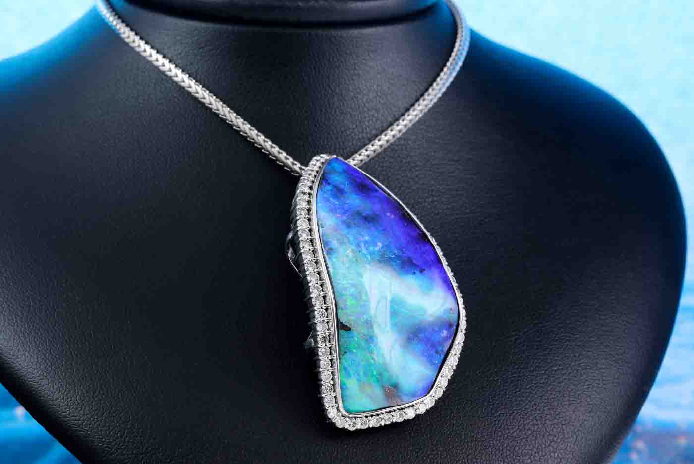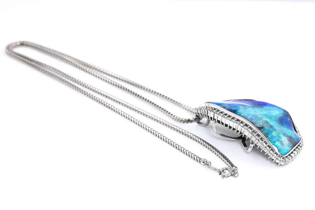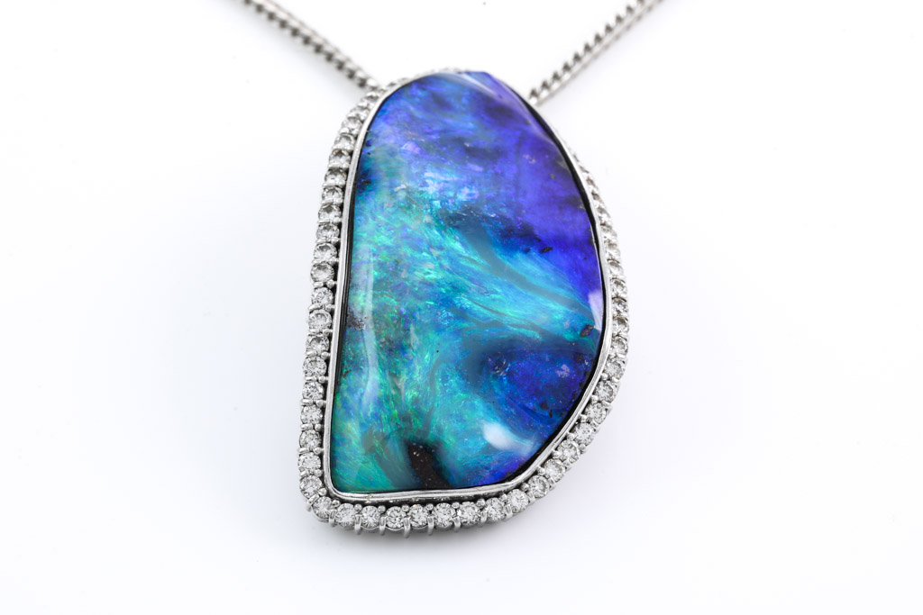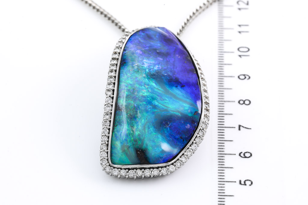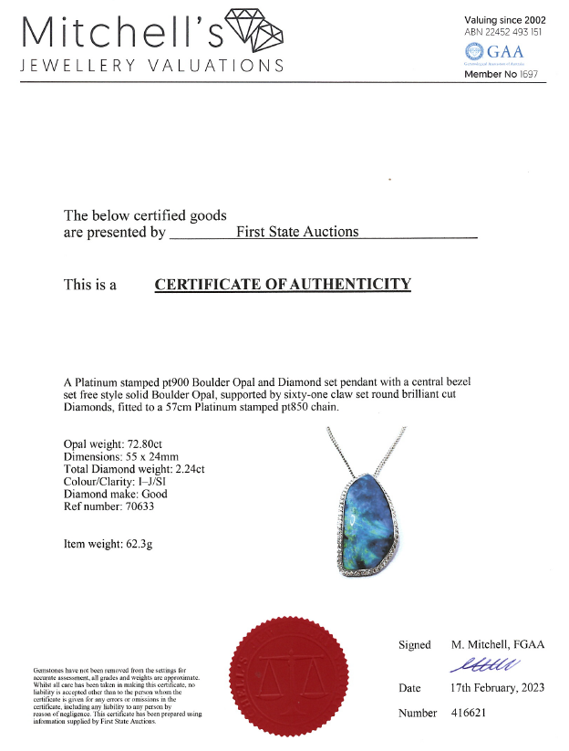 Opal and Diamond pendant with freestyle solid Boulder Opal of 72.80ct and round Diamonds totalling 2.24cts (Estimated grading: I-J SI). Platinum with 57cm platinum chain. Weight: 62.3g. With certificate #416621. (Pre-owned)