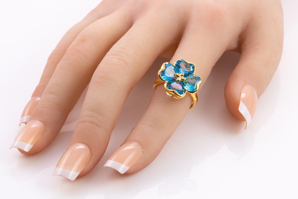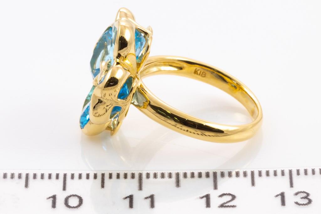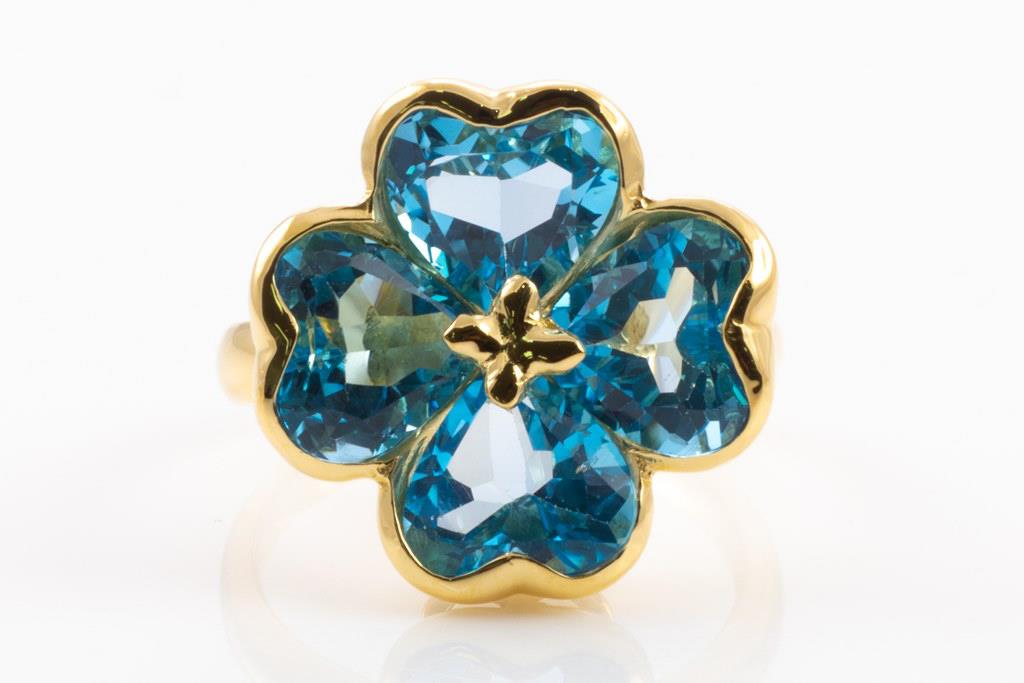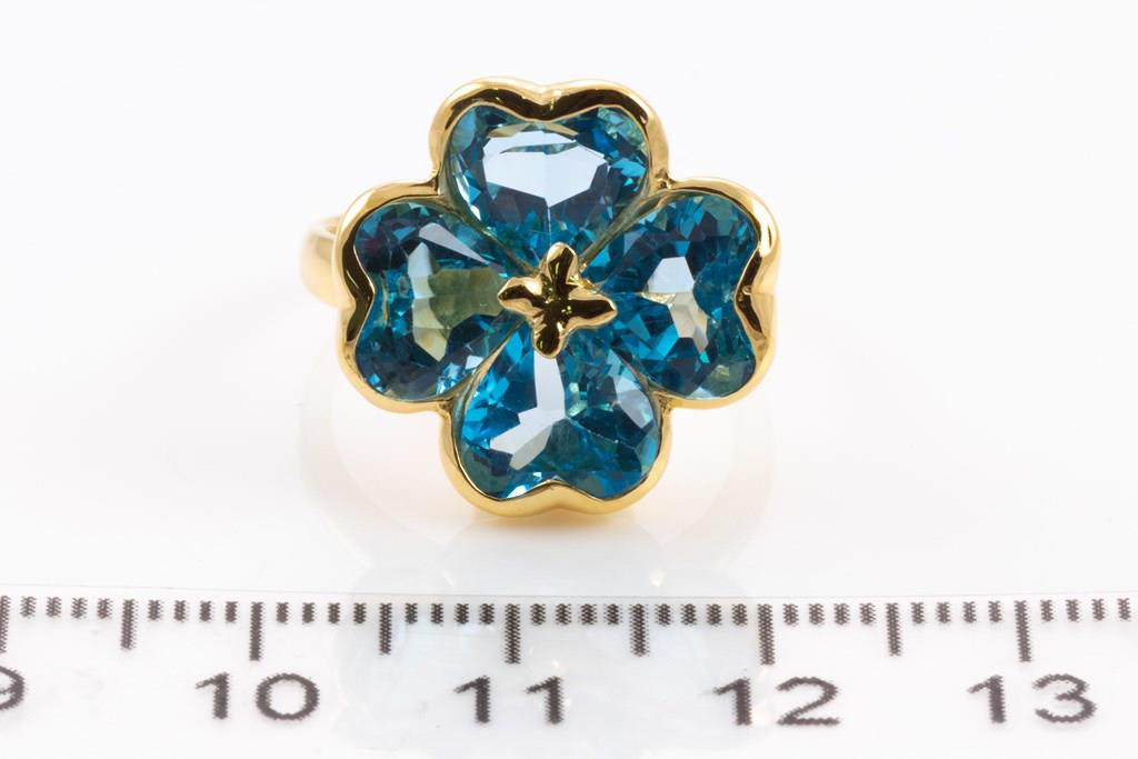 Topaz ring with 4 x heart shape Blue Topazs totalling approximately 7.28cts. 18ct yellow gold. Ring size K1/2. Weight: 7.7g. (Pre-owned)