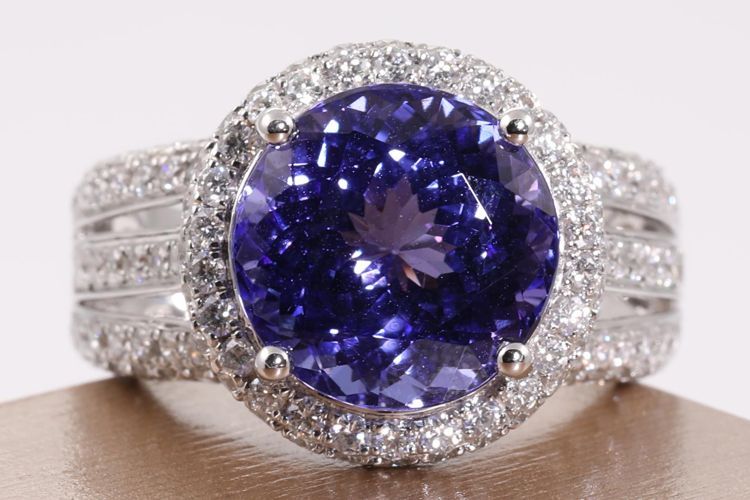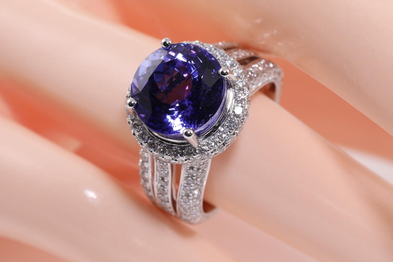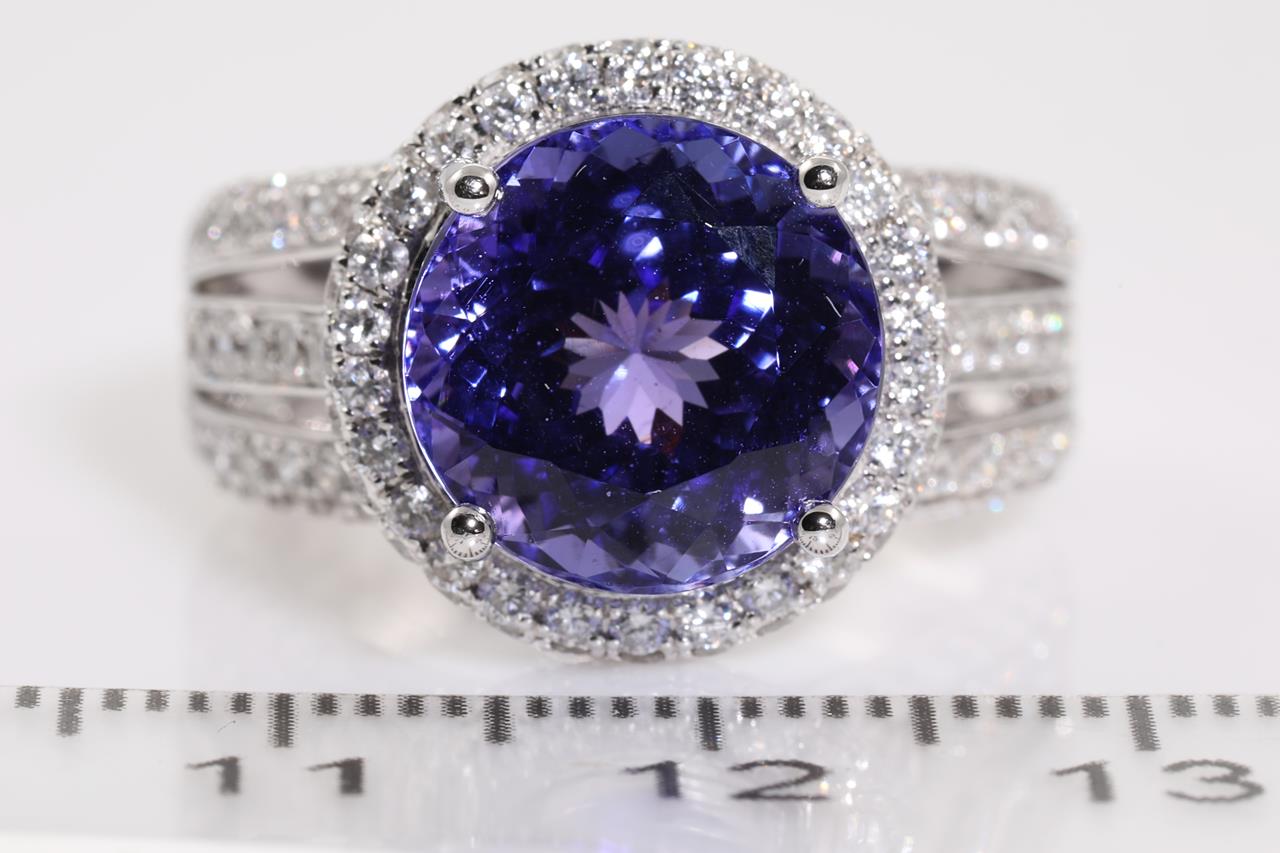 Tanzanite and Diamond ring with a round Tanzanite of 7.29ct and Diamonds totalling 1.59cts (Estimated grading: G-H SI). 14ct white gold. Ring size N - ring resizing is not recommended. Weight: 10.2g. With certificate #415056. (As new)