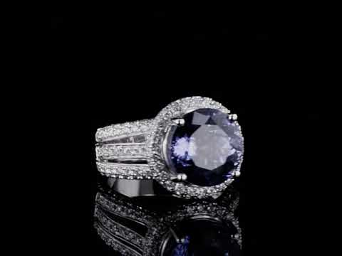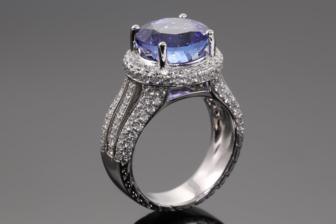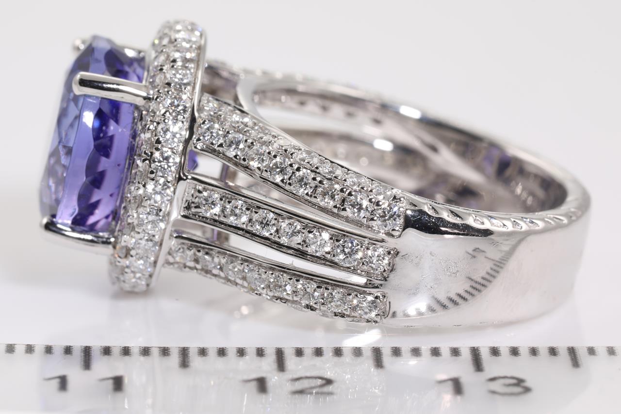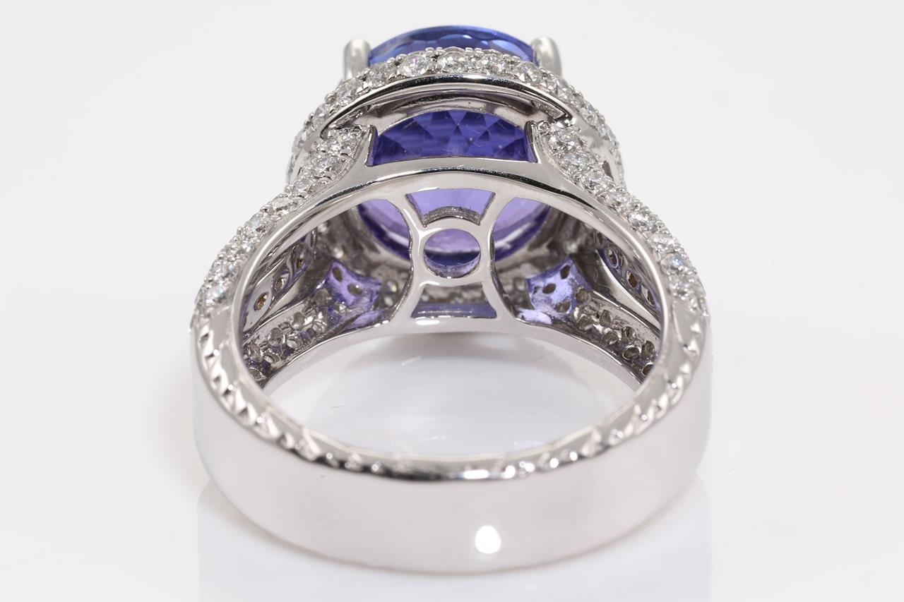 Tanzanite and Diamond ring with a round Tanzanite of 7.29ct and Diamonds totalling 1.59cts (Estimated grading: G-H SI). 14ct white gold. Ring size N - ring resizing is not recommended. Weight: 10.2g. With certificate #415056. (As new)