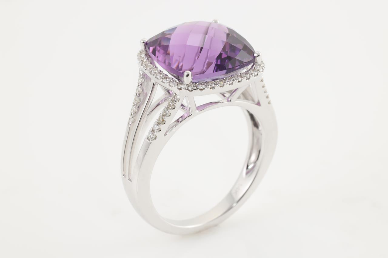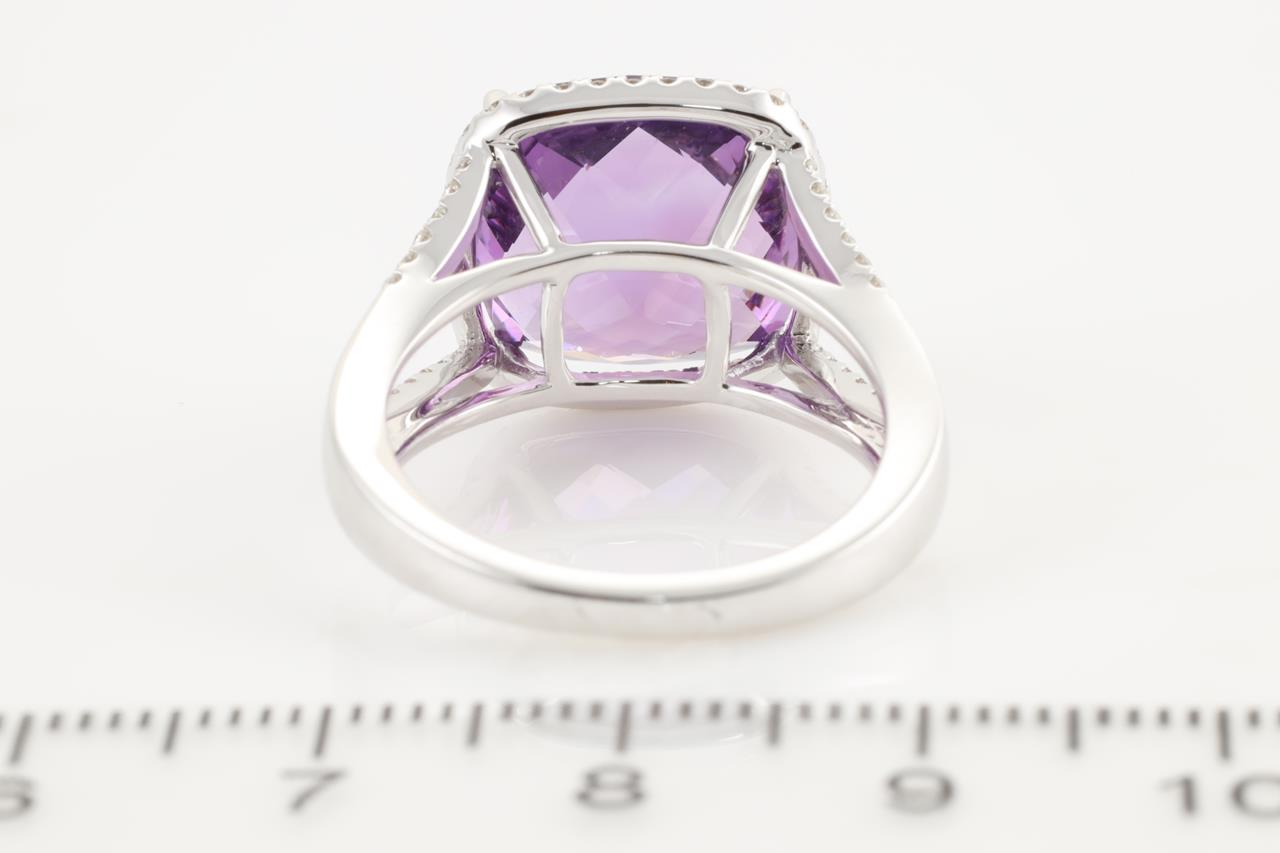 Amethyst and Diamond Ring with cushion checkerboard cut Amethyst of 7.30ct and Diamonds totalling 0.35cts (Estimated grading: H SI). 14ct white gold. Ring size N1/2 - resizing up is not recommended, can only be resized down with ring clip. Weight: 5.7g (New)