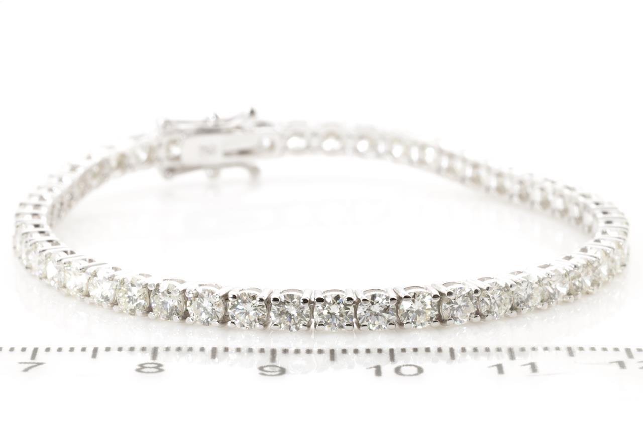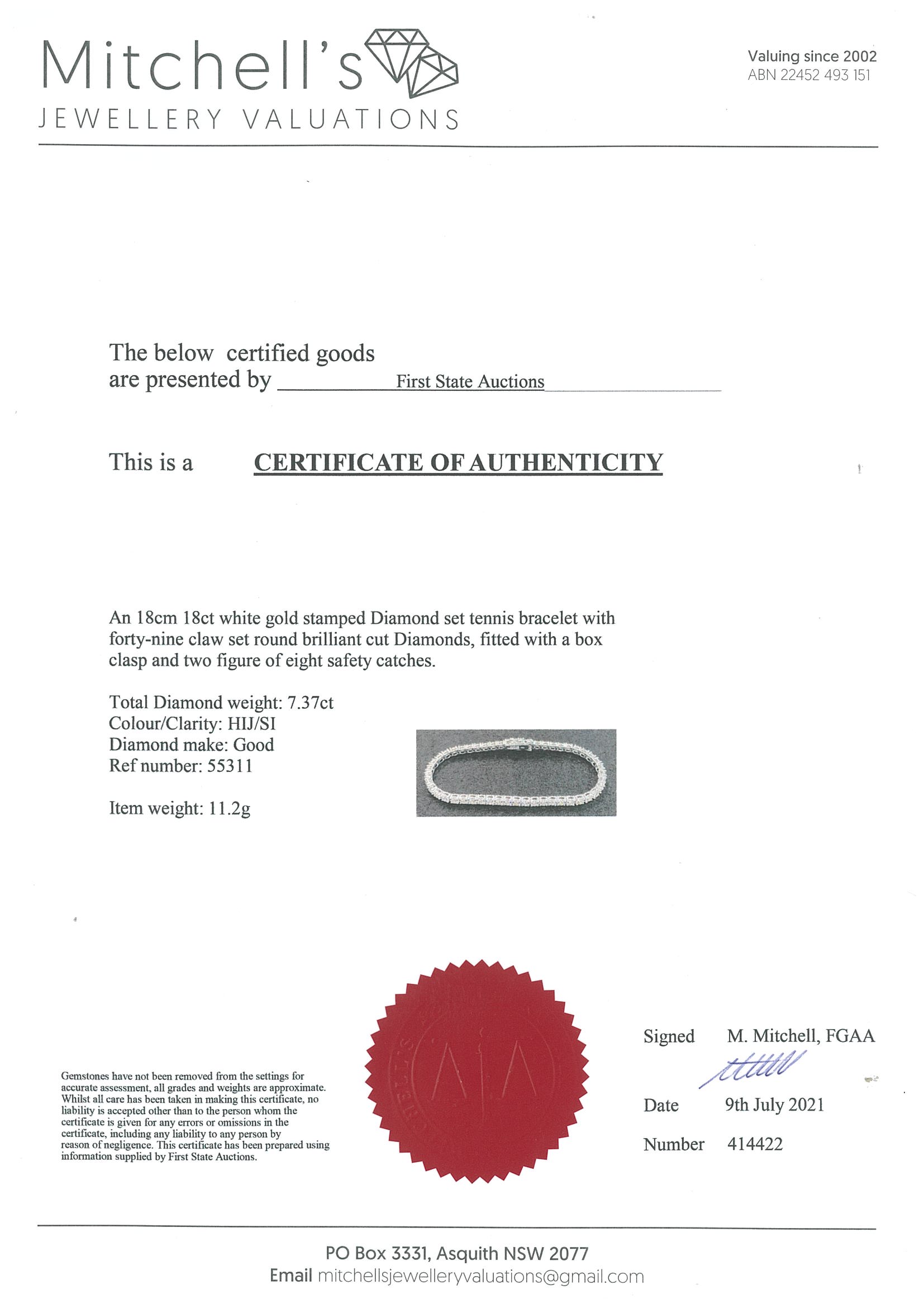 Diamond tennis bracelet with 49 round Diamonds totalling 7.37cts (Estimated grading: HIJ SI). 18ct white gold. Length: 18cm. Weight: 11.2g. With certificate #414422. (New)