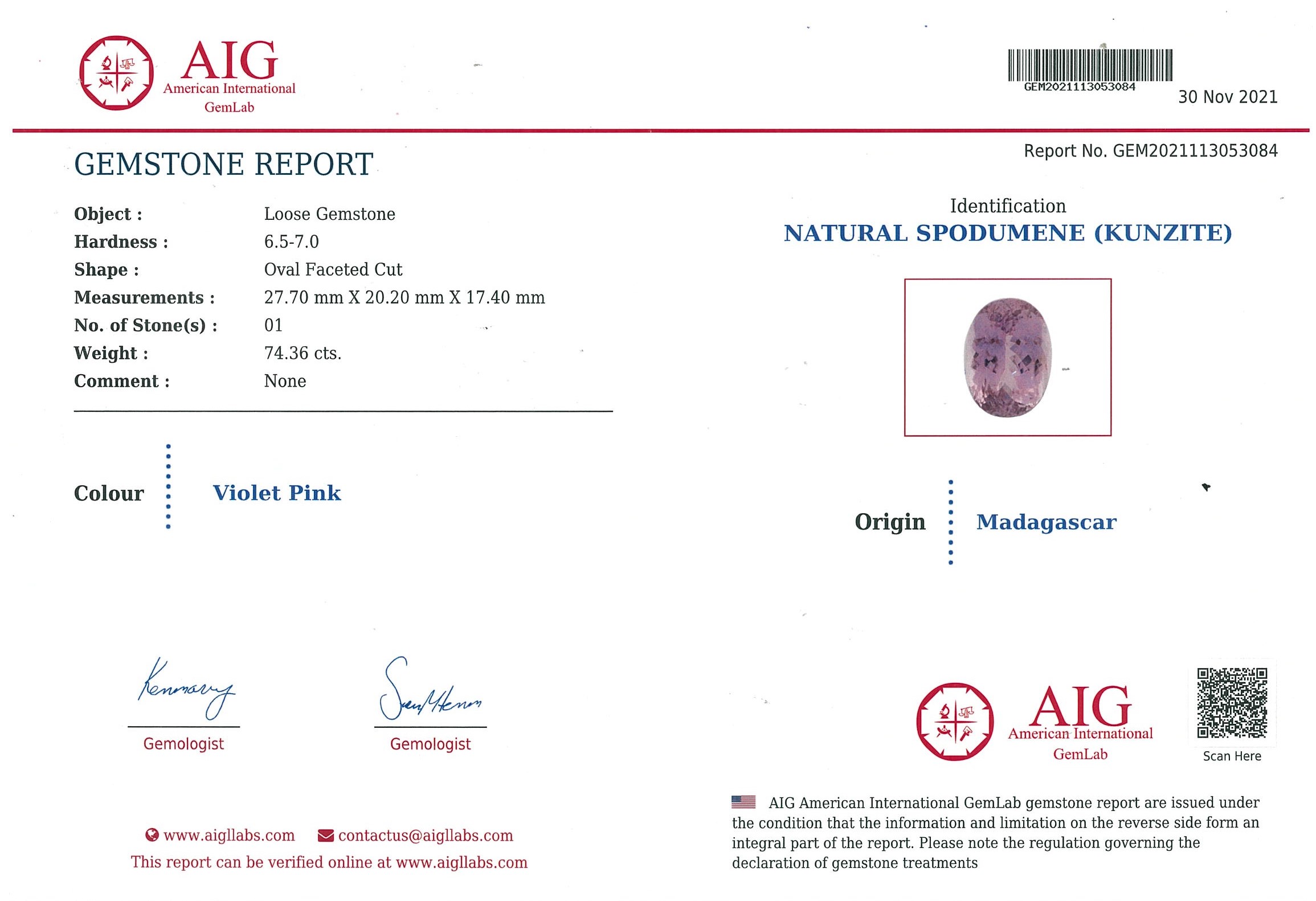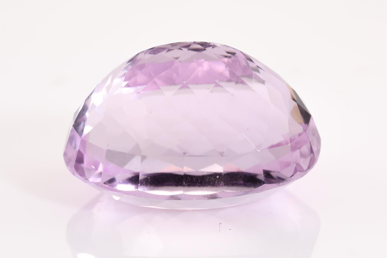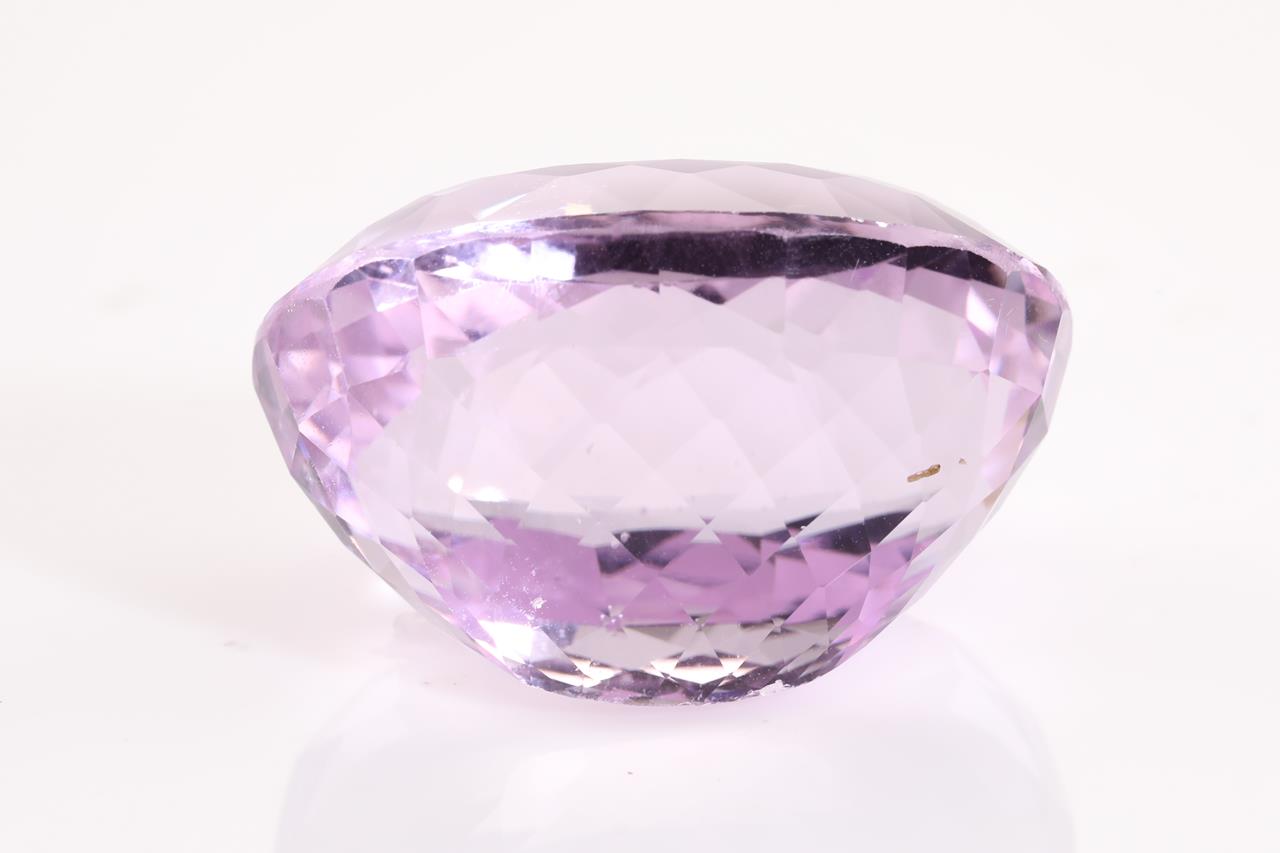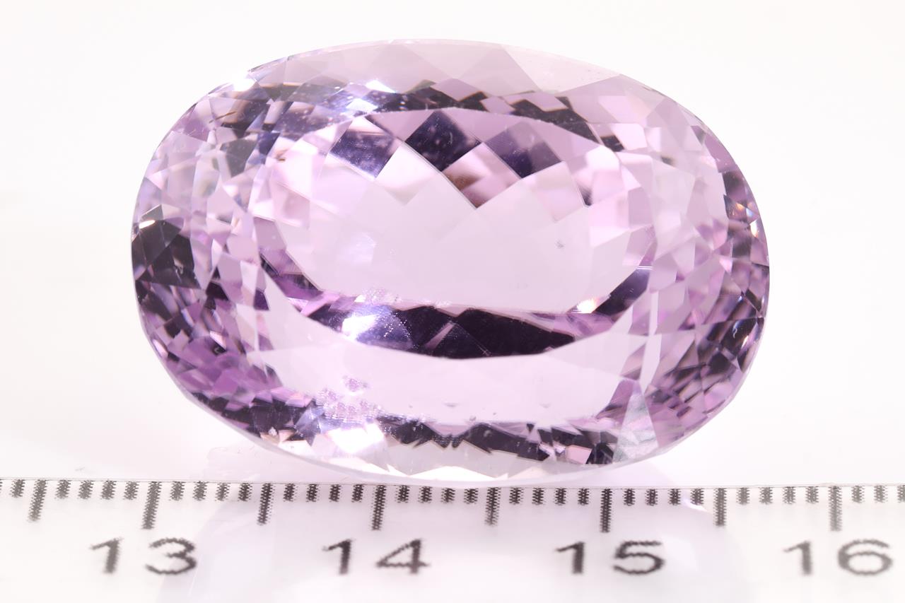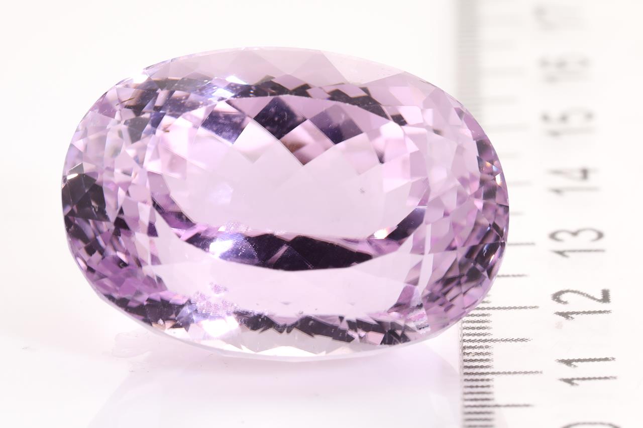 A loose oval cut Kunzite of 74.36ct. Dimensions: 27.7 x 20.2 x 17.4mm. (With AIG report GEM2021113053084). (As New)